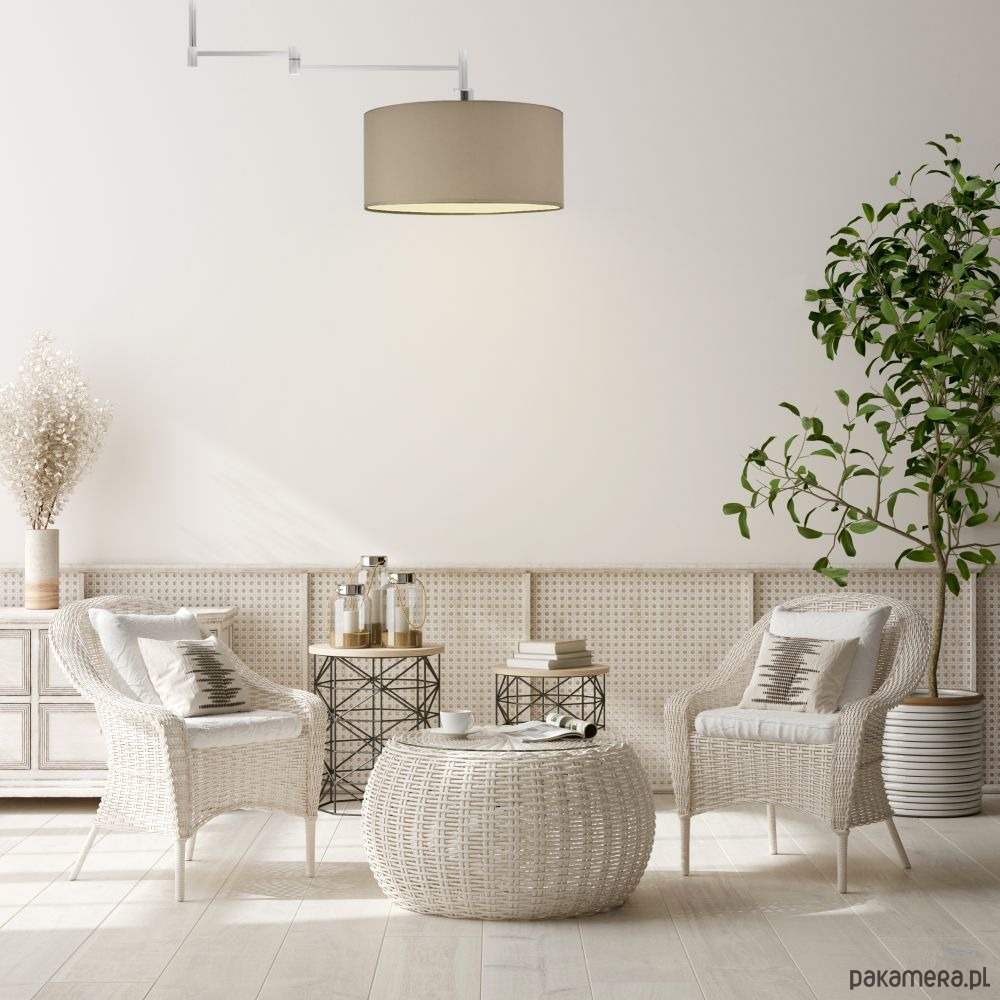 Materiał: stelaż - elementy metalowe, abażur - holenderska tkanina tekstylna podklejona na folii PVC