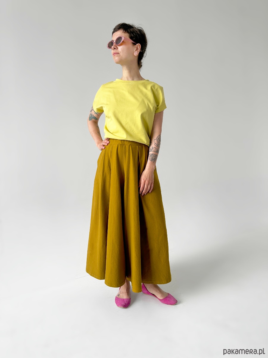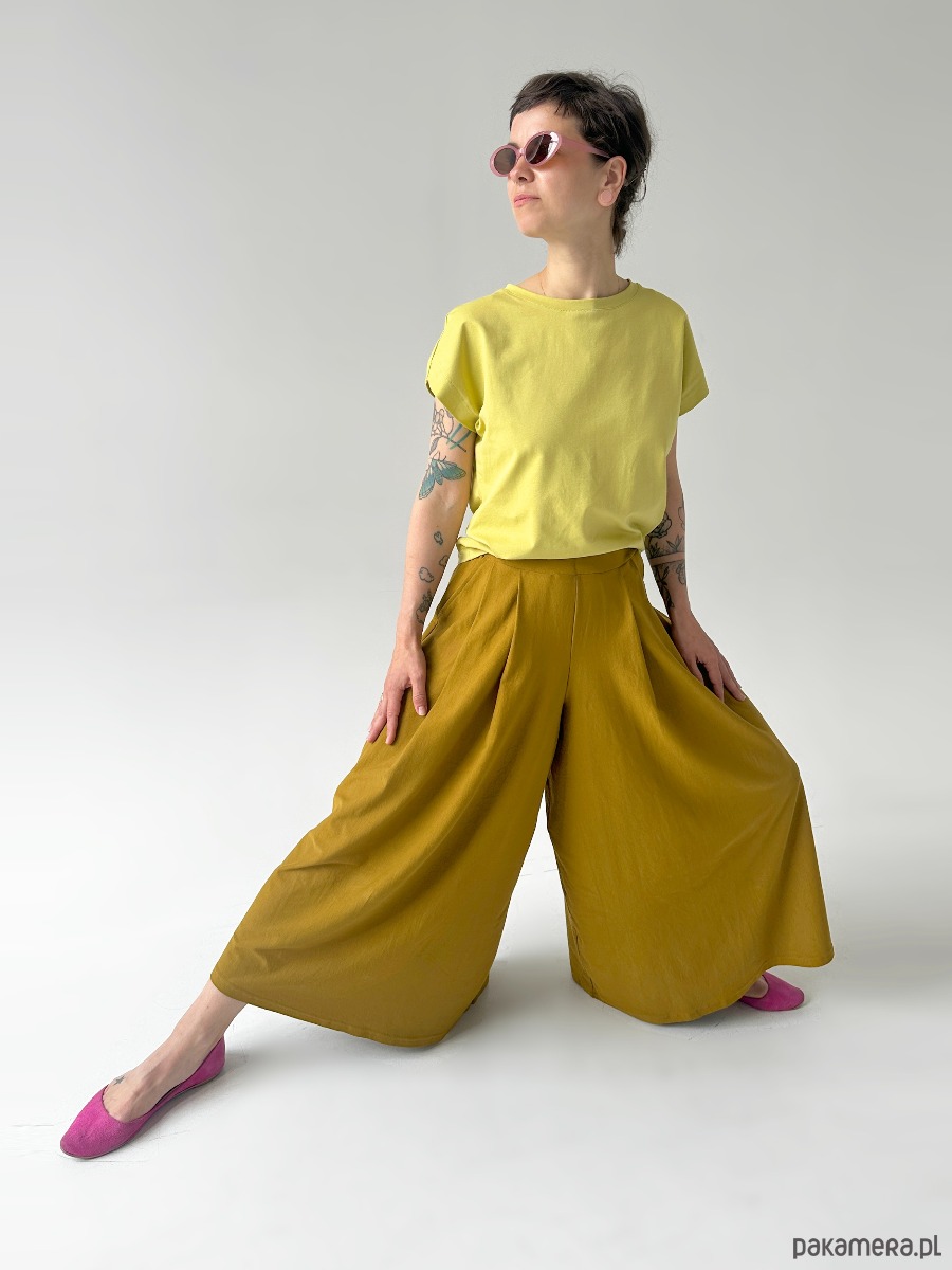 Szerokie nogawki układają się zwiewnie jak spódnica. Jednocześnie zachowują funkcjonalność klasycznych spodni. To model idealny do aktywnego stylu życia. Sprawdzi się na spacerze, rowerze, podczas codziennych obowiązków czy spotkań z przyjaciółmi.