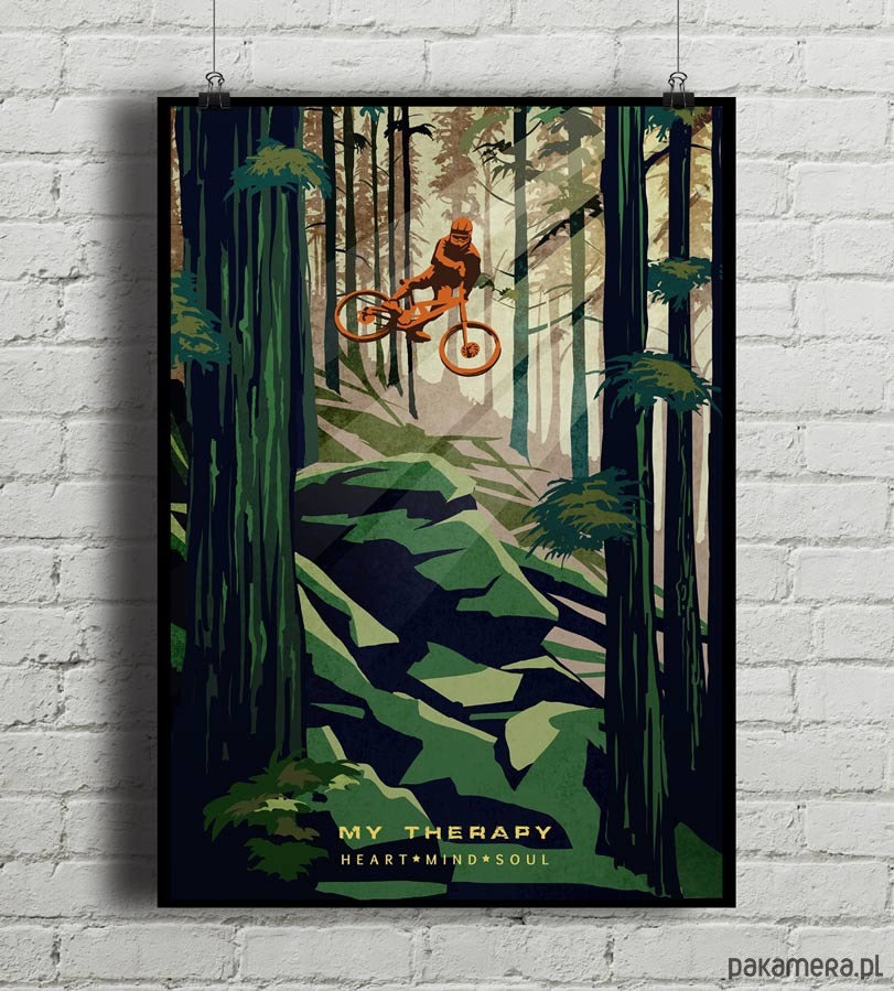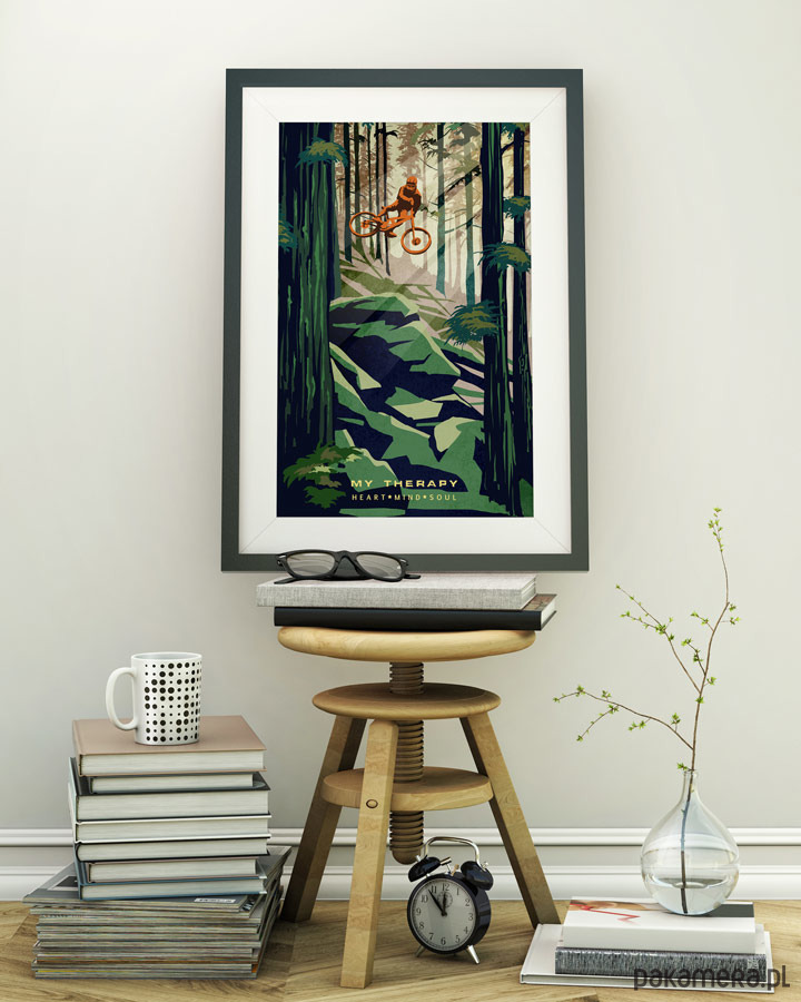 Plakat w stylu vintage inspirowany kolarstwem górskim (MTB). Napis w dolnej części z tekstem "My Therapy - Heart - Mind - Soul".