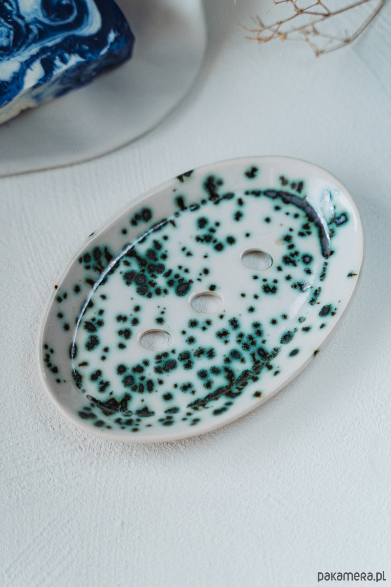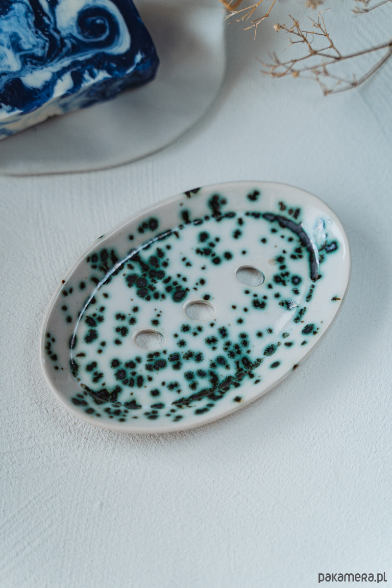 Ceramiczna mydelniczka wykonana ręcznie z jasnej gliny, pokryta błyszczącym szkliwem.