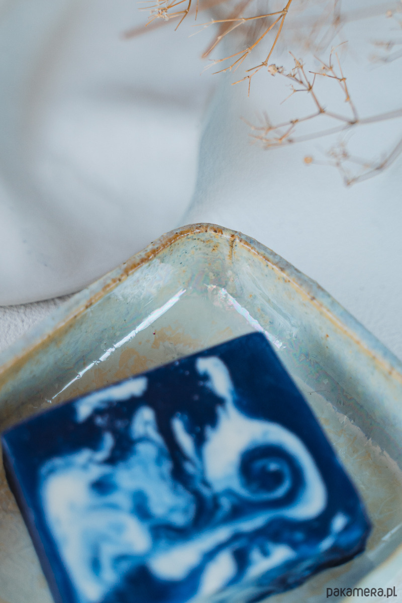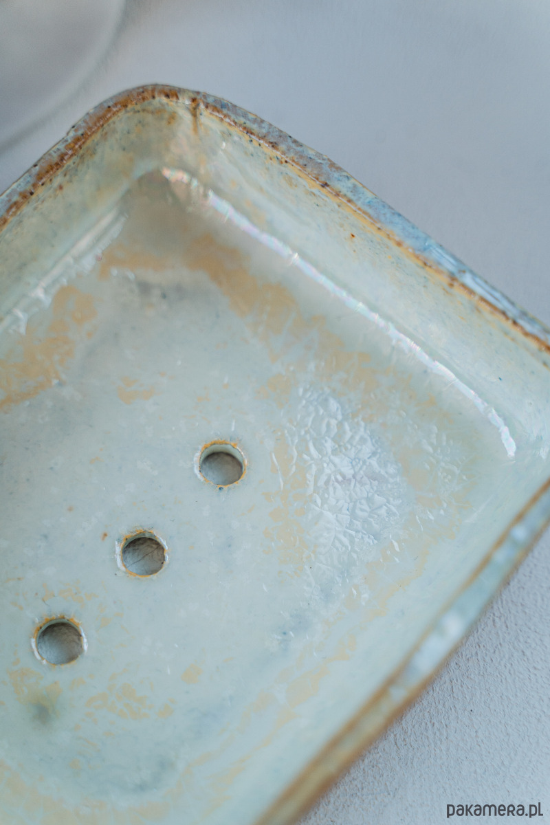 Ceramiczna mydelniczka wykonana ręcznie z jasnej gliny, pokryta błyszczącym szkliwem.