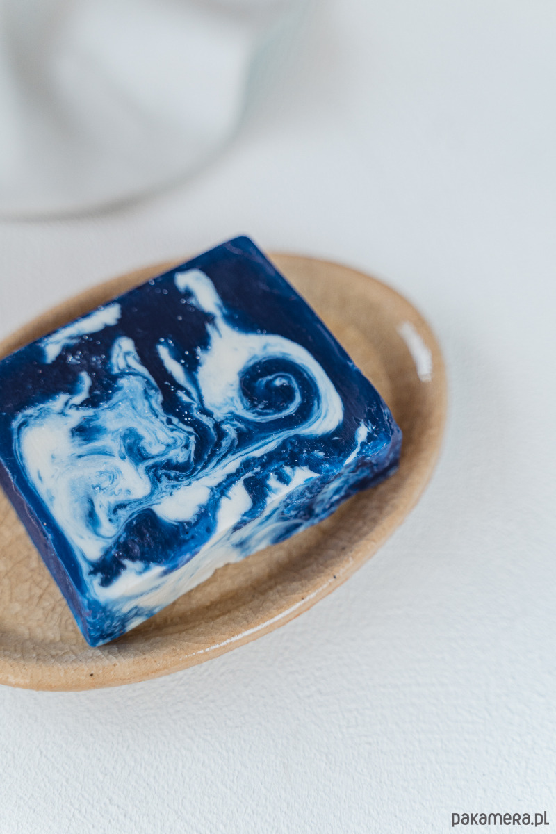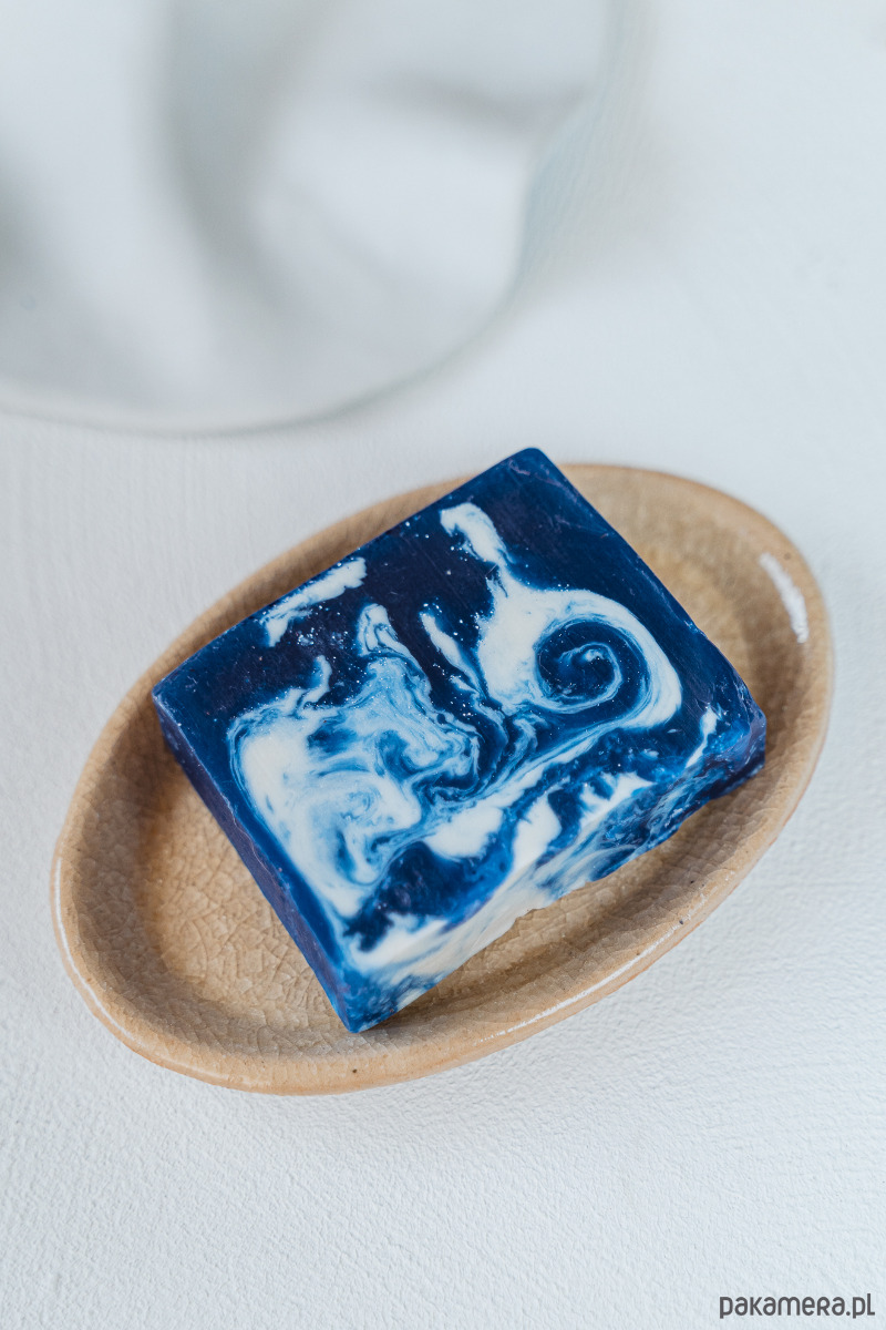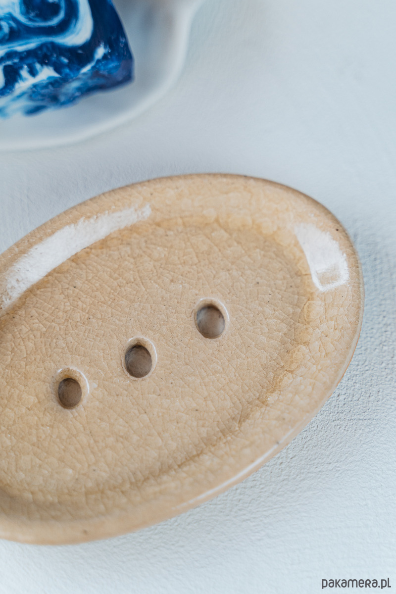 Ceramiczna mydelniczka wykonana ręcznie z jasnej gliny, pokryta błyszczącym szkliwem.