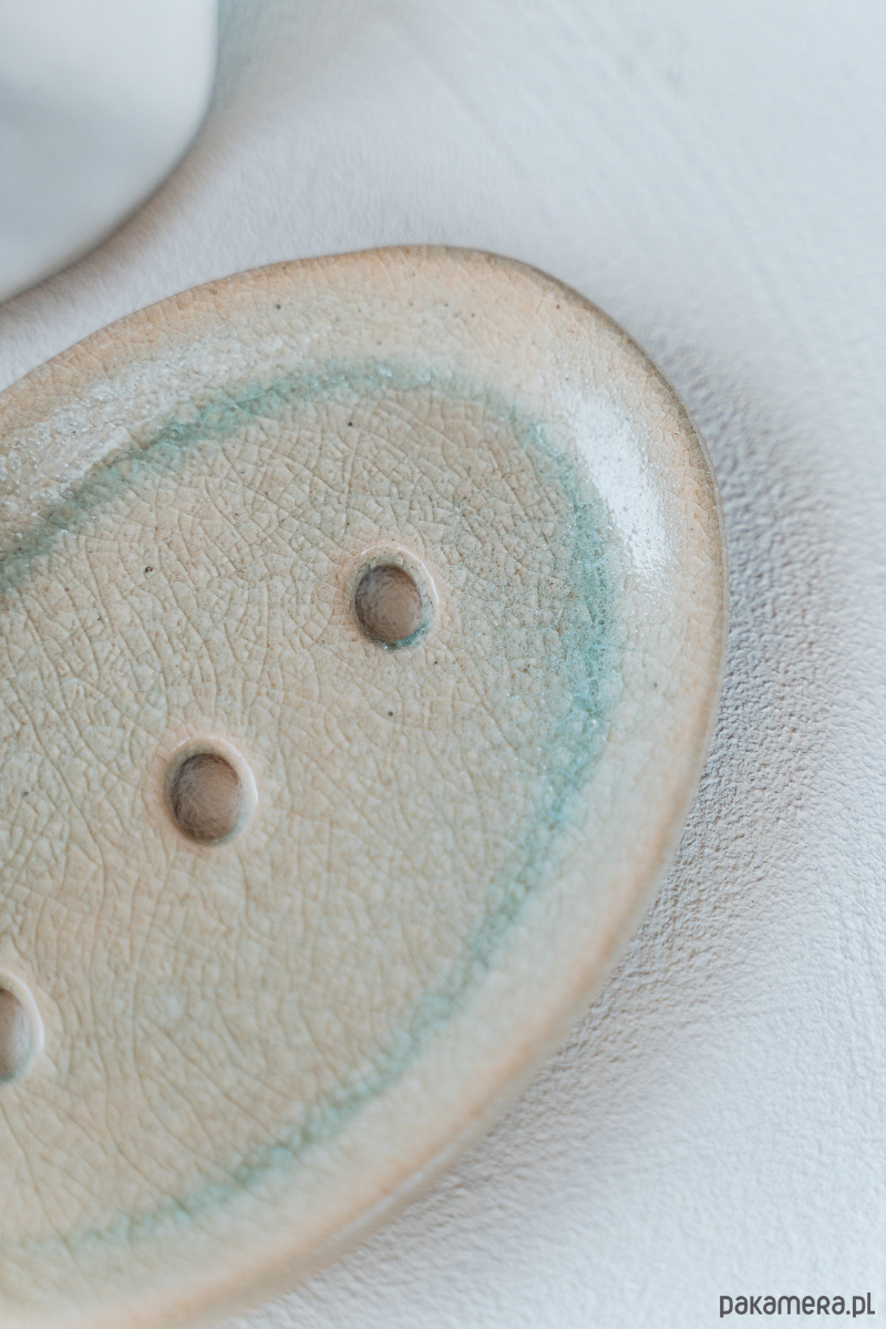 Ceramiczna mydelniczka wykonana ręcznie z jasnej gliny, pokryta błyszczącym szkliwem.