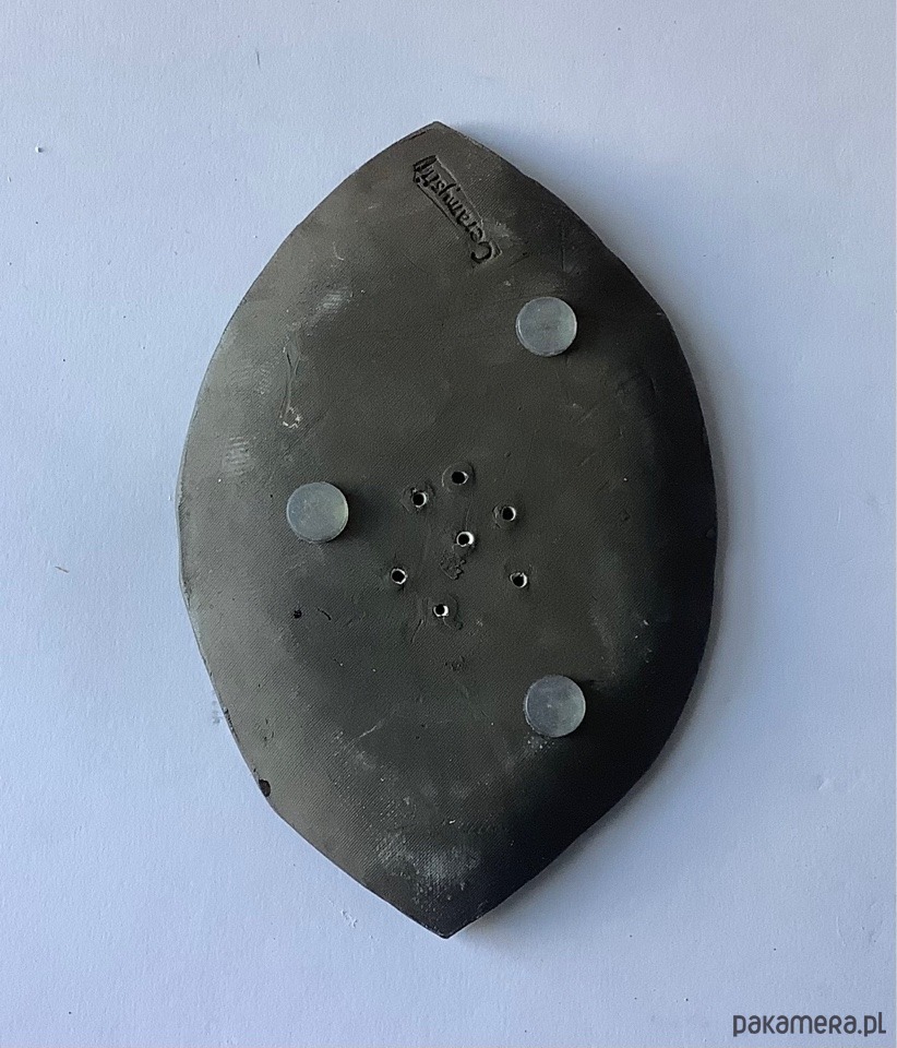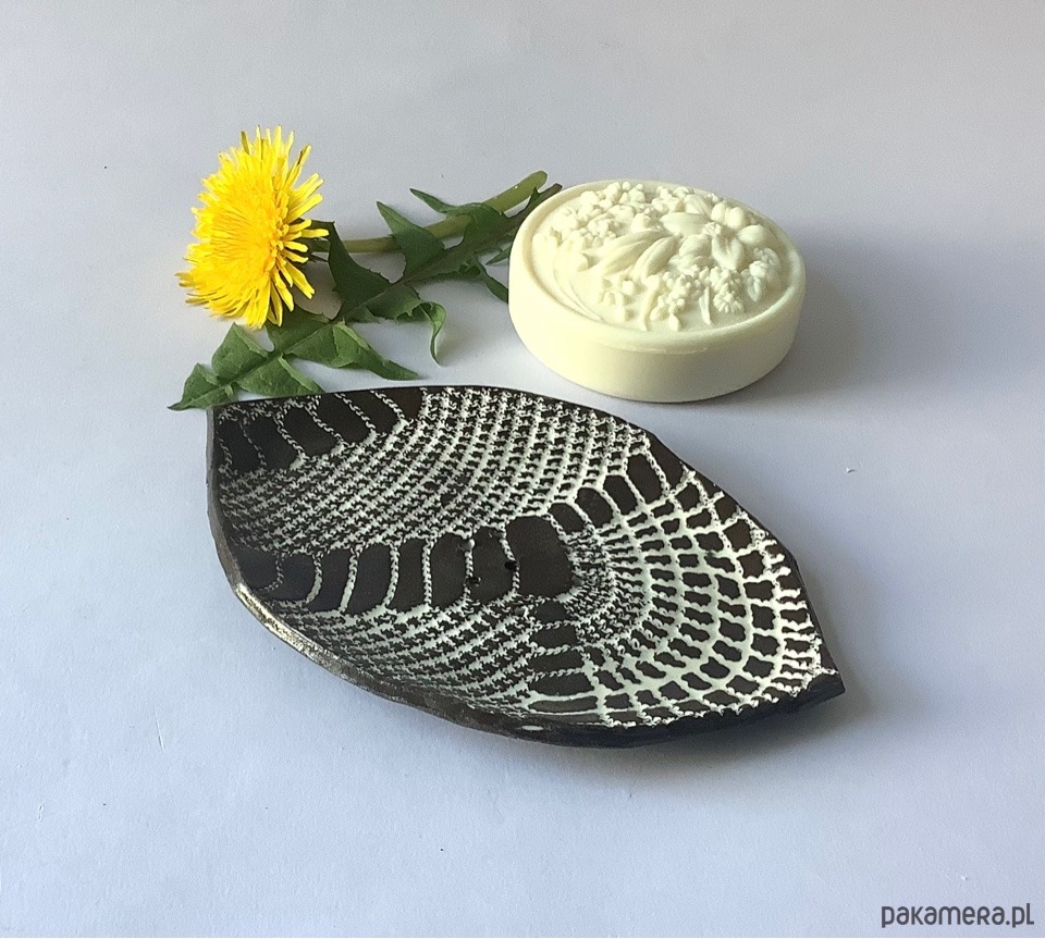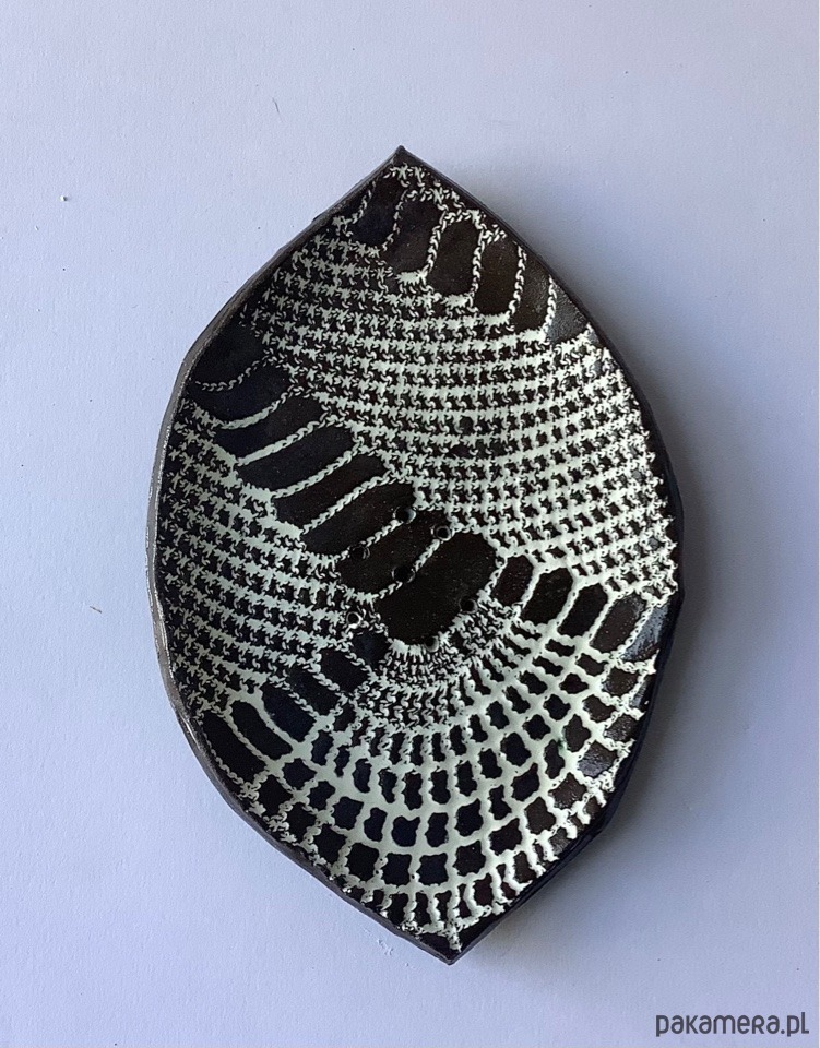 Duża mydelniczka w kształcie migdału, zrobiona z ciemnej gliny. na mydelniczce ociśnięty motyw koronki, która została poszkliwiona na biało, a reszta pozostawiona w naturalnym kolorze gliny. Całosć pociągnięta transparentnym szkliwem.