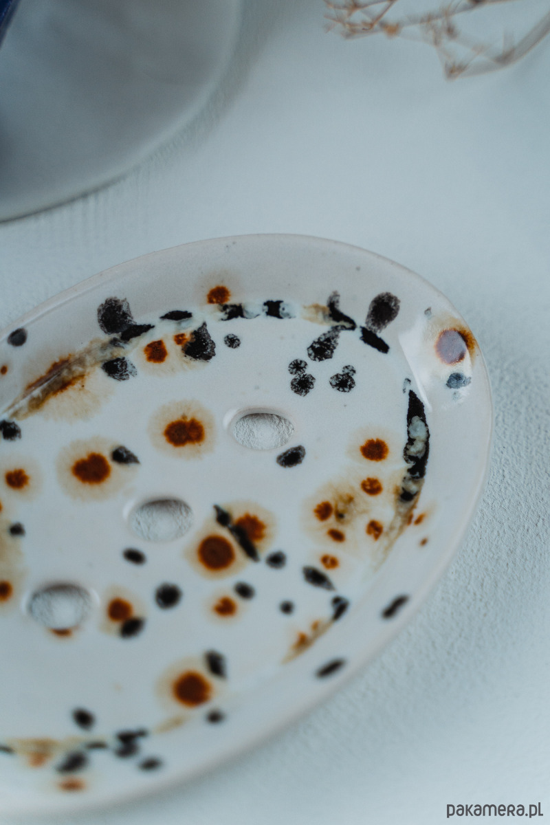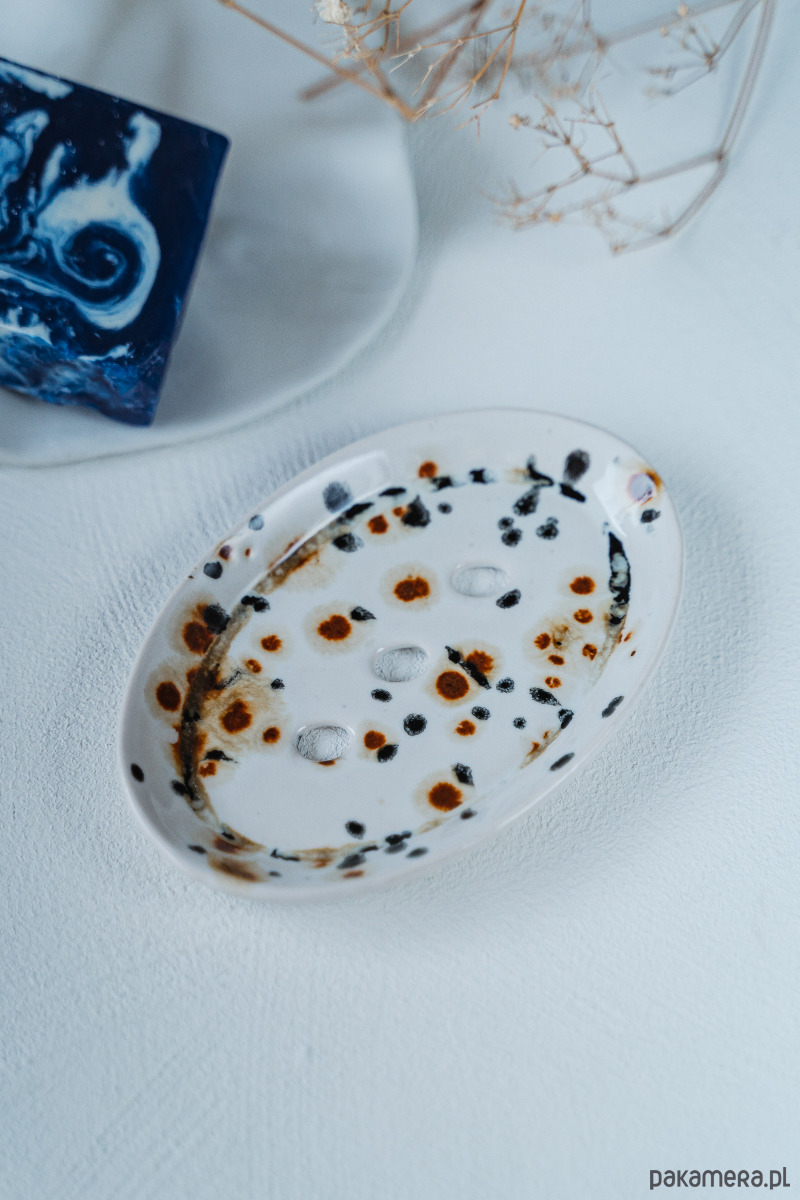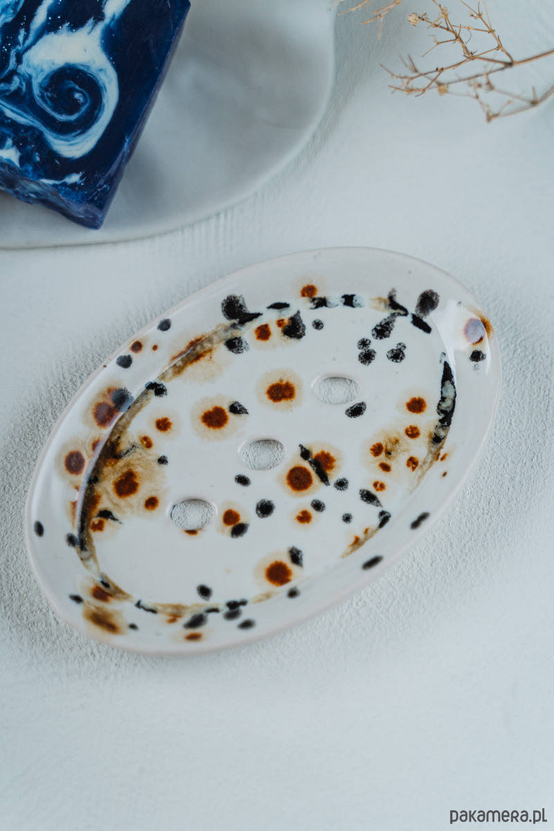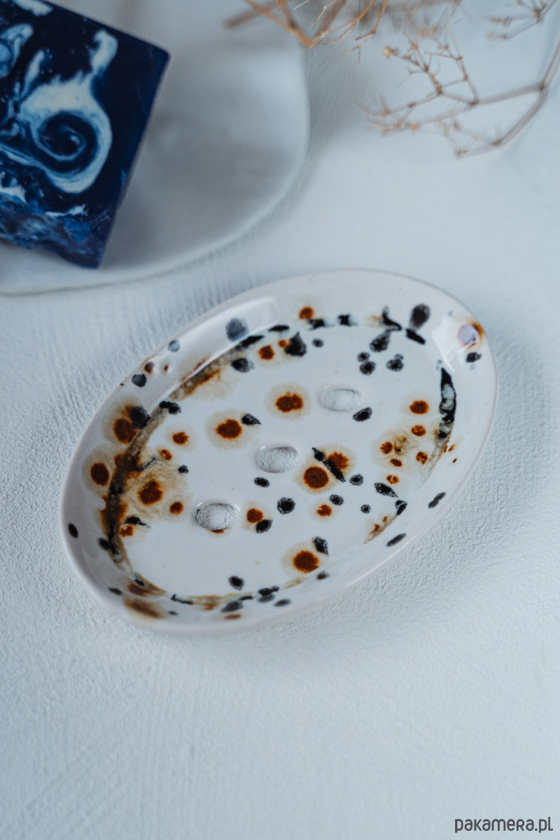 Ceramiczna mydelniczka wykonana ręcznie z jasnej gliny, pokryta błyszczącym szkliwem.