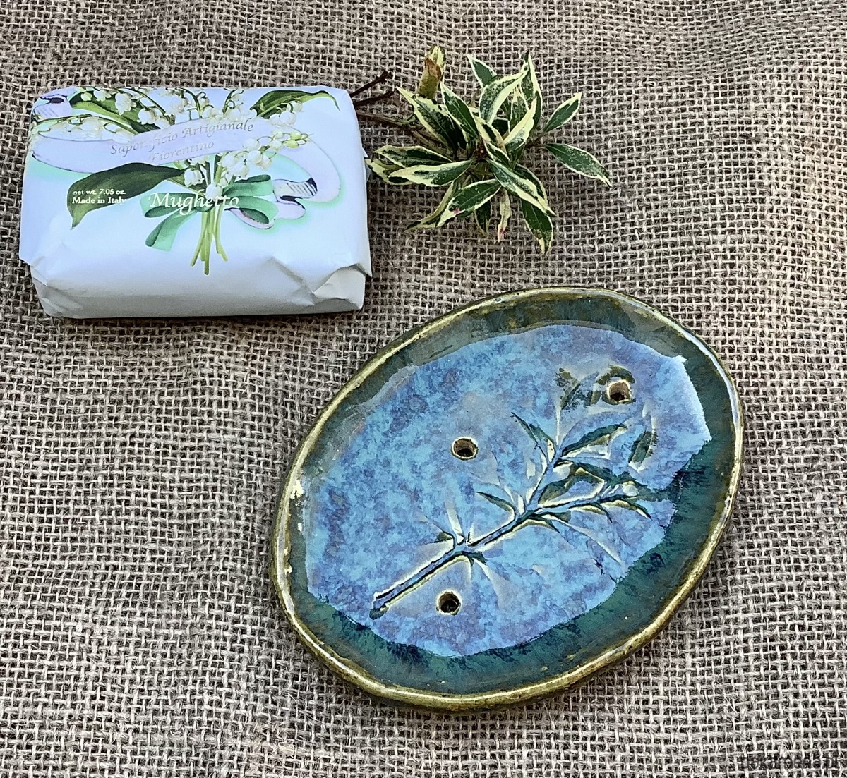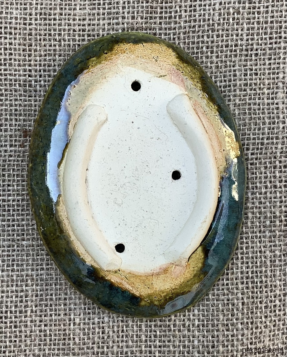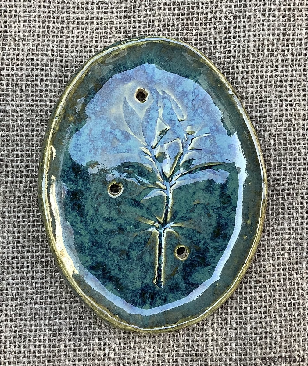 Ręcznie wykonana z jasnej gliny mydelniczka , lekko wgłębiona. Na spodzie gliniane stopki. Mydelniczka została poszkliwiona na transparentny zielony kolor z niebieskimi przebłyskami. Na mydelniczce odciśnięta jest roślina. W mydelniczce są dziurki umożliwiające odpływ nadmiaru wody.