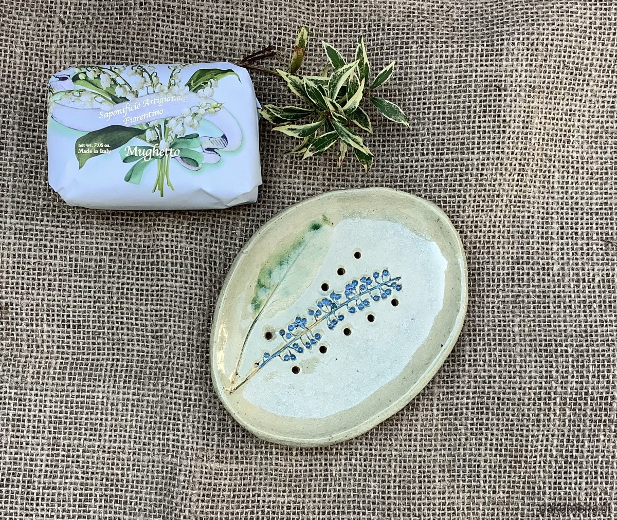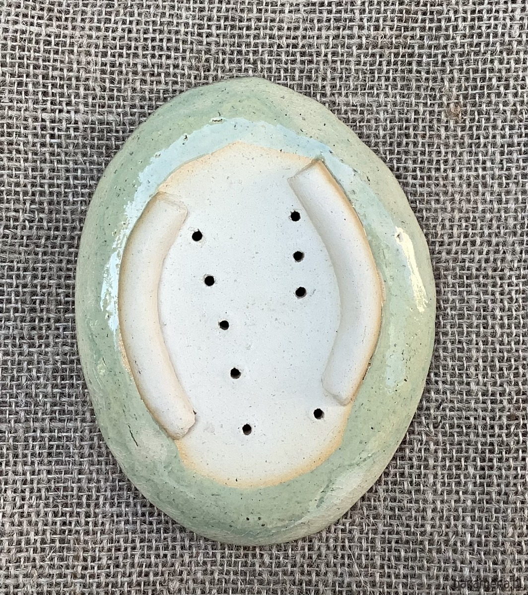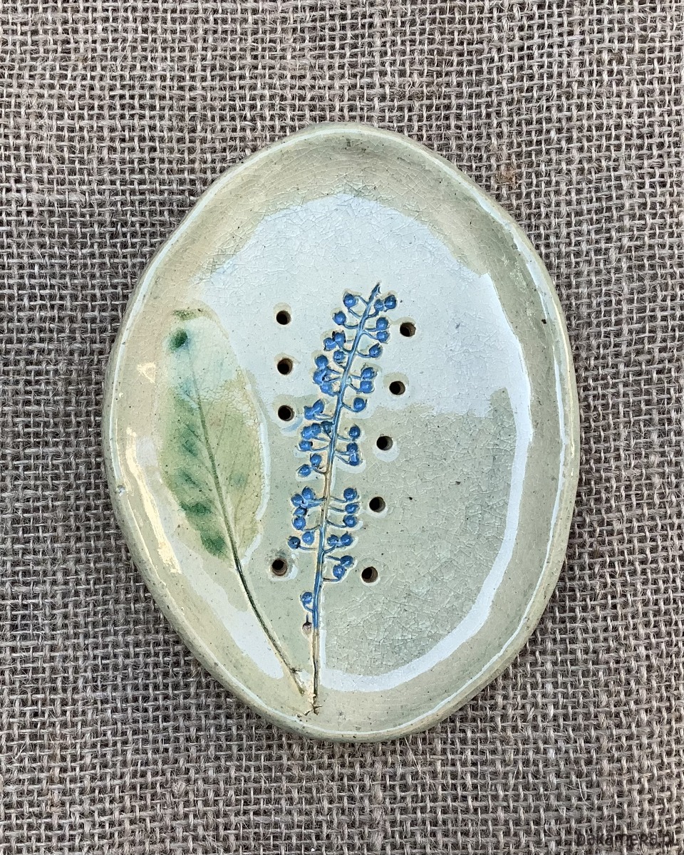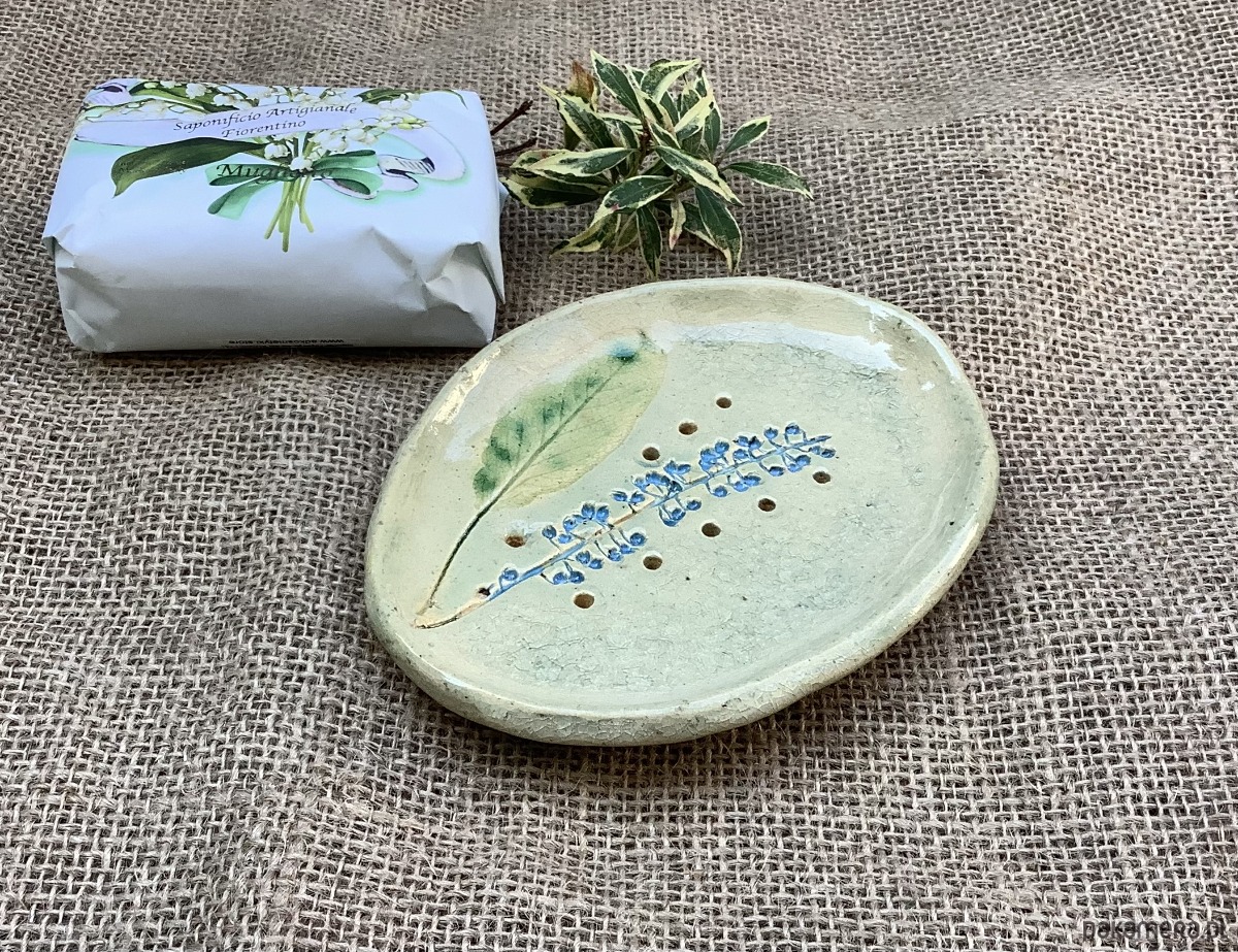 Ręcznie wykonana z jasnej gliny mydelniczka , lekko wgłębiona. Na spodzie gliniane stopki. Mydelniczka została poszkliwiona na transparentny jasnozielony kolor. Na mydelniczce odciśnięta jest roślina. W mydelniczce są dziurki umożliwiające odpływ nadmiaru wody.