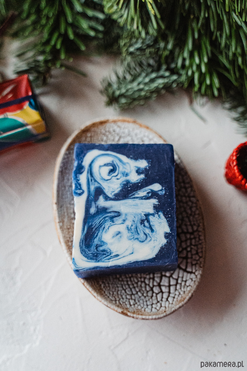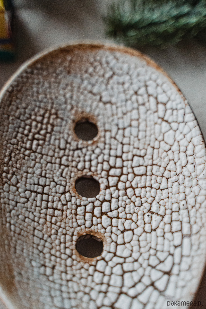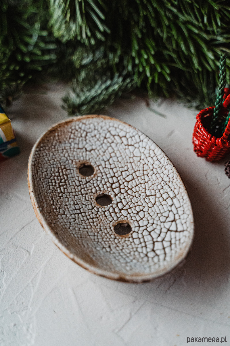 Ceramiczna mydelniczka wykonana ręcznie z wielokolorowej gliny, pokryta błyszczącym szkliwem.