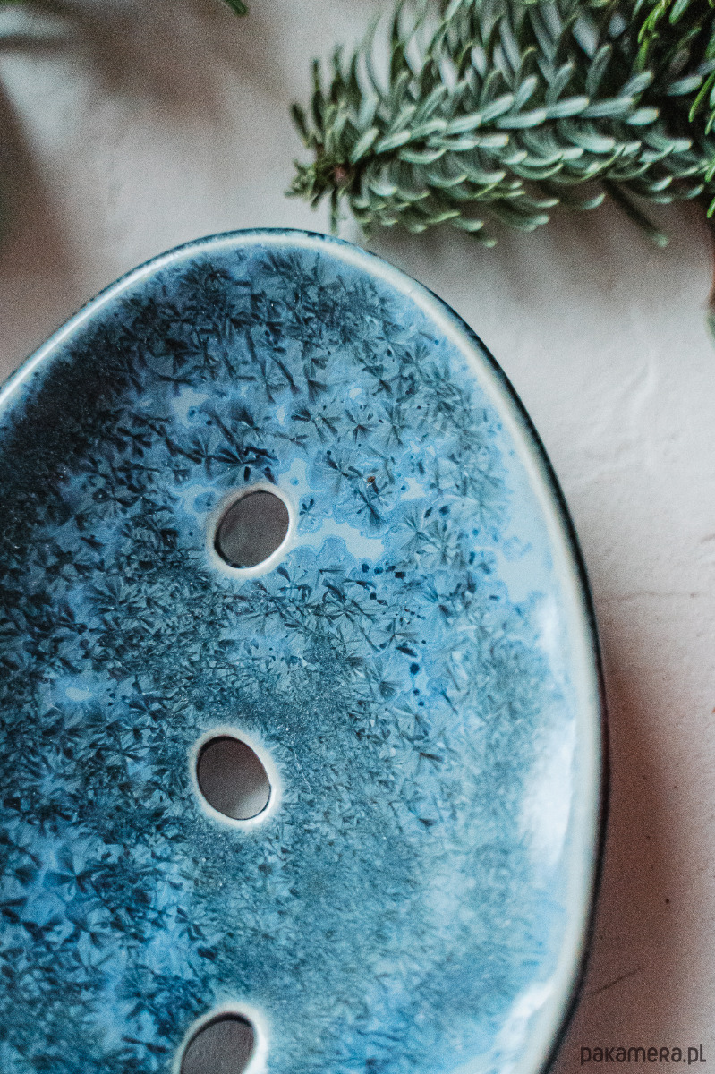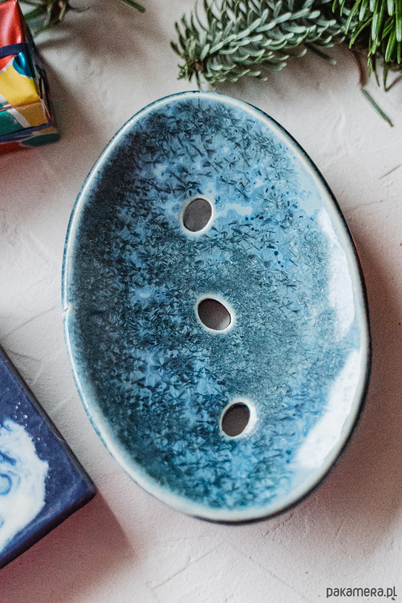 Ceramiczna mydelniczka wykonana ręcznie z jasnej gliny, pokryta błyszczącym szkliwem.