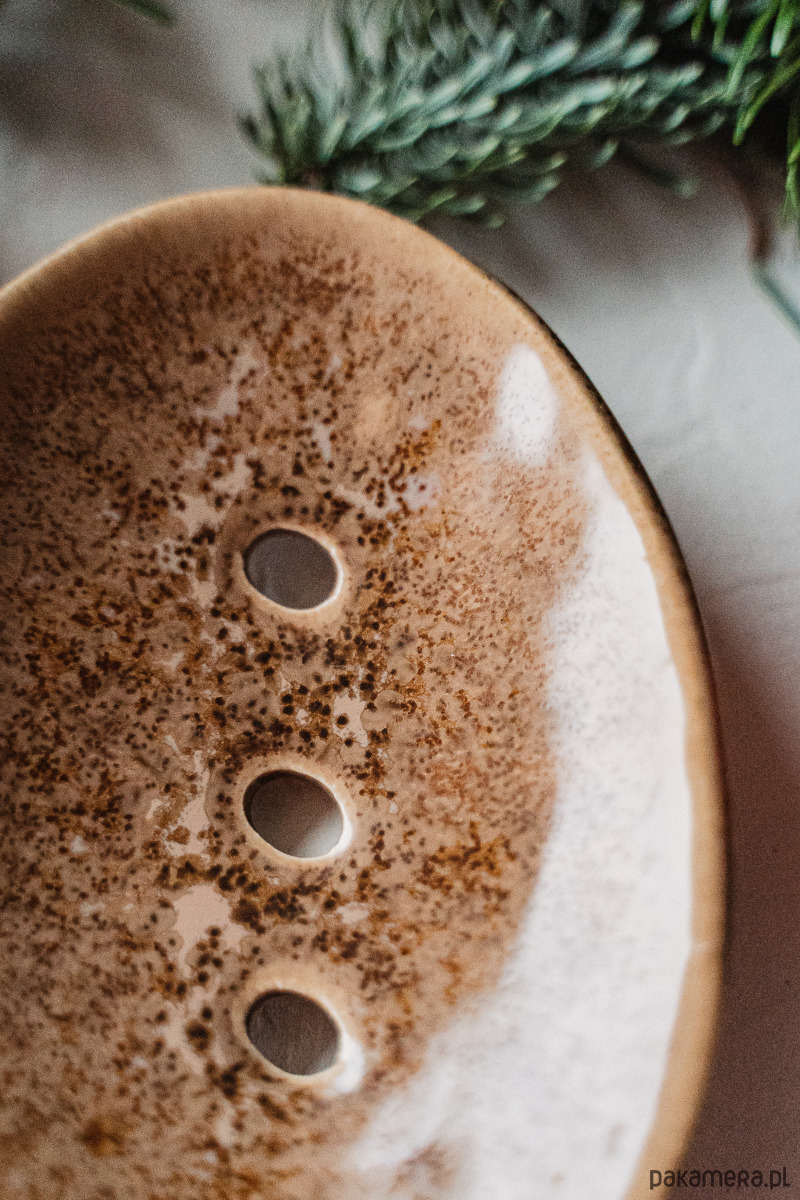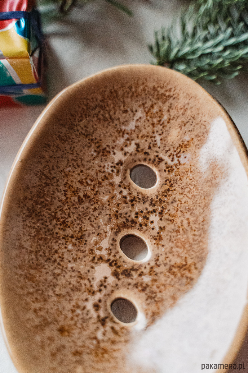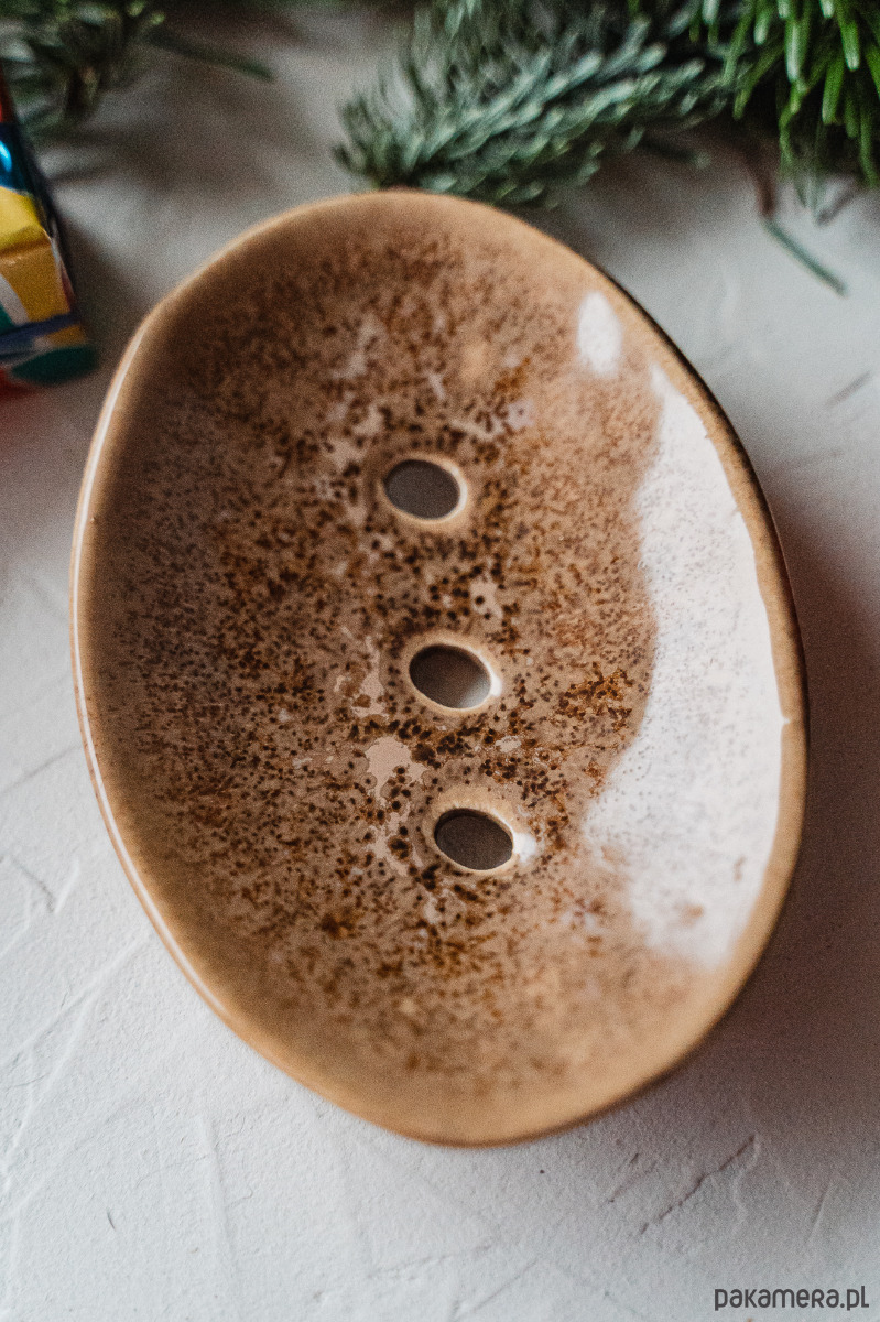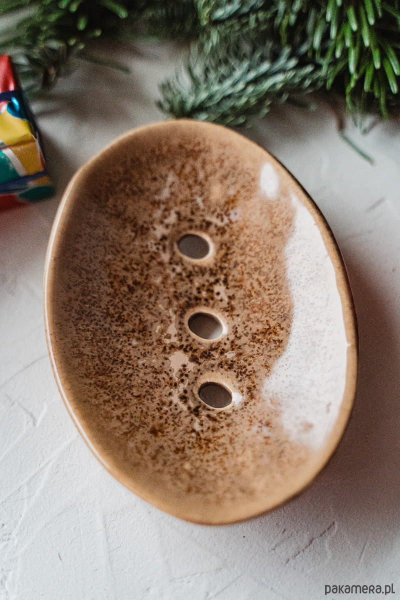 Ceramiczna mydelniczka wykonana ręcznie z jasnej gliny, pokryta błyszczącym szkliwem.
