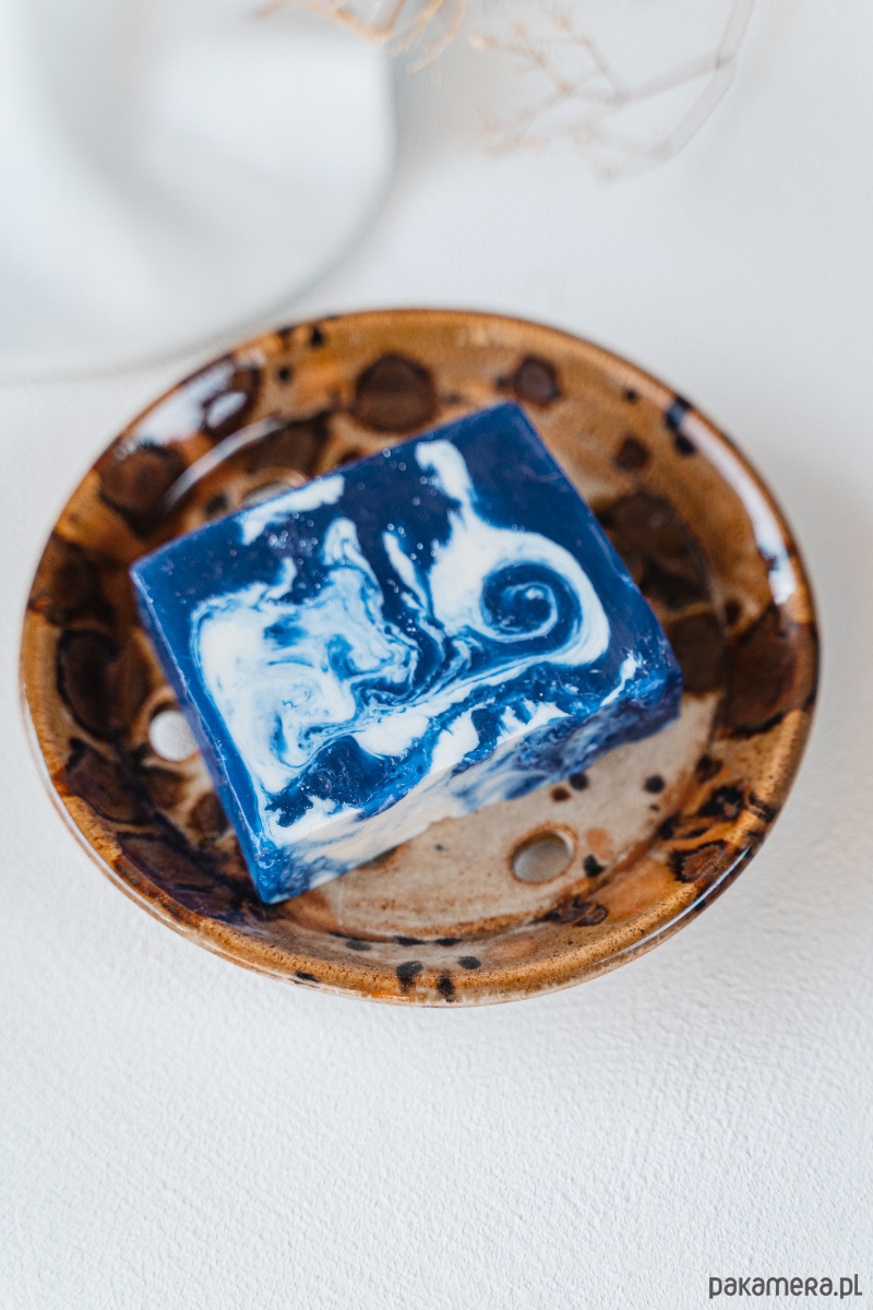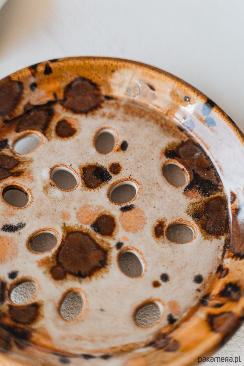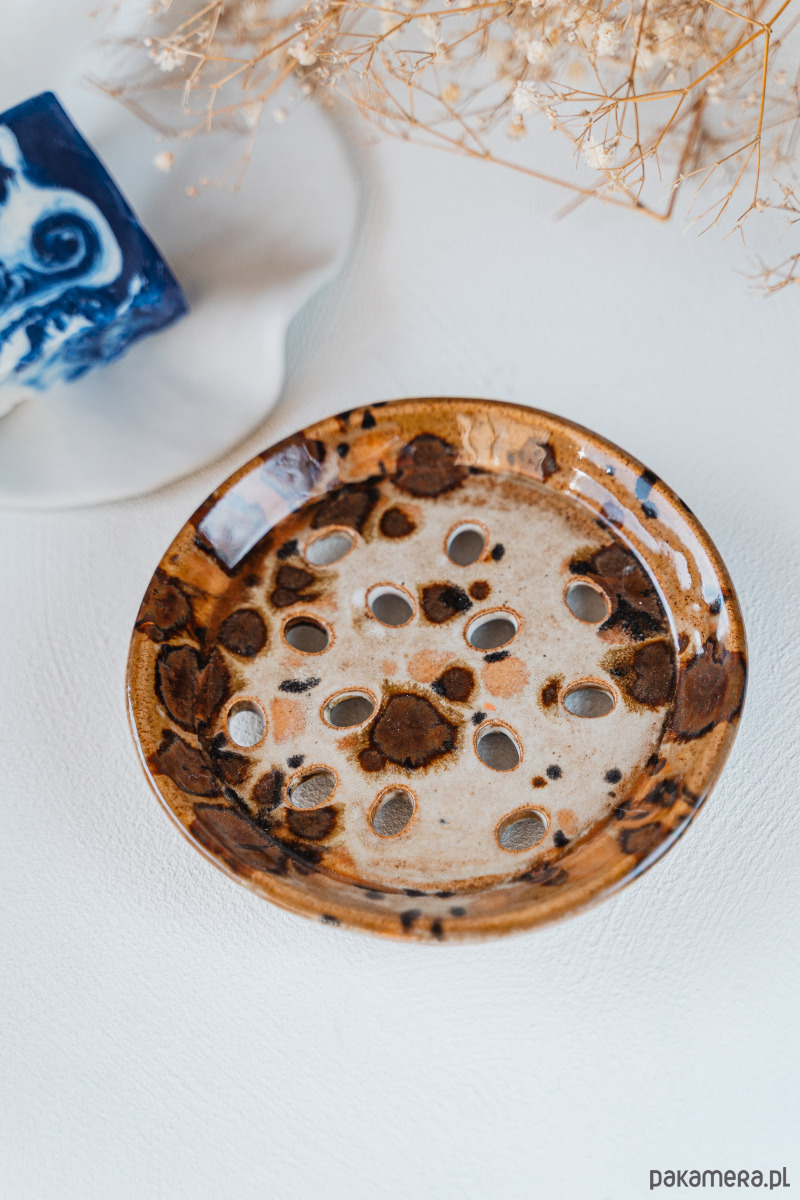 Ceramiczna mydelniczka wykonana ręcznie z jasnej gliny, pokryta błyszczącym szkliwem.
