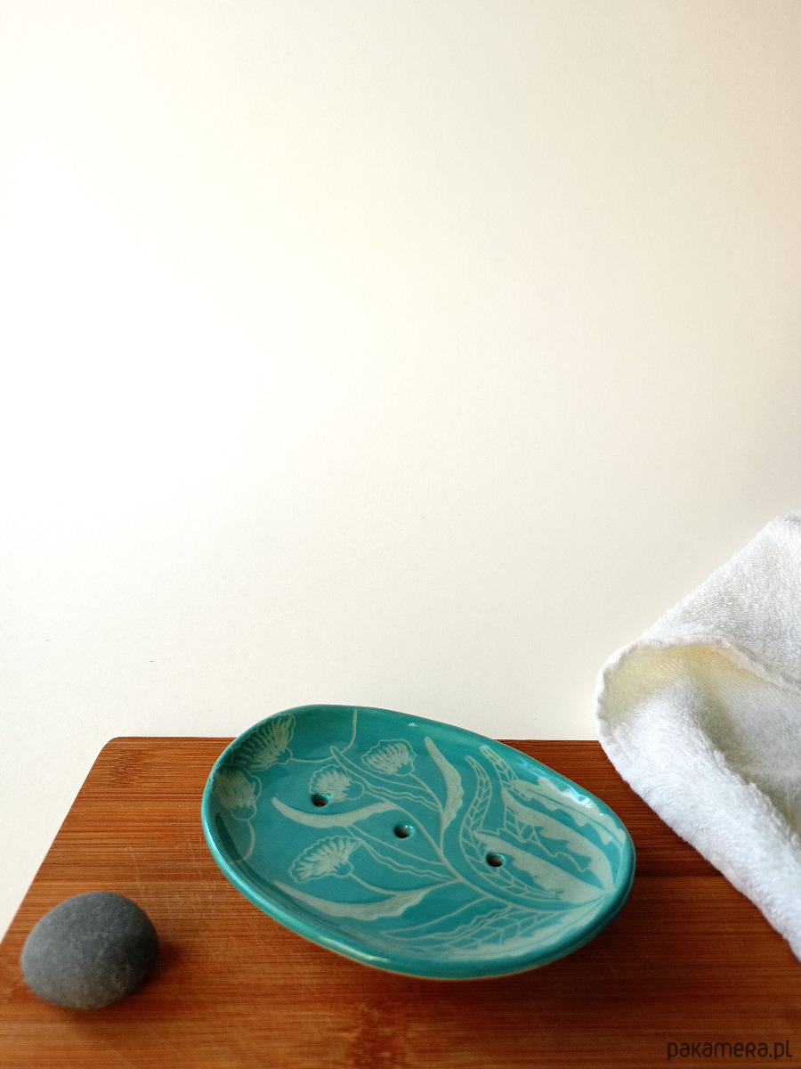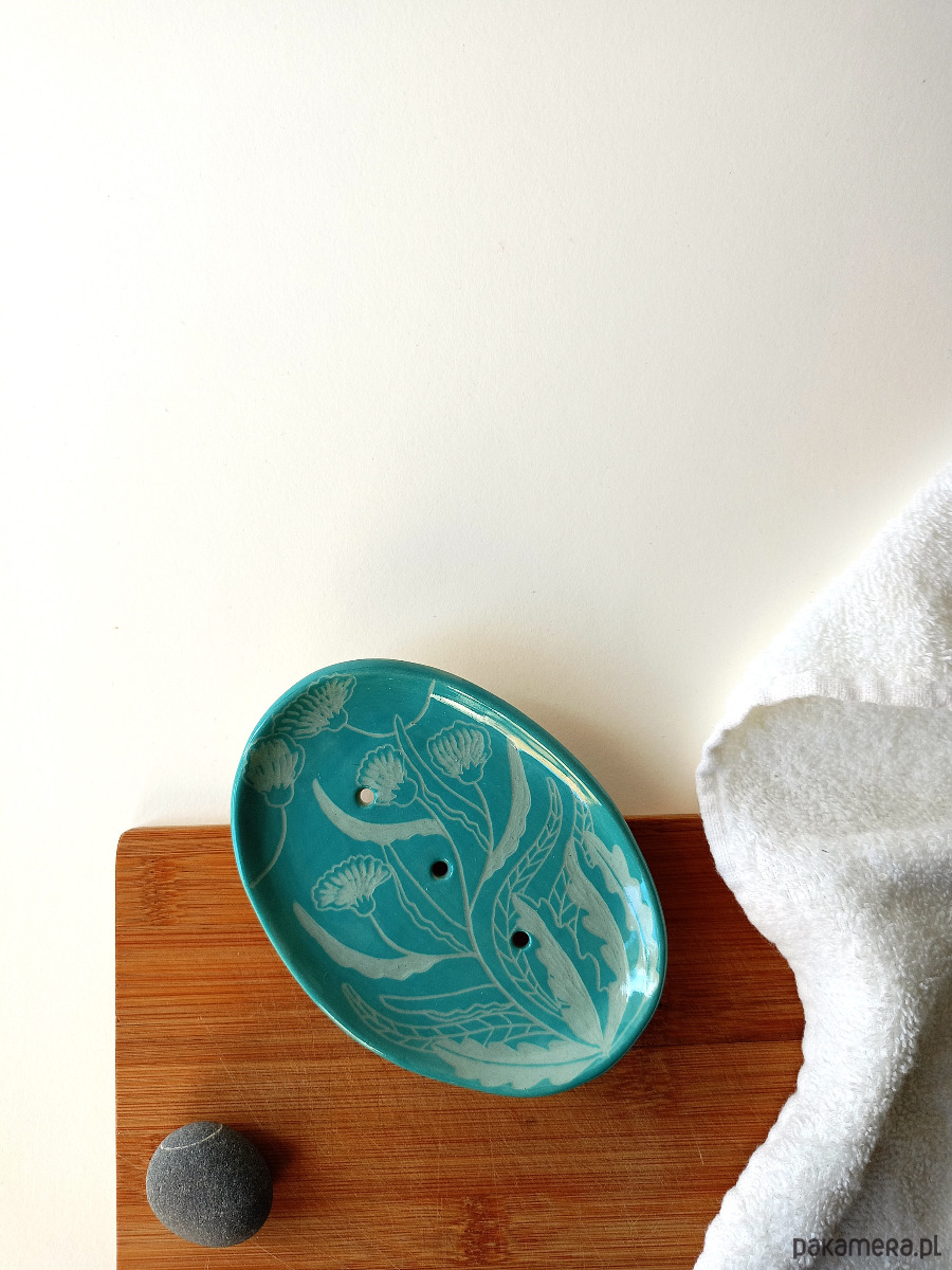 Roślinny wzór na mydelniczce jest w kolorze turkusu i jasnego błękitu i wykonany jest w technice rycia wzoru bezpośrednio w glinie - jest trwały i niepowtarzalny!