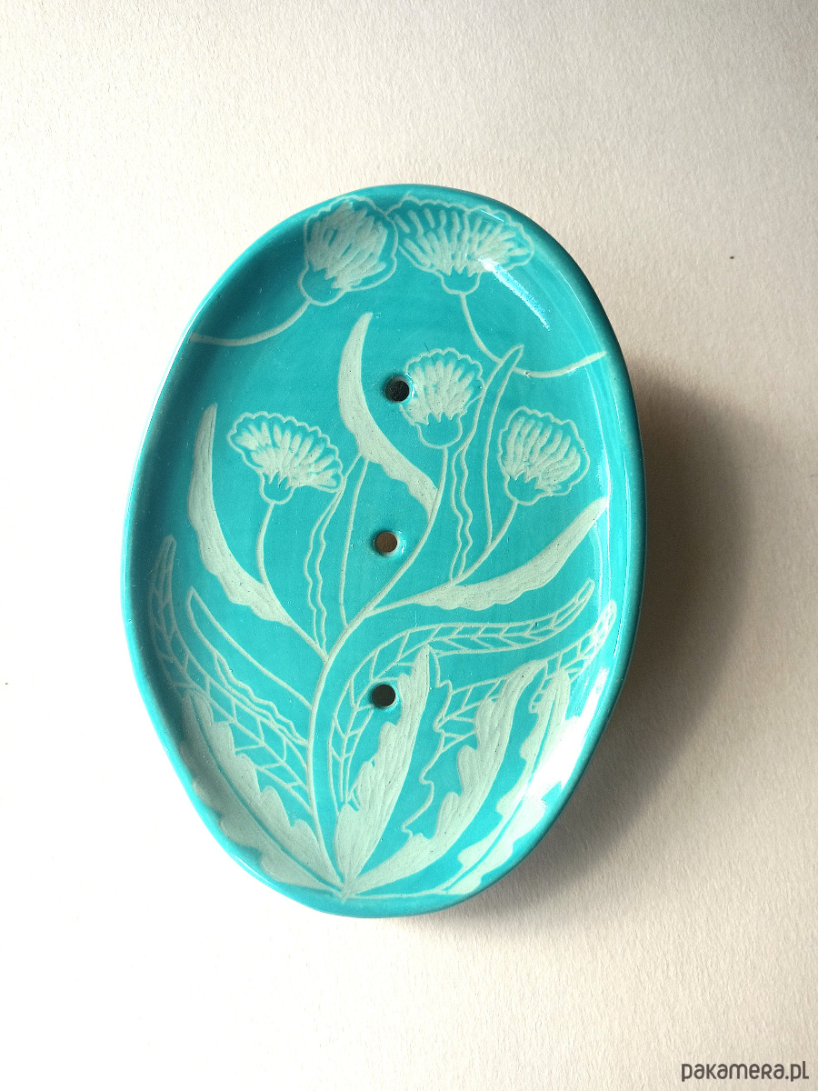 Roślinny wzór na mydelniczce jest w kolorze turkusu i jasnego błękitu i wykonany jest w technice rycia wzoru bezpośrednio w glinie - jest trwały i niepowtarzalny!