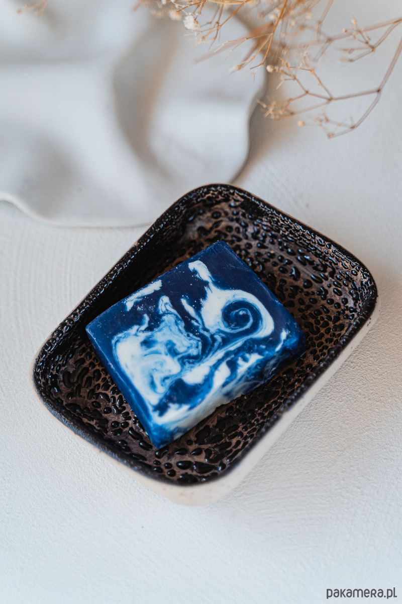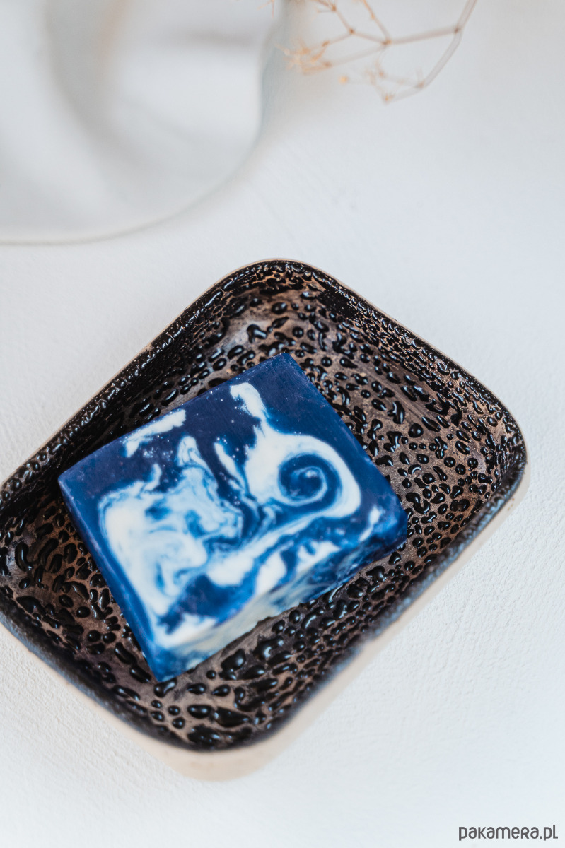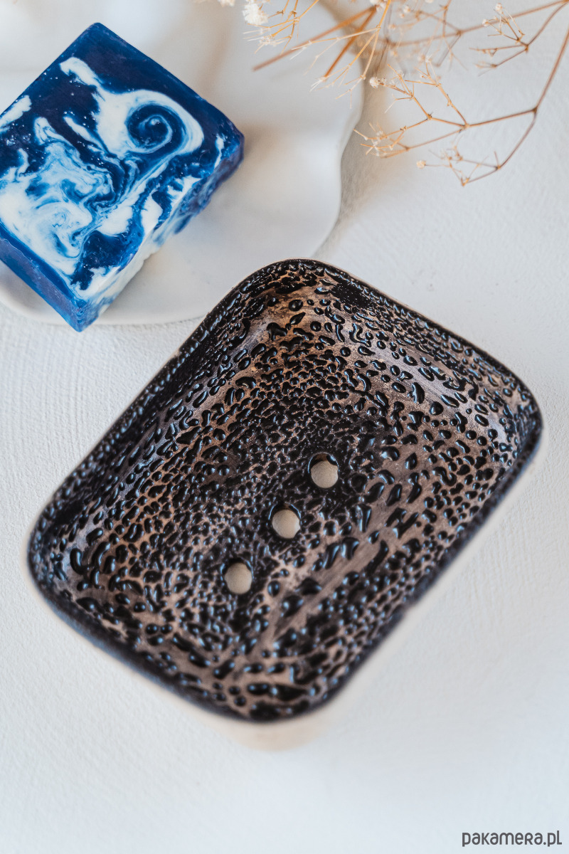 Ceramiczna mydelniczka wykonana ręcznie z jasnej gliny, pokryta błyszczącym szkliwem.