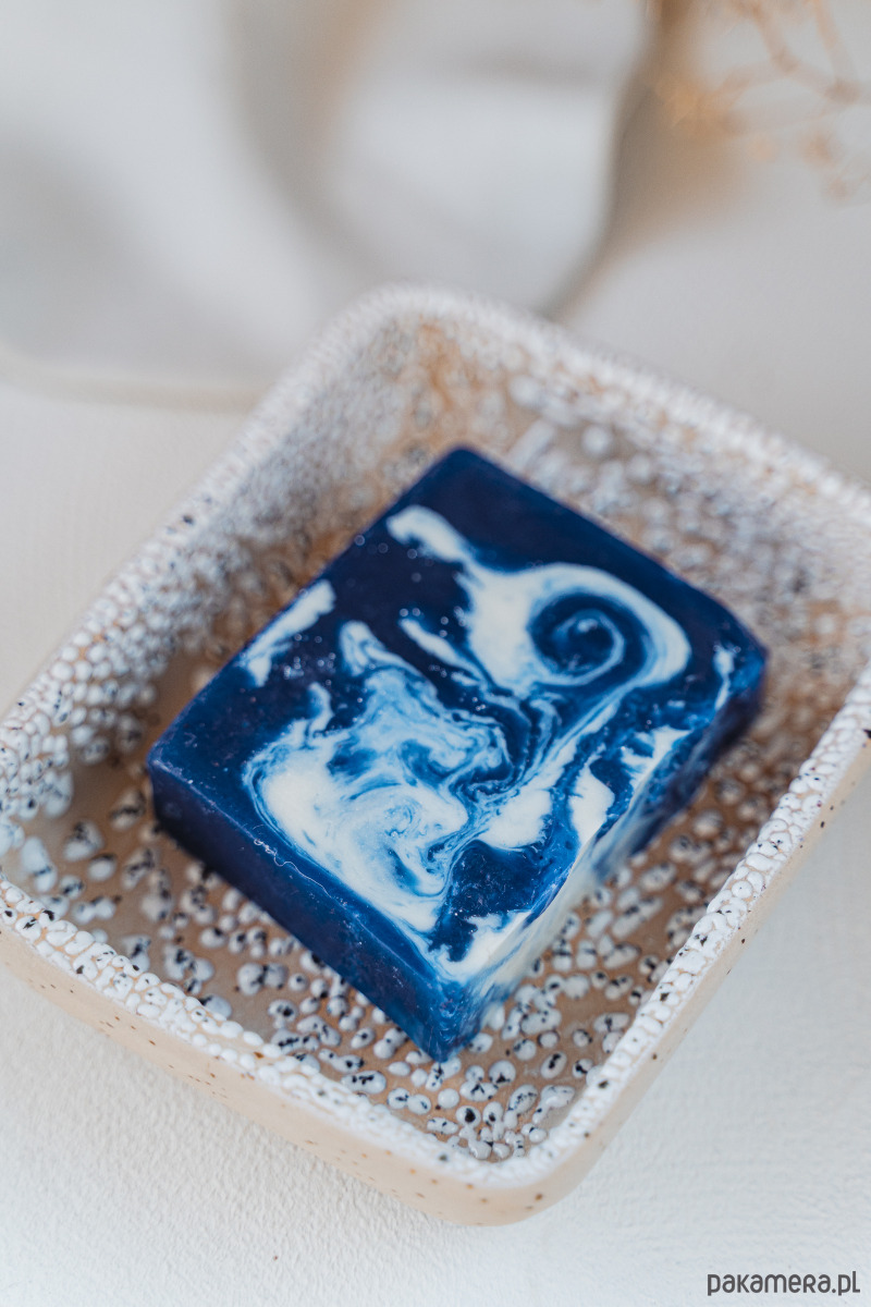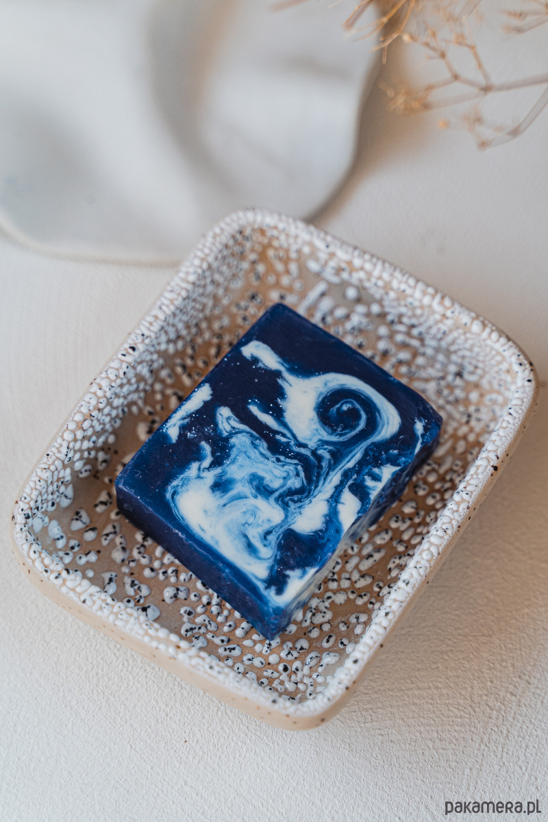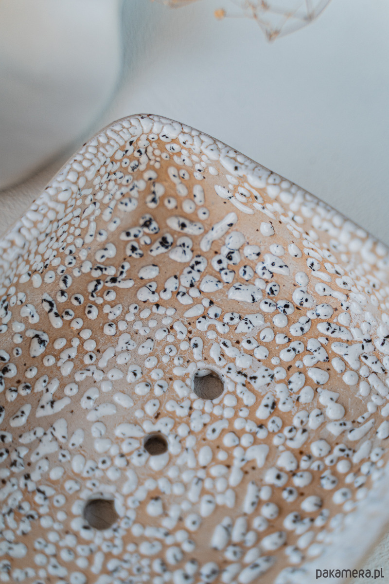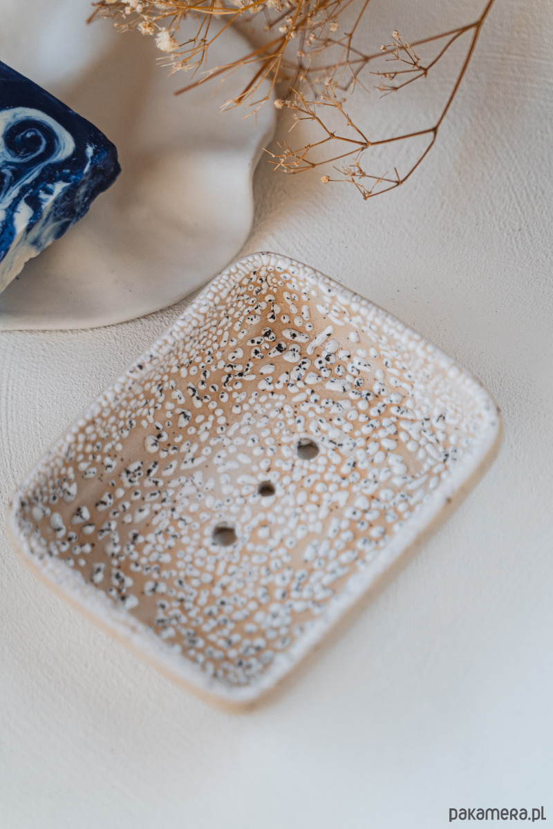 Ceramiczna mydelniczka wykonana ręcznie z jasnej gliny, pokryta błyszczącym szkliwem.