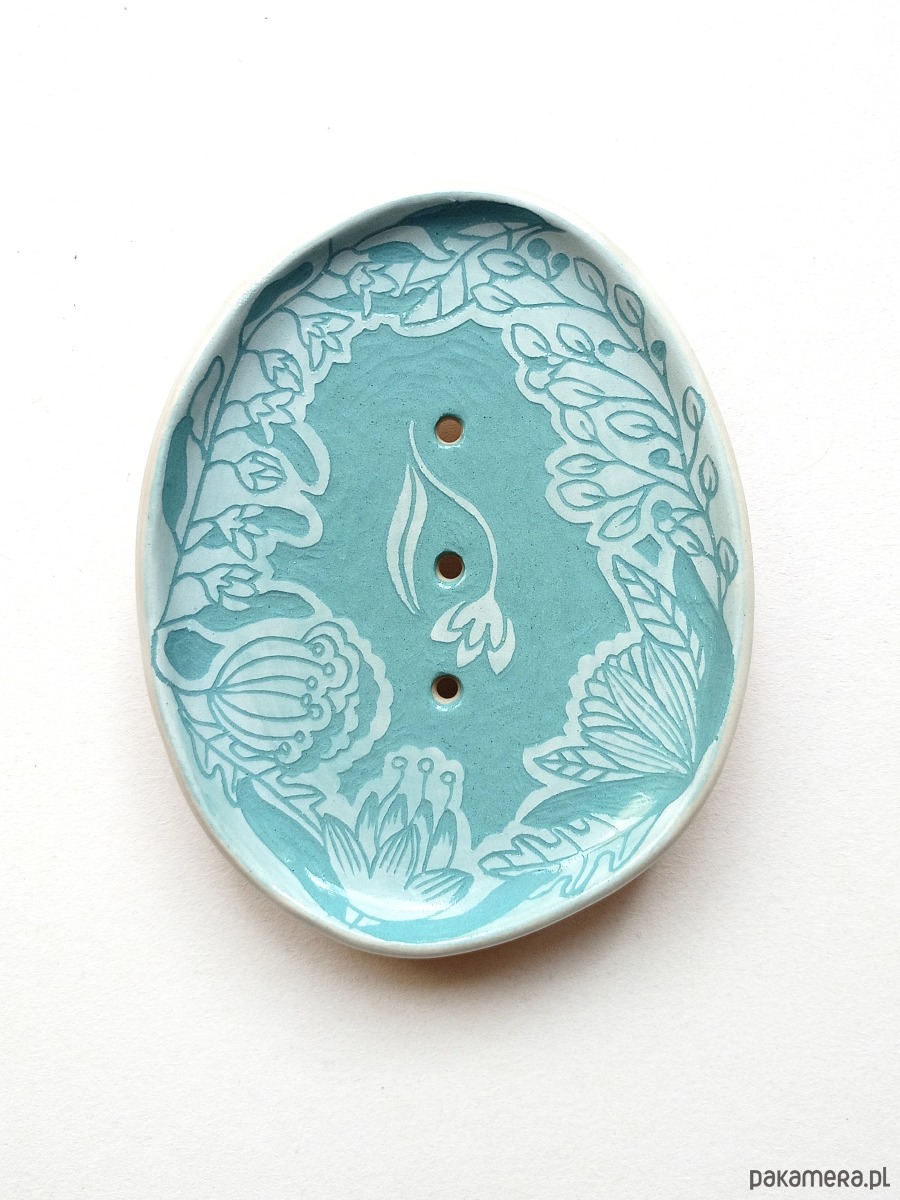 Roślinny wzór na mydelniczce jest w kolorze turkusu i jasnego błękitu i wykonany jest w technice rycia wzoru bezpośrednio w glinie - jest trwały i niepowtarzalny!