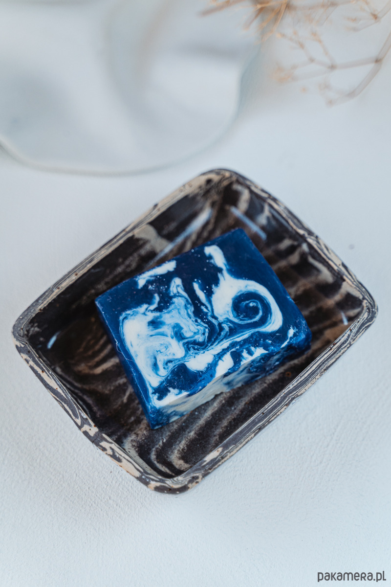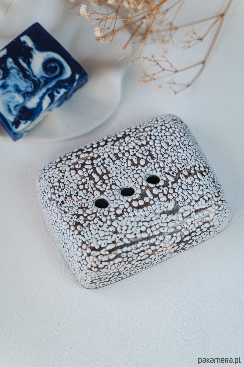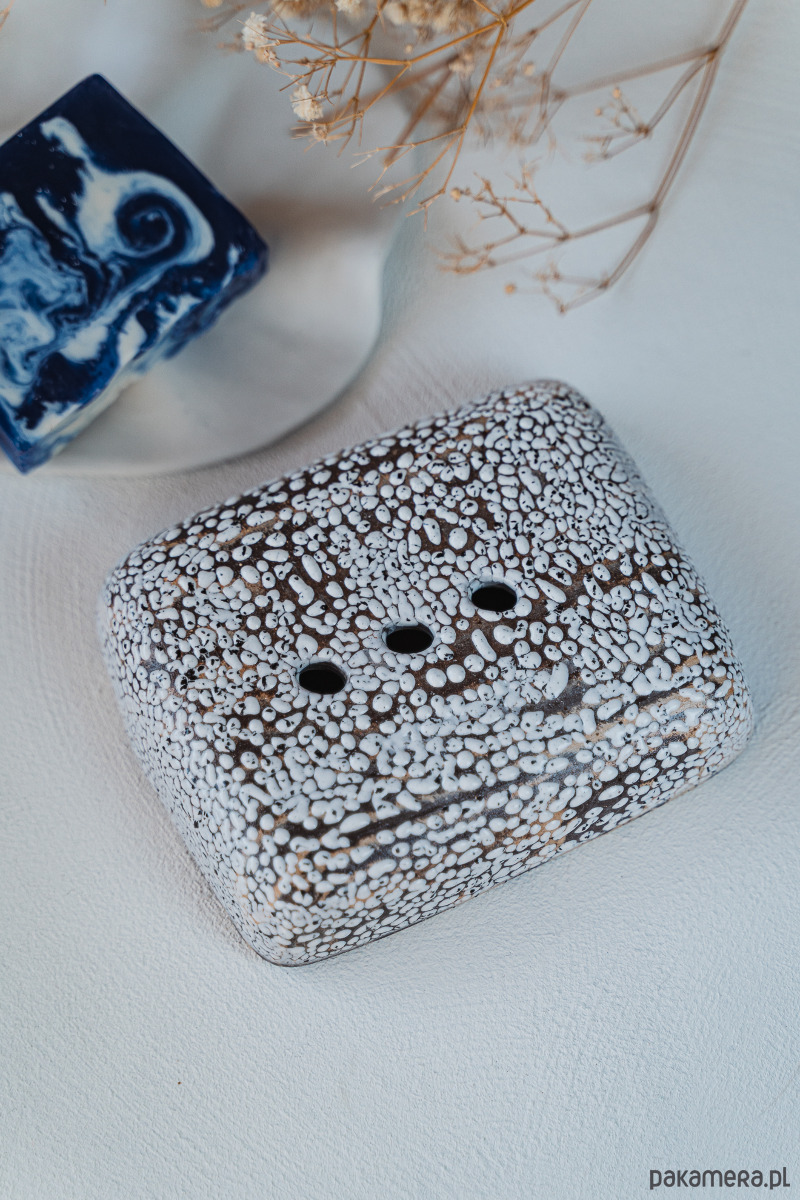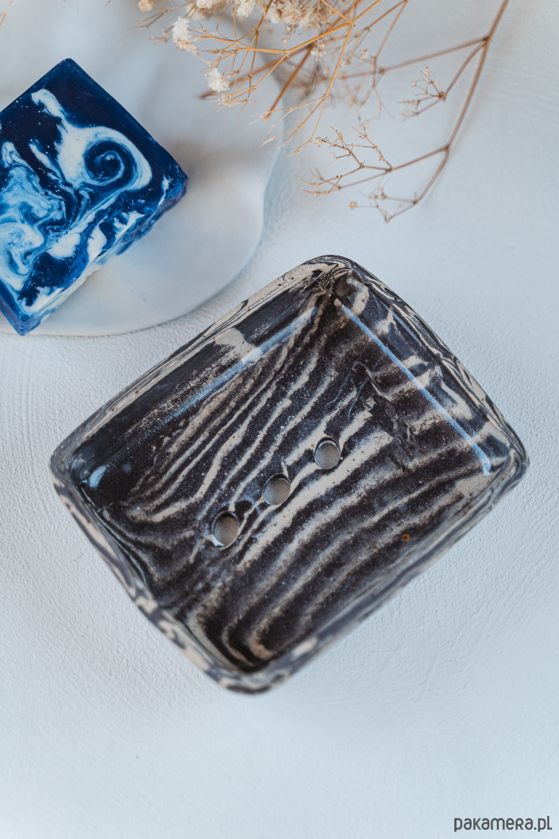 Ceramiczna mydelniczka wykonana ręcznie z jasnej i ciemnej gliny, pokryta błyszczącym szkliwem.