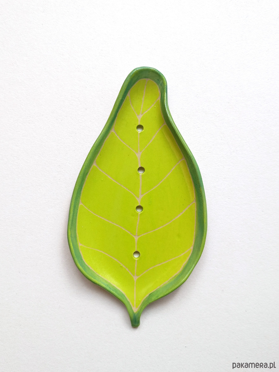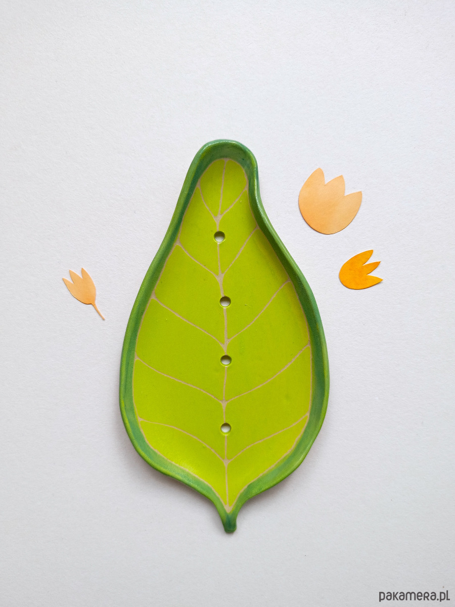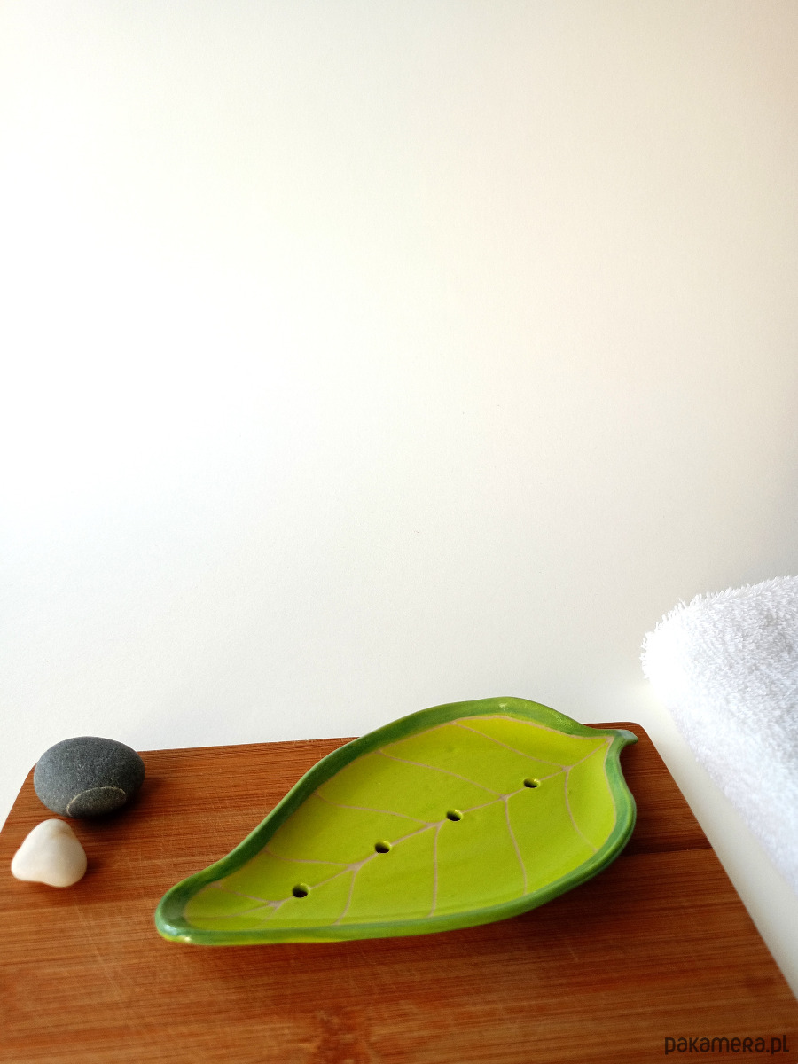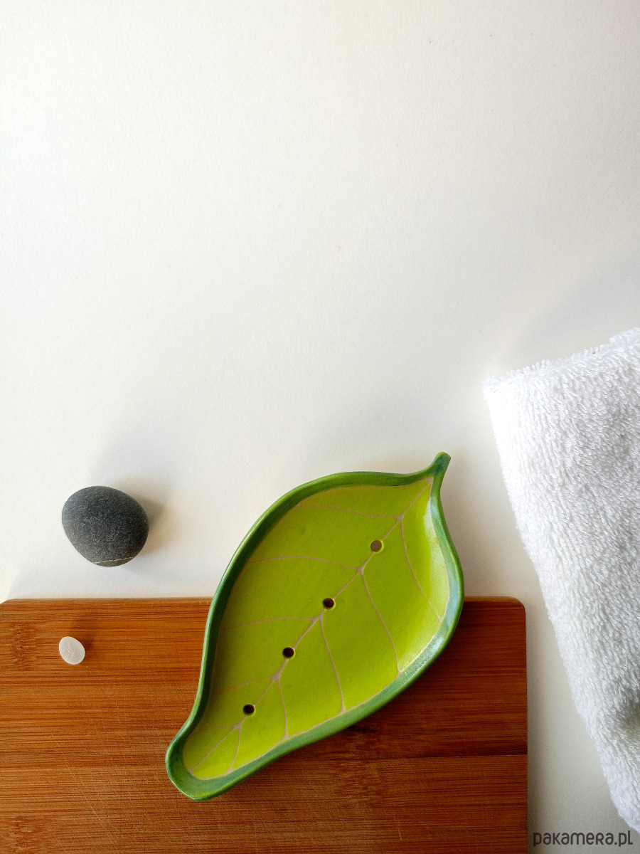 Zielona, płaska mydelniczka w kształcie listka - kawałek rękodzieła w Twojej łazience!
