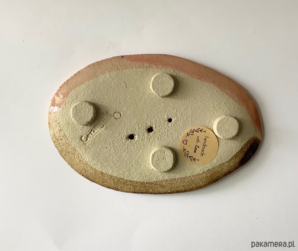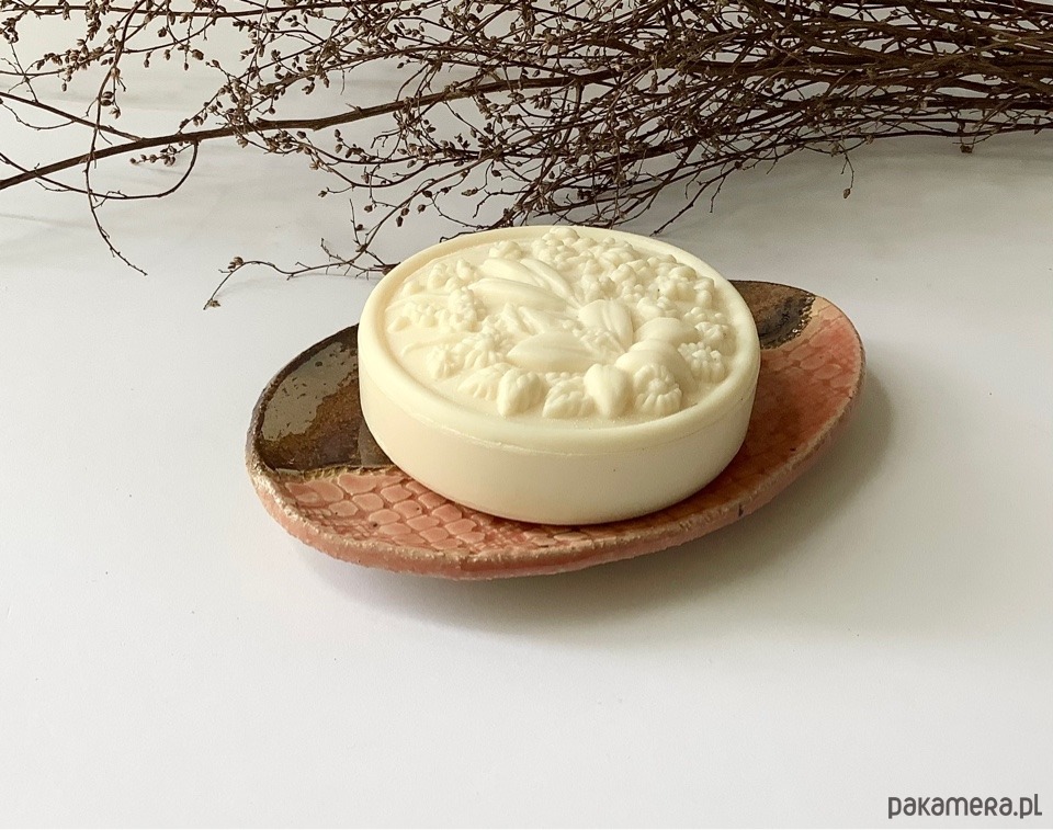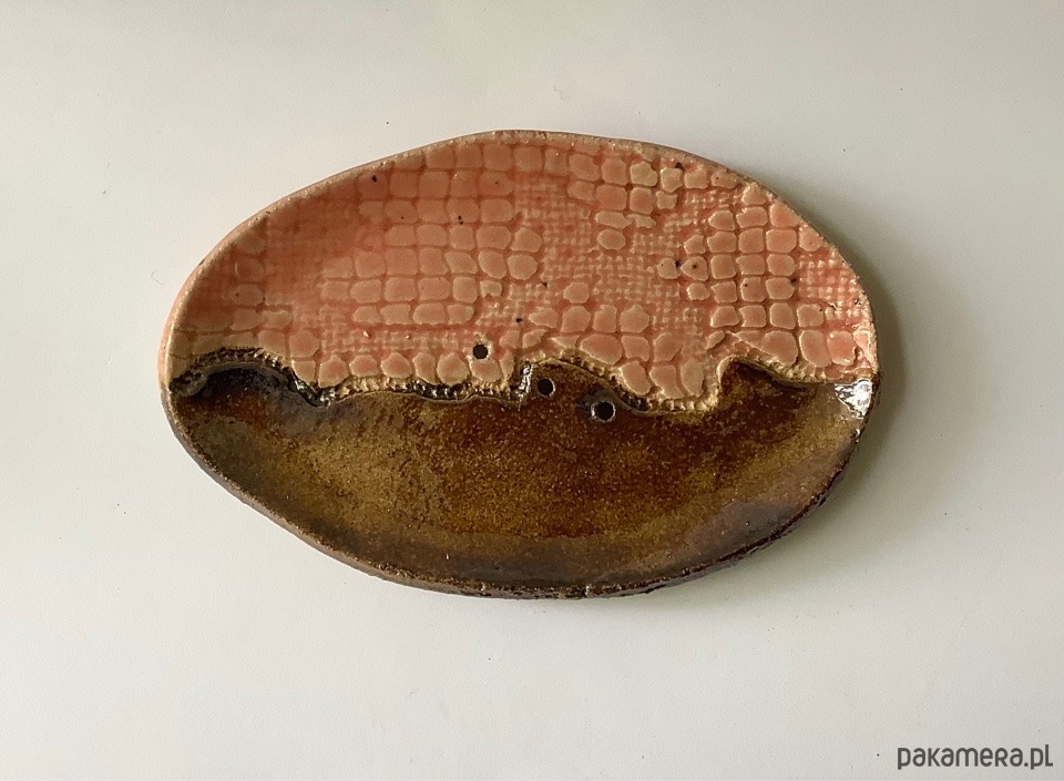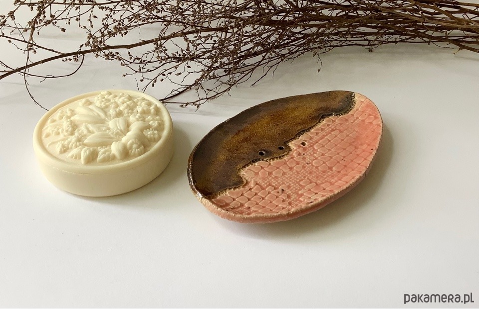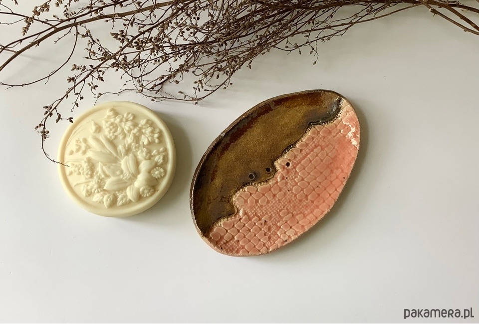 Ręcznie wykonana z gliny owalna mydelniczka, szkliwiona pięknym różowym szkliwem i na części miodowym. Na części mydelniczki odbity koronkowy wzór..W mydelniczce są dziurki ,umożliwiające odpływ nadmiaru wody. Na spodzie gliniane stopki.