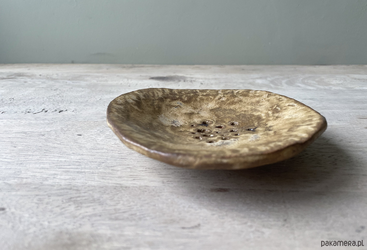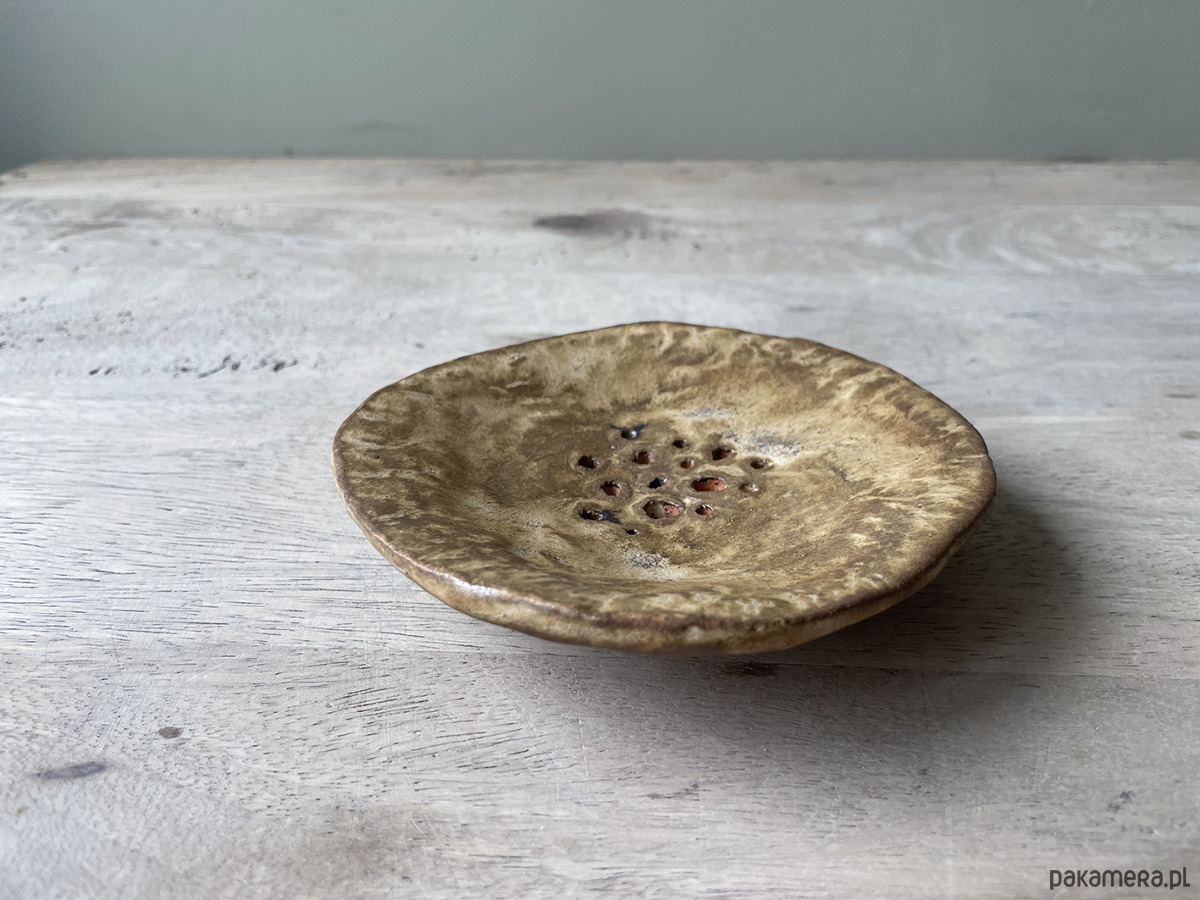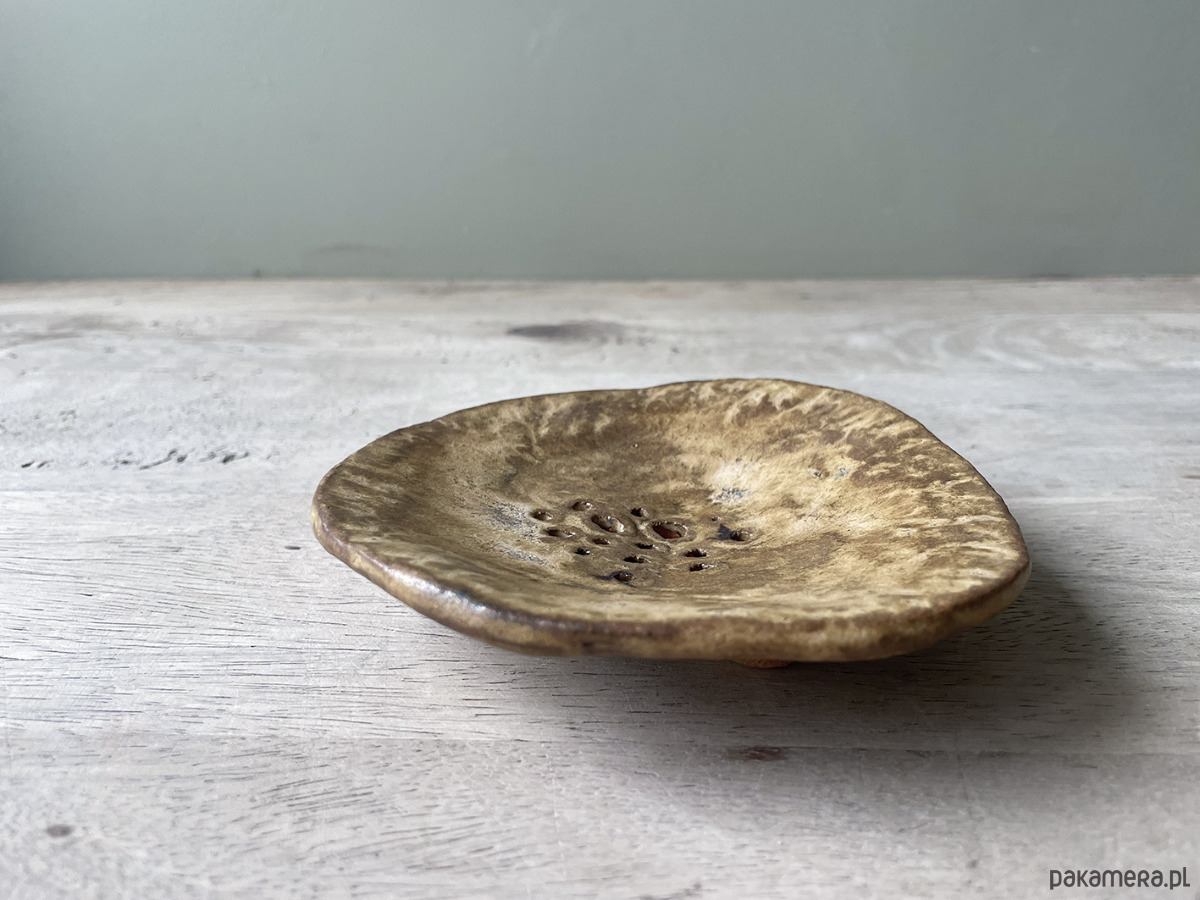 Unikatowa ceramiczna mydelniczka. Lepiona ręcznie w duchu wabi-sabi. Kolory brązów na jasnej glinie. W dotyku matowa. Wypalana w temperaturze 1220°C. Projekt autorski.