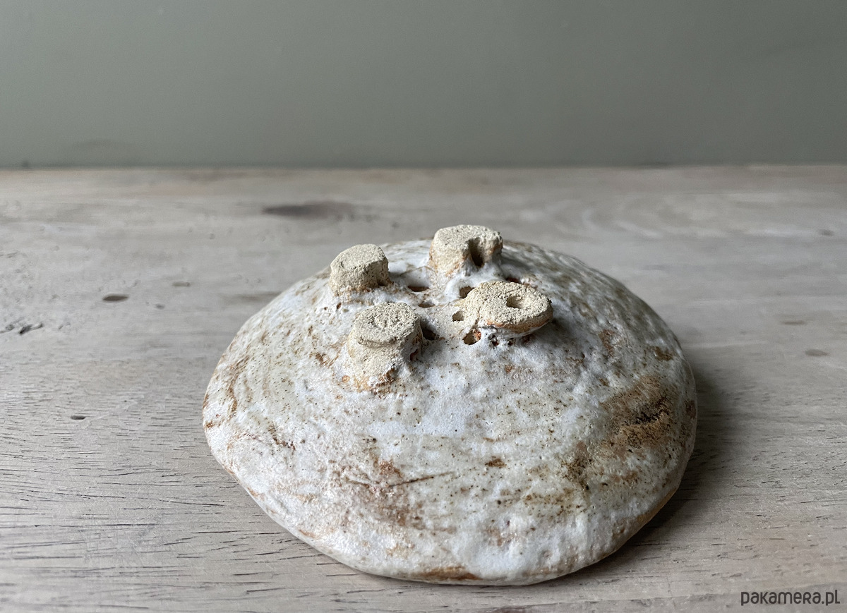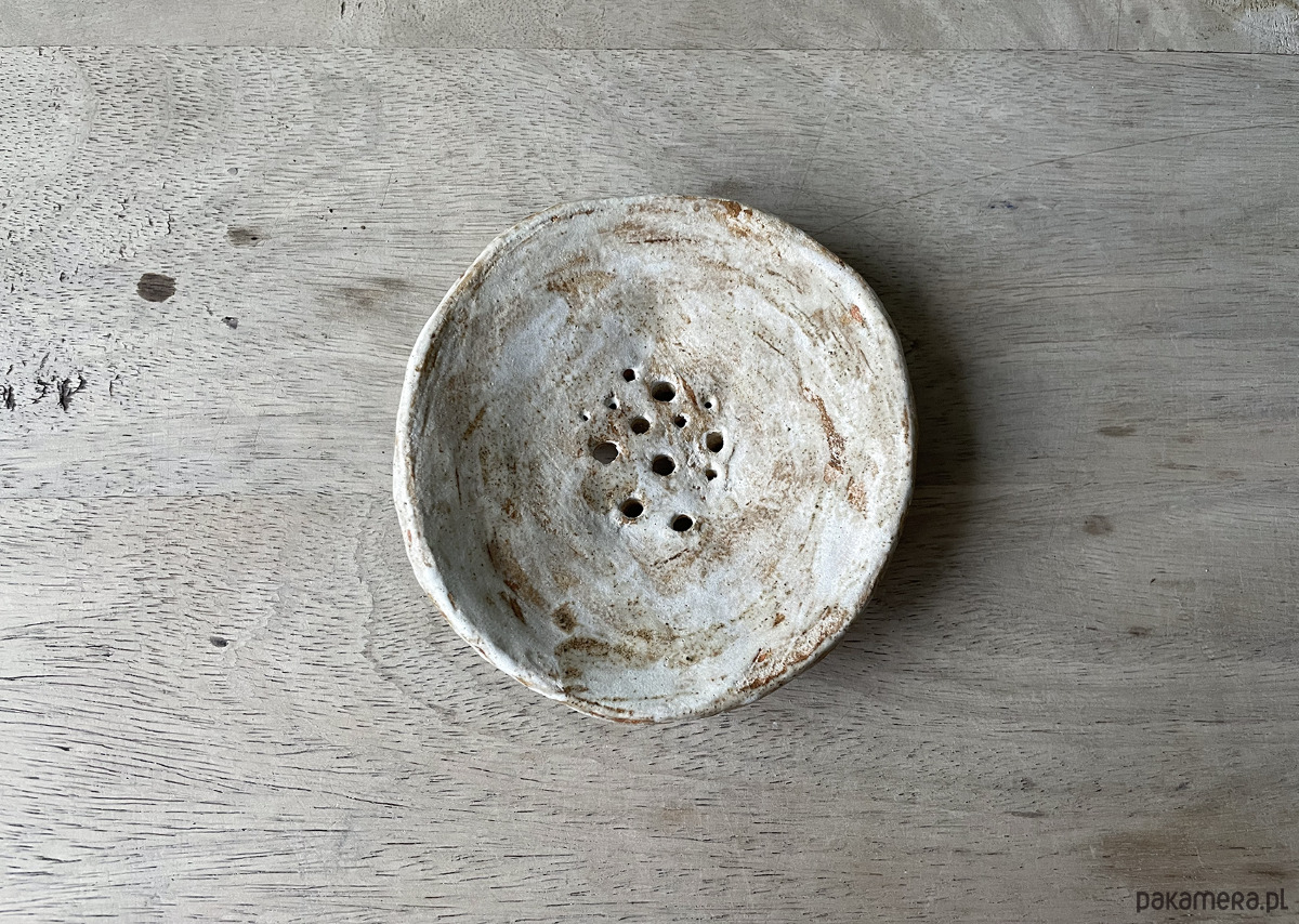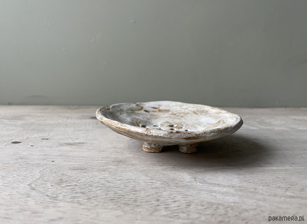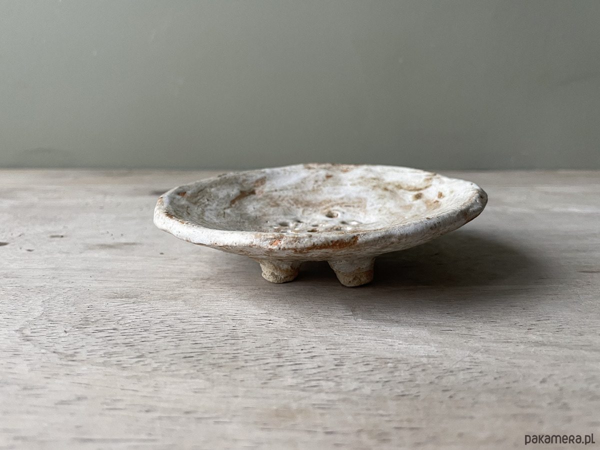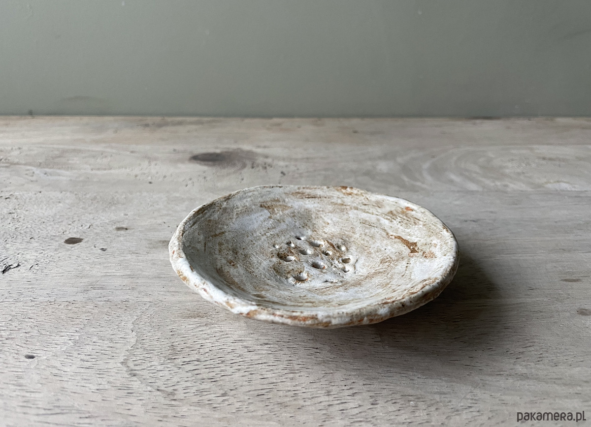 Unikatowa ceramiczna mydelniczka. Lepiona ręcznie w duchu wabi-sabi. Kolory beżu i brązów na jasnej glinie. W dotyku matowa. Wypalana w temperaturze 1220°C. Projekt autorski.