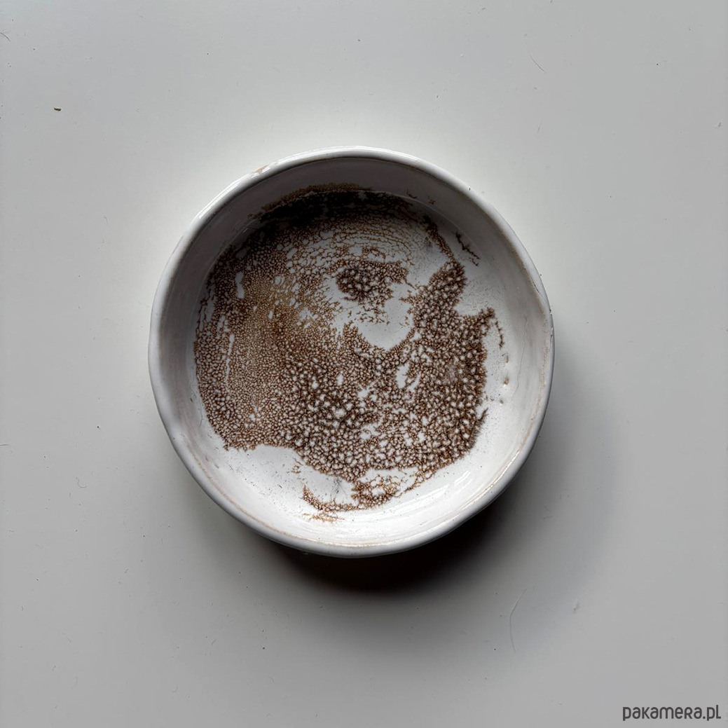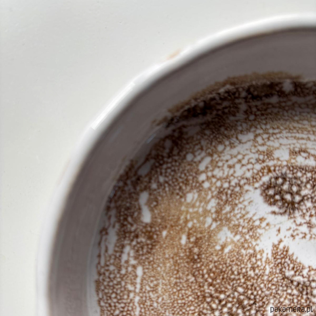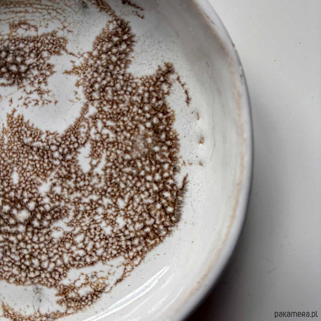 Mydelniczka wykonana z jasnej gliny pokryta jasnokremowym i brązowym szkliwem.