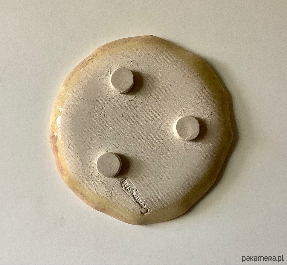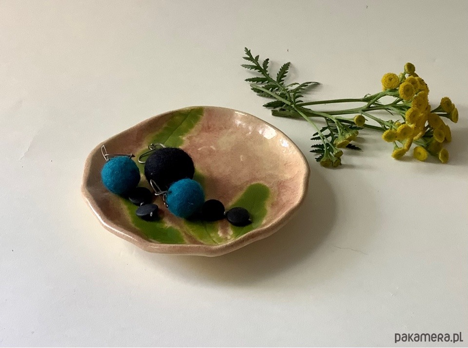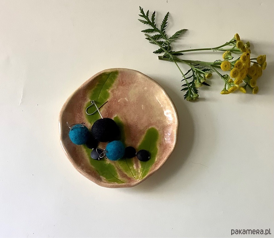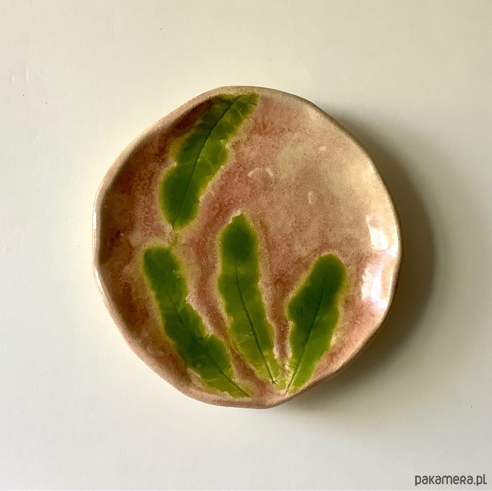 Ręcznie wykonana z gliny mydelniczka/spodeczek z motywem roślinnym. Poszkliwiona na beżowo i zielono. Na spodzie ma gliniane nóżki.