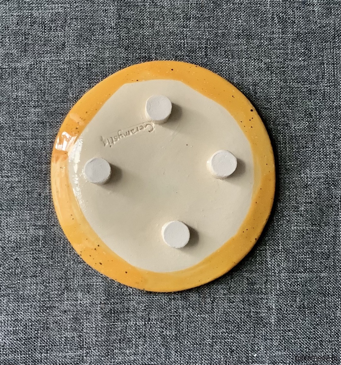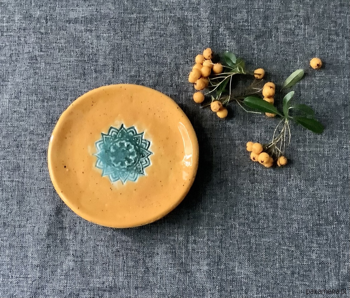Ręcznie wykonana z gliny mydelniczka/spodeczek, szkliwiona słonecznym żółtym i zielonym szkliwem. Na spodzie ma gliniane nóżki. Może służyć, jako podstawka pod palo santo, talerzyk na biżuterie lub mydelniczka.