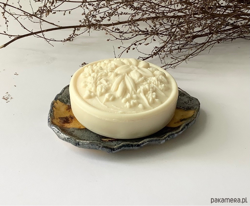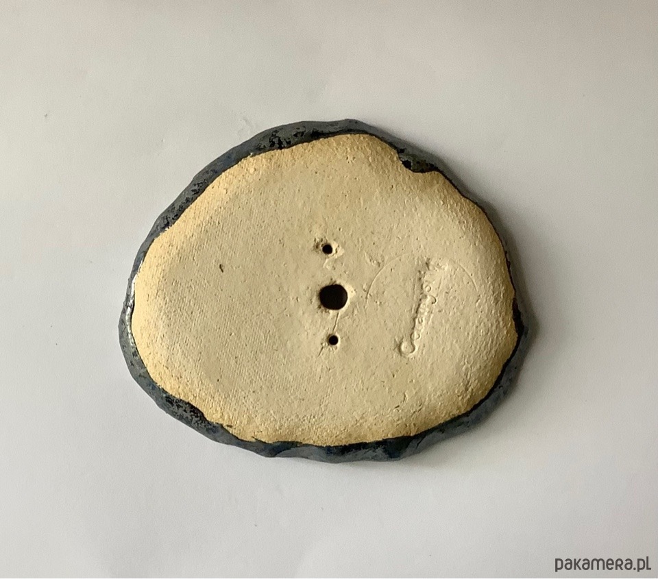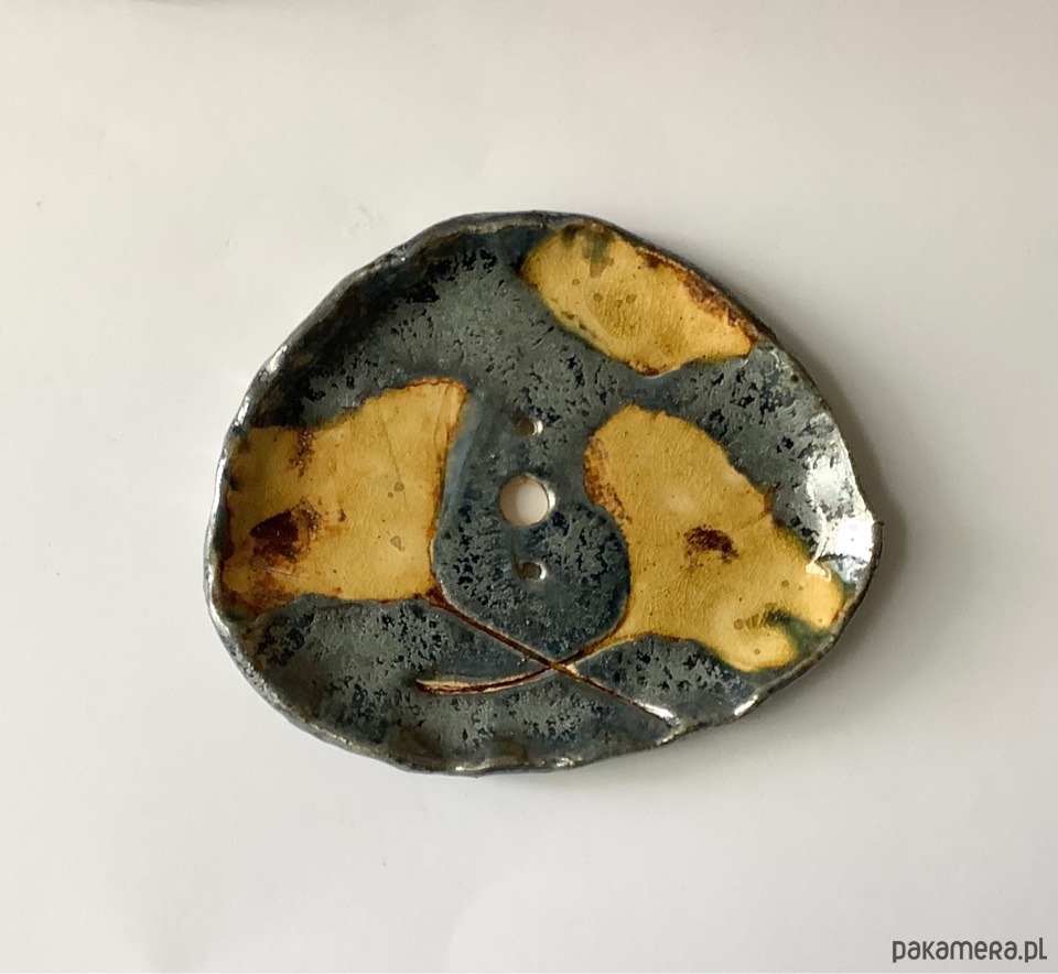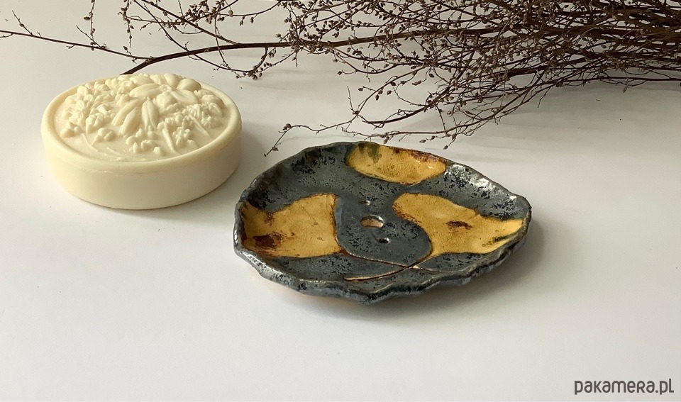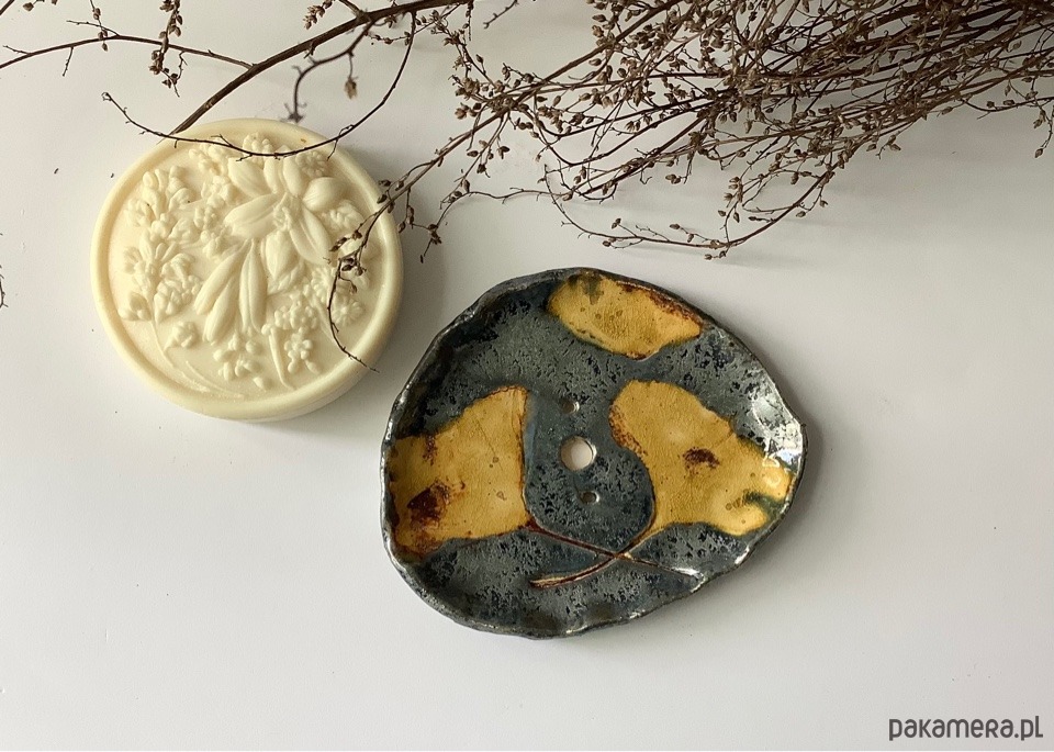 Ręcznie wykonana z jasnej gliny mydelniczka z motywem liści miłorzębu. Poszkliwiona przepięknym odcieniem stalowo-niebieskiego szkliwa, a liscie w kolorze ochry.W mydelniczce są dziurki umożliwiające odpływ nadmiaru wody.