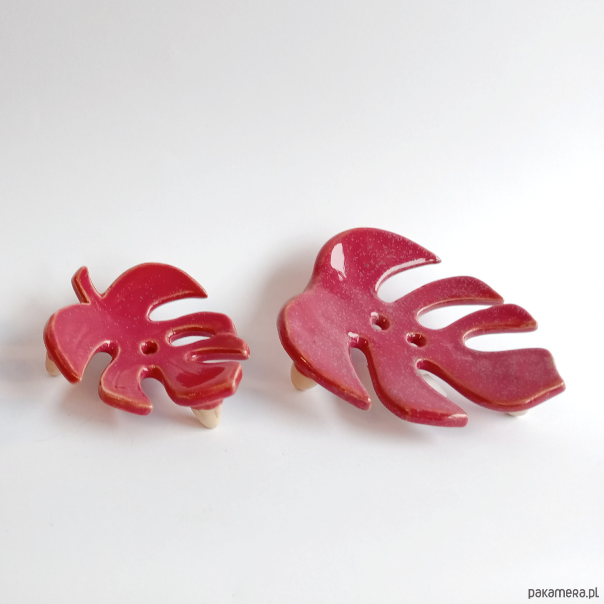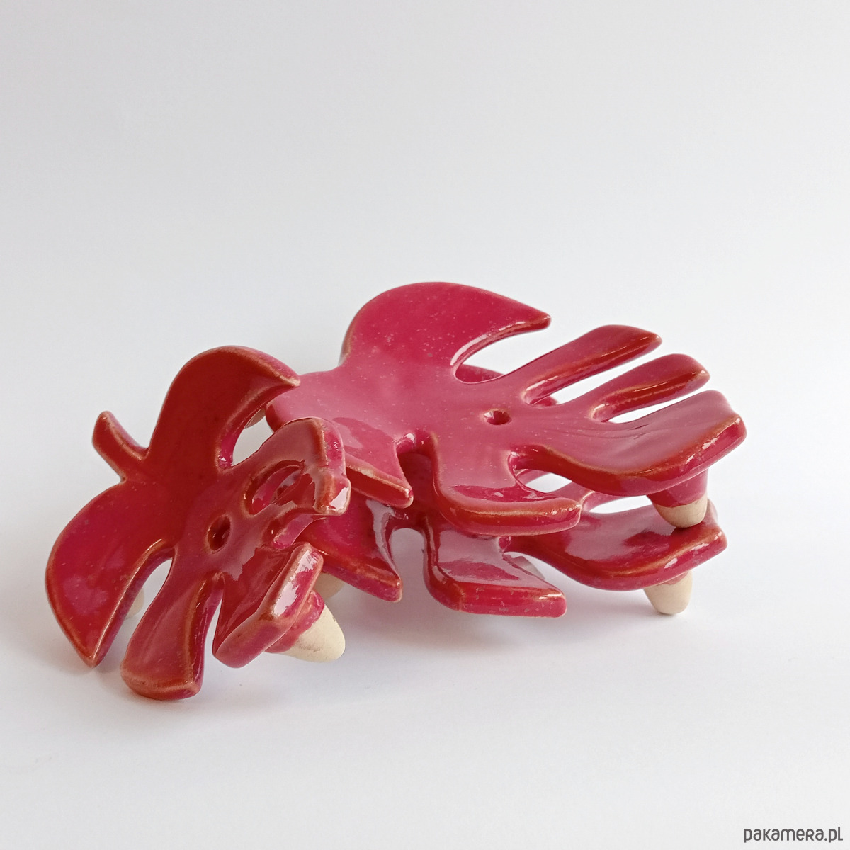 Mydelniczka w kształcie liścia monstery, z dziurkami, na nóżkach, w intensywnym, różowym kolorze z delikatnymi kropkami.