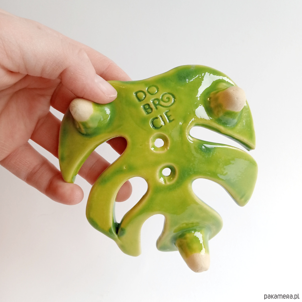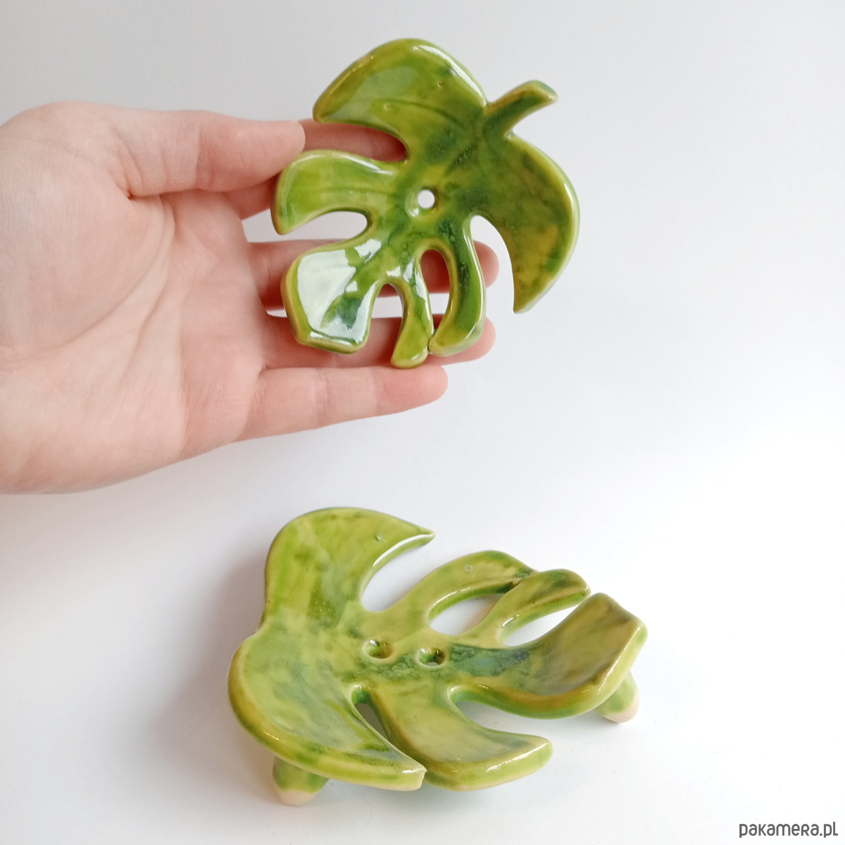 Mydelniczka w kształcie liścia monstery, z dziurkami, na nóżkach, w niejednolitym, zielonym kolorze.
