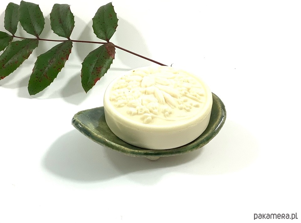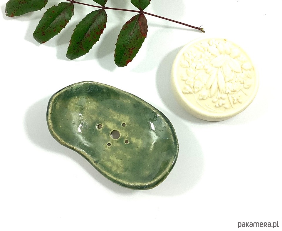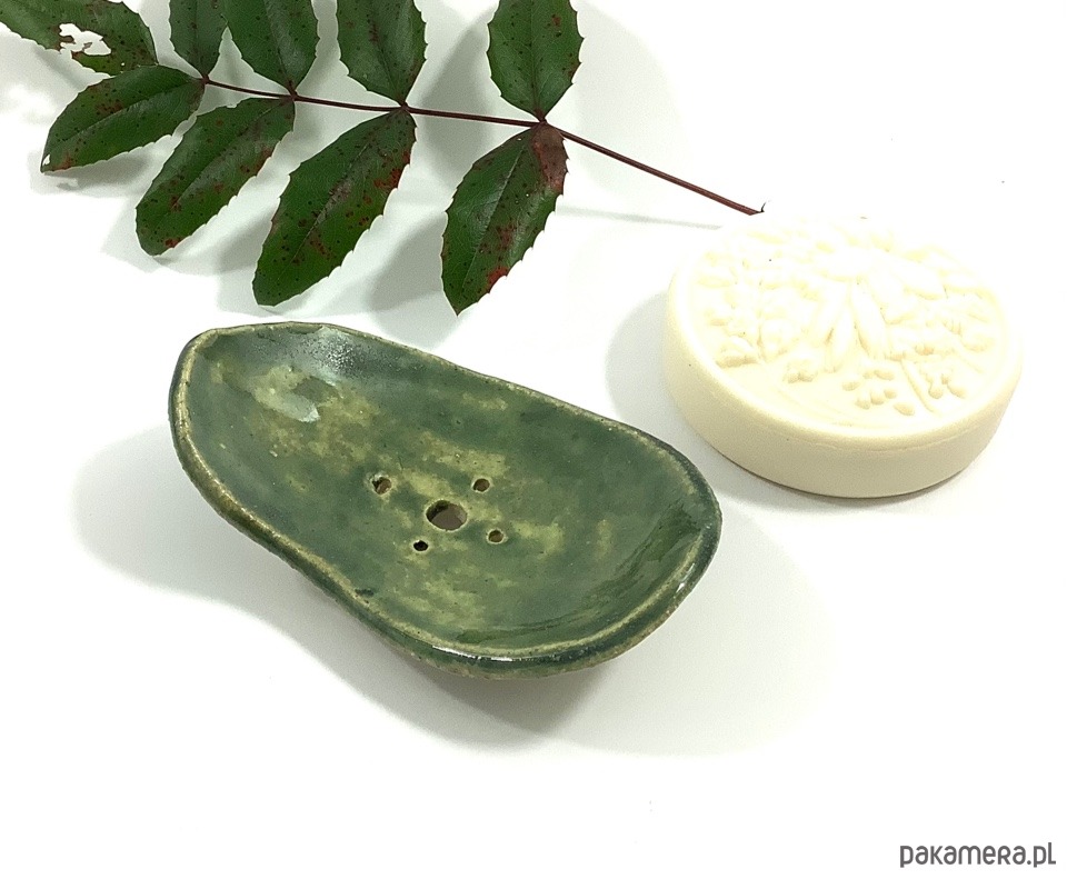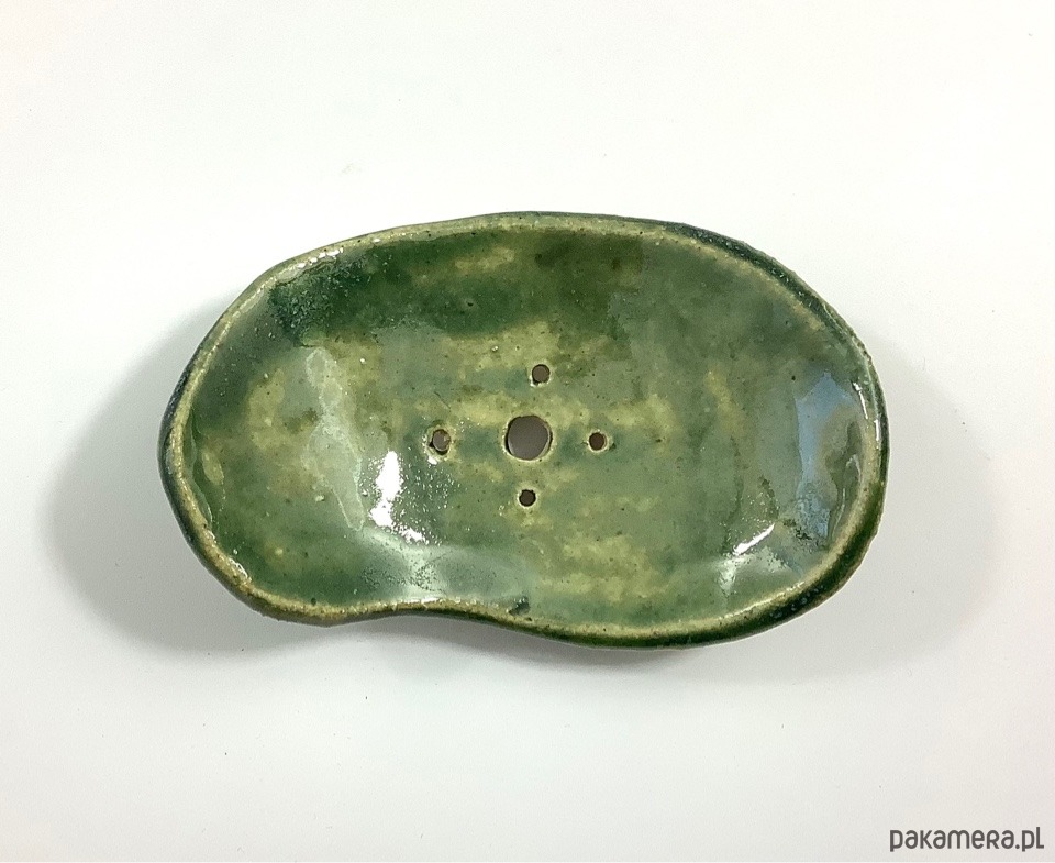 Ręcznie wykonana z jasnej gliny mydelniczka , lekko wgłębiona. Na spodzie gliniane stopki. Poszkliwiona na jasny zielony kolor. W mydelniczce są dziurki umożliwiające odpływ nadmiaru wody.