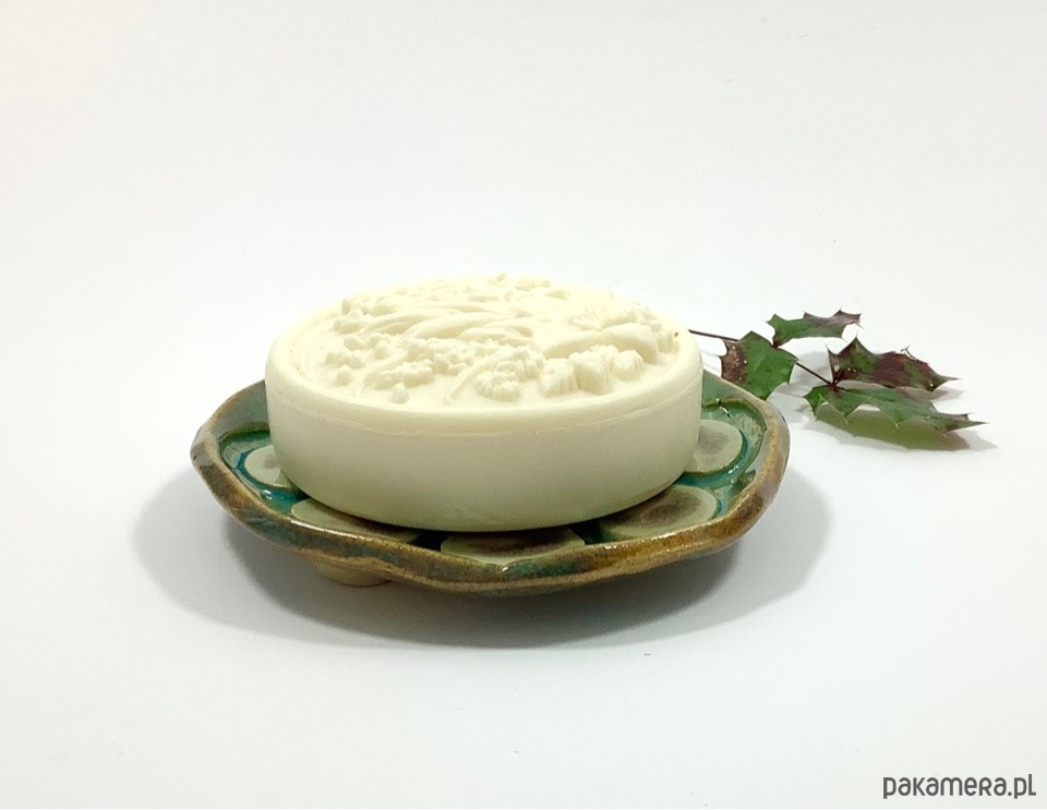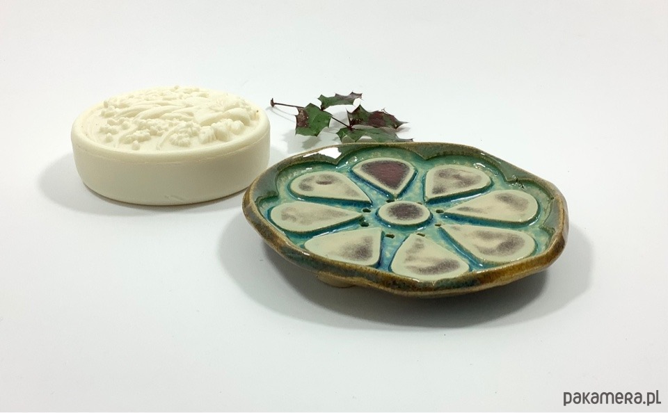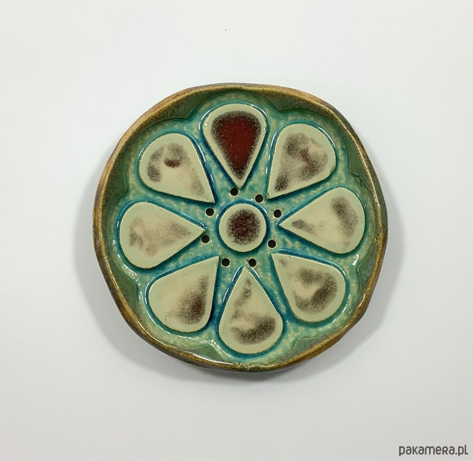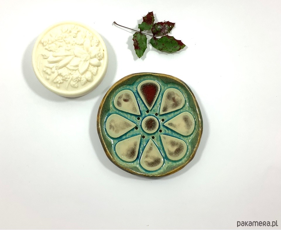 Okrągła mydelniczka ceramiczna wykonana ręcznie z jasnej gliny. Na mydelniczce odbitywzór kwiatowy. Całość poszkliwiona na zielono, a płatki na czerwony kolor, który nie wybarwia się z całości.