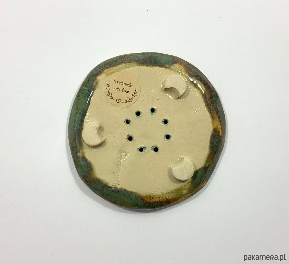 W mydelniczce są dziurki umożliwiające odpływ nadmiaru wody, pod spodem gliniane nóżki.