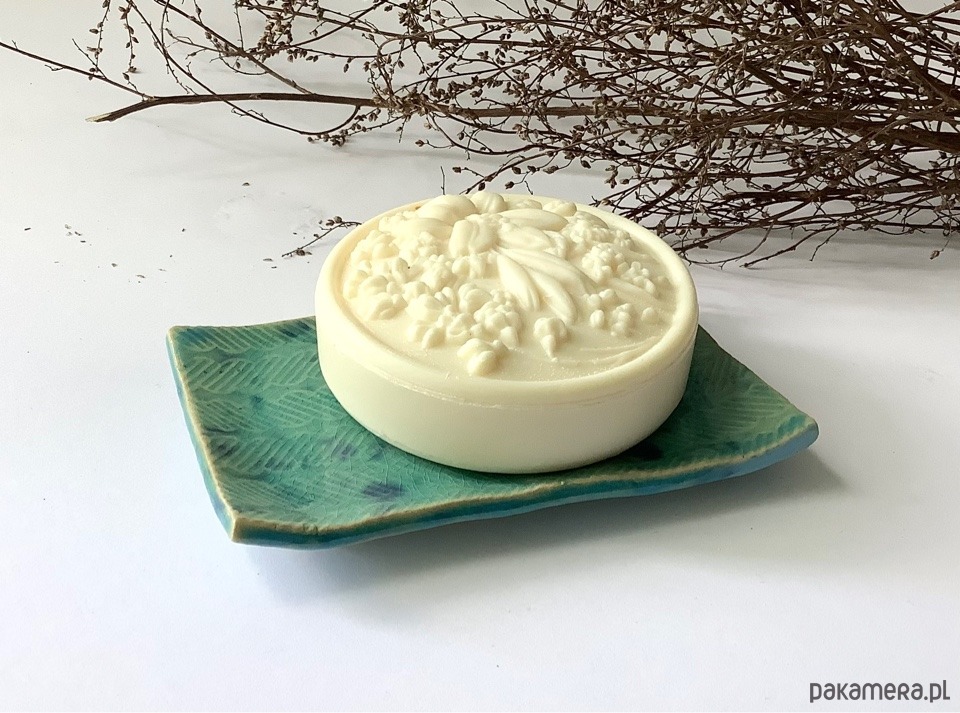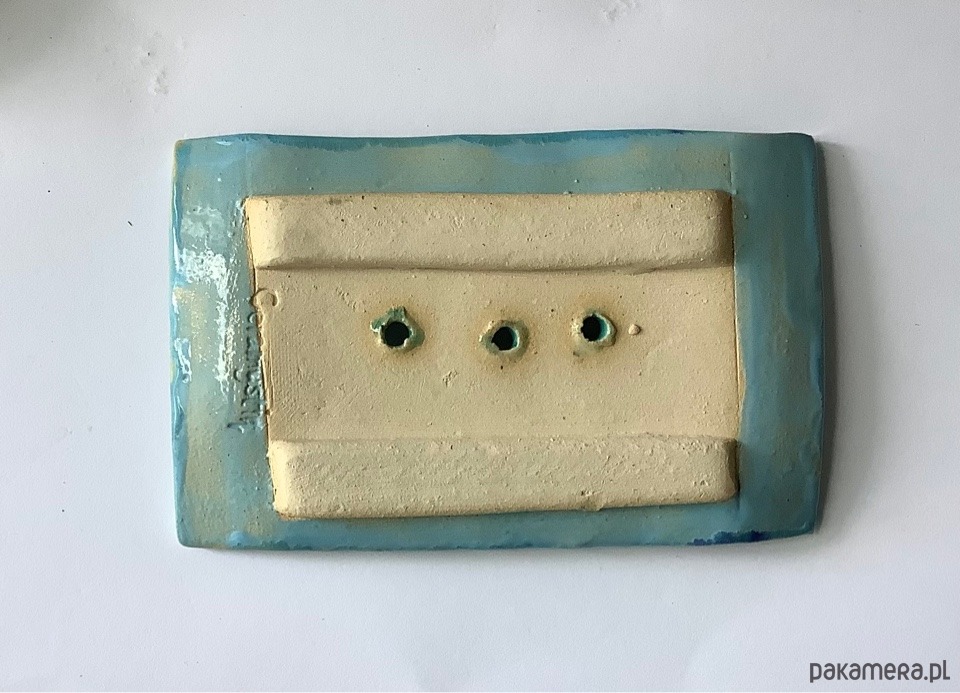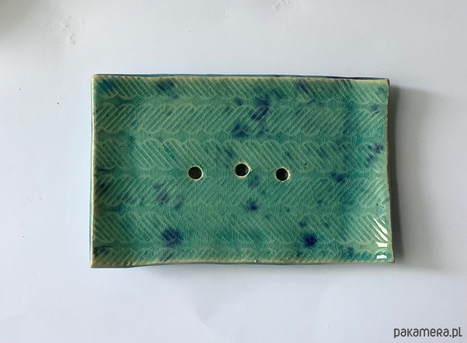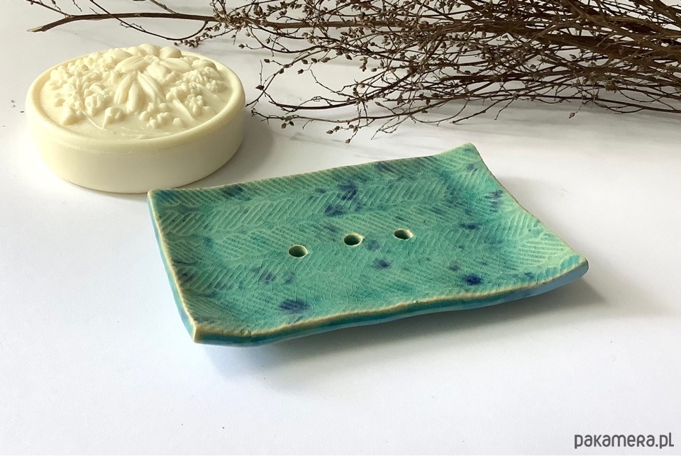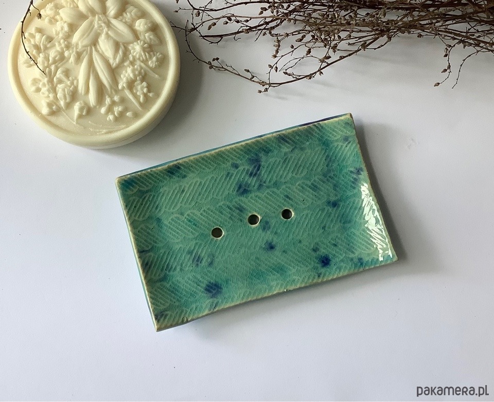 Ręcznie wykonana z jasnej gliny prostokątna mydelniczka. Szkliwiona transparentnym szkliwem w kolorze turkusowym z kobaltowymi plamkami. Spod szkliwa przebija wzór.W mydelniczce są dziurki, umożliwiające odpływ nadmiaru wody. Na spodzie gliniane nóżki.