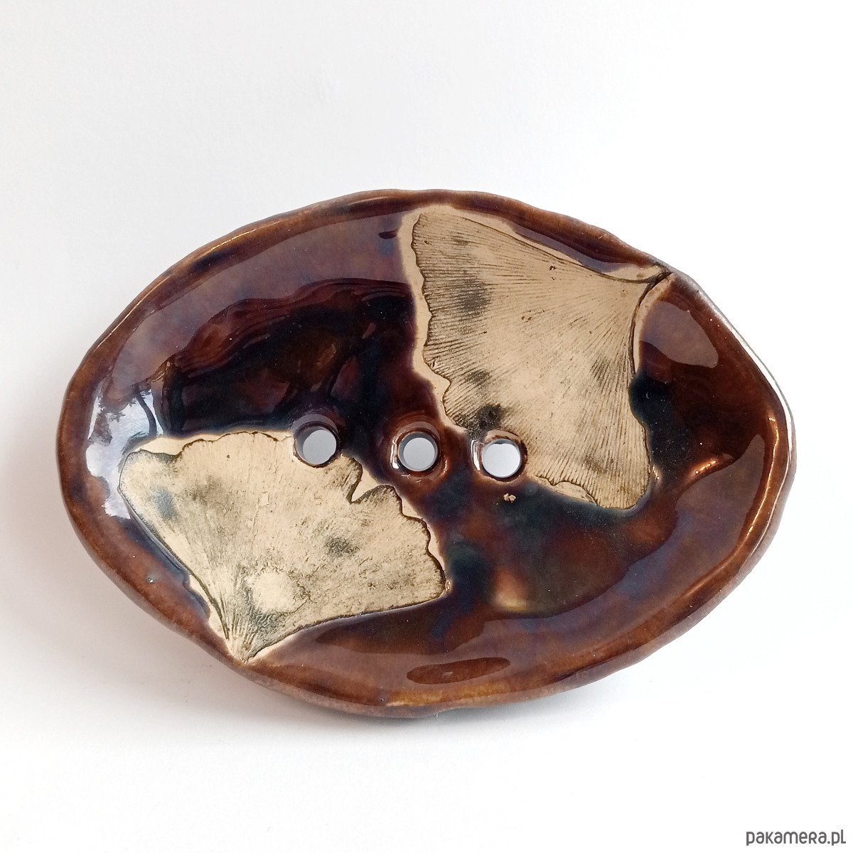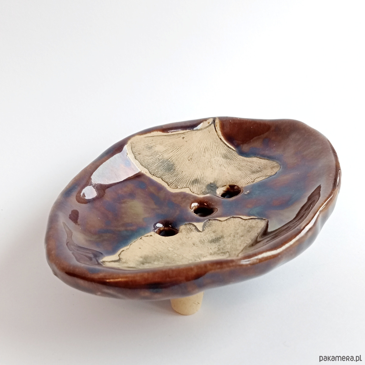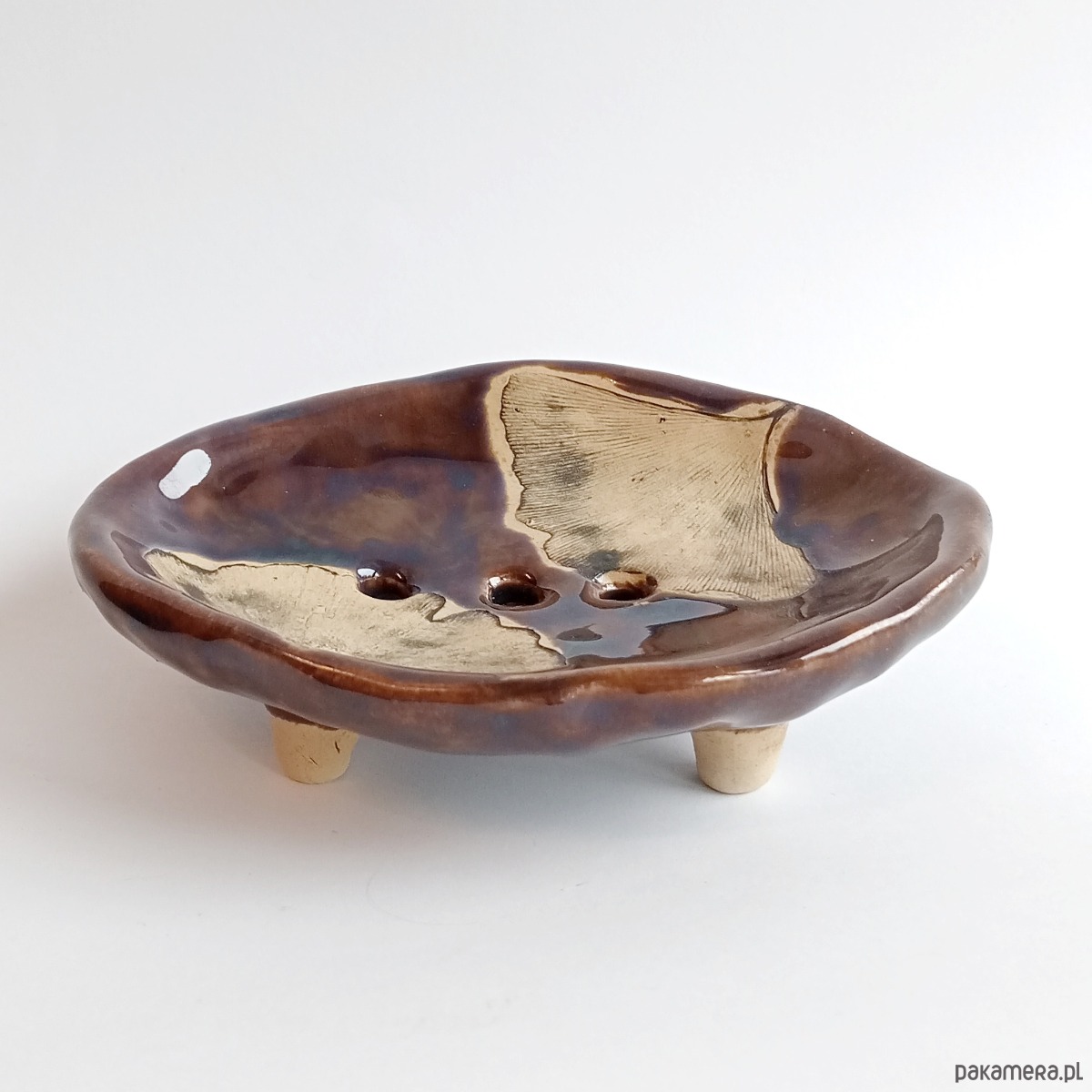 Ręcznie lepiona mydelniczka na nóżkach z odbiciami liści miłorzębu.