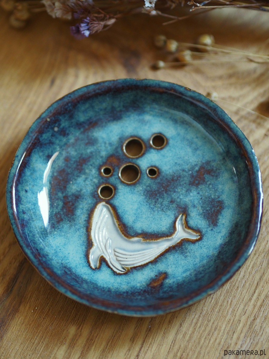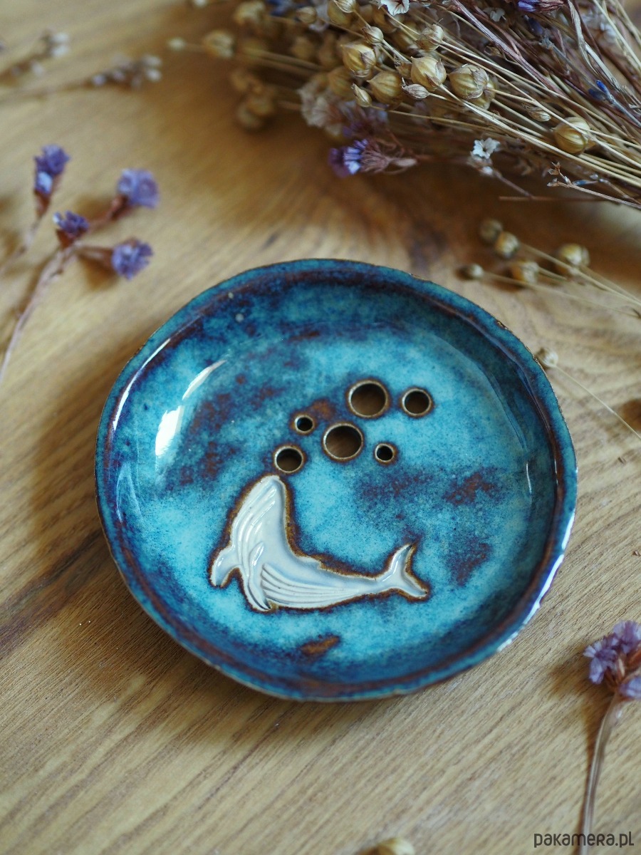 Mydelniczka dwustronnie szkliwiona, na uroczych nóżkach. Zdobionaefektowym szkliwem w morskich odcieniach niebieskiego. Z motywem humbaka.