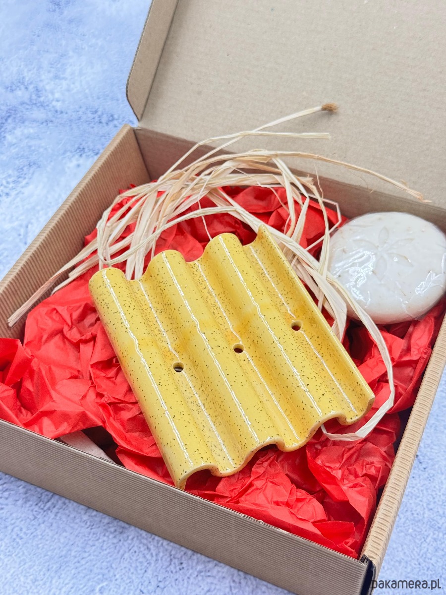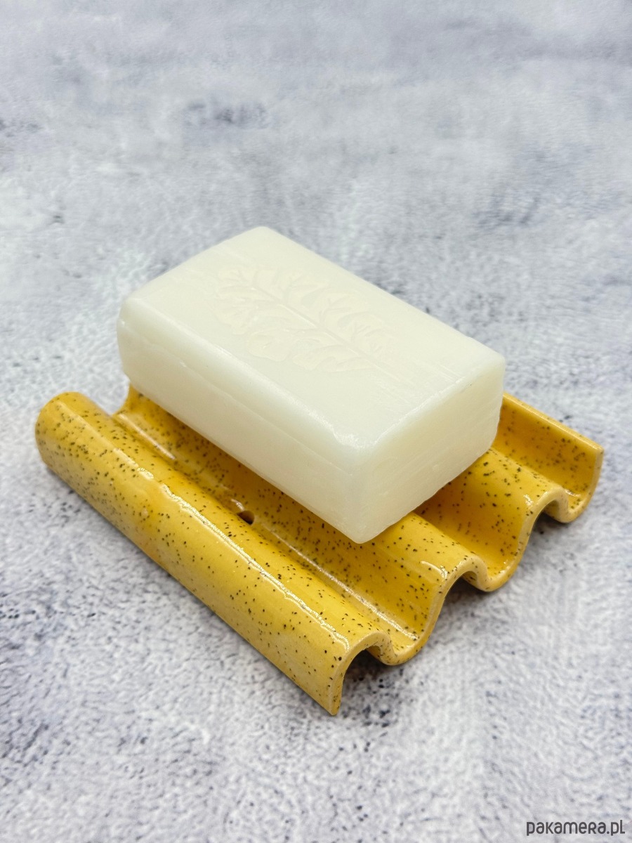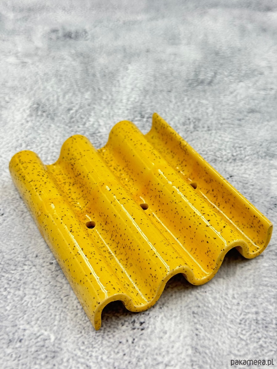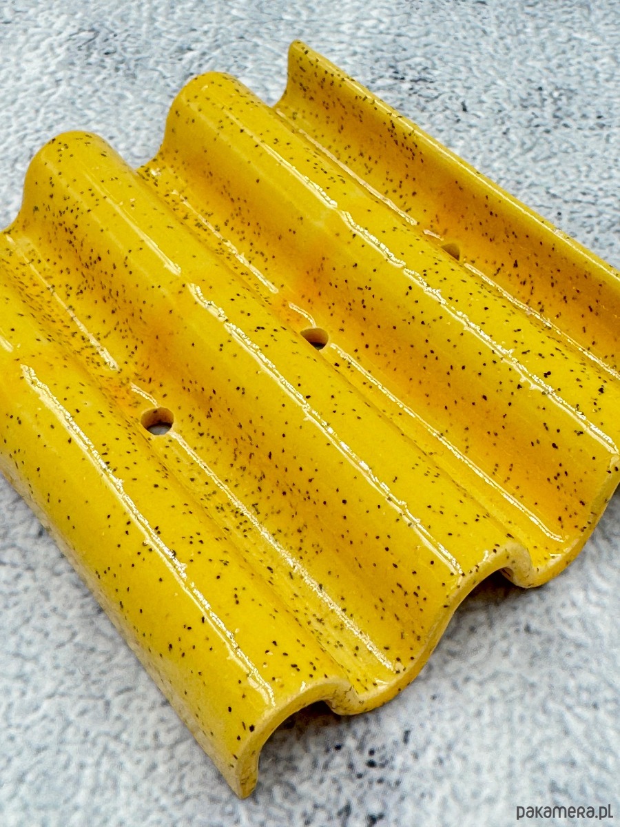 Elegancka, ręcznie robiona mydelniczka w żółtym, lekko musztardowym kolorze to połączenie nowoczesnego designu i funkcjonalności. Wykonana z wysokiej jakości ceramiki, wyróżnia się subtelnym, ale wyrazistym wyglądem, który doda charakteru każdej łazience. Jej gładka, falująca forma i musztardowe, żółte szkliwinie z drobnymi kropeczkami sprawiają, że staje się nie tylko praktycznym akcesorium, ale również stylową ozdobą. Idealna dla osób szukających unikalnych, ręcznie wykonanych przedmiotów, które wprowadzą do wnętrza elegancję i nowoczesność. Wymiary 8,5 cm x 10 cm.
