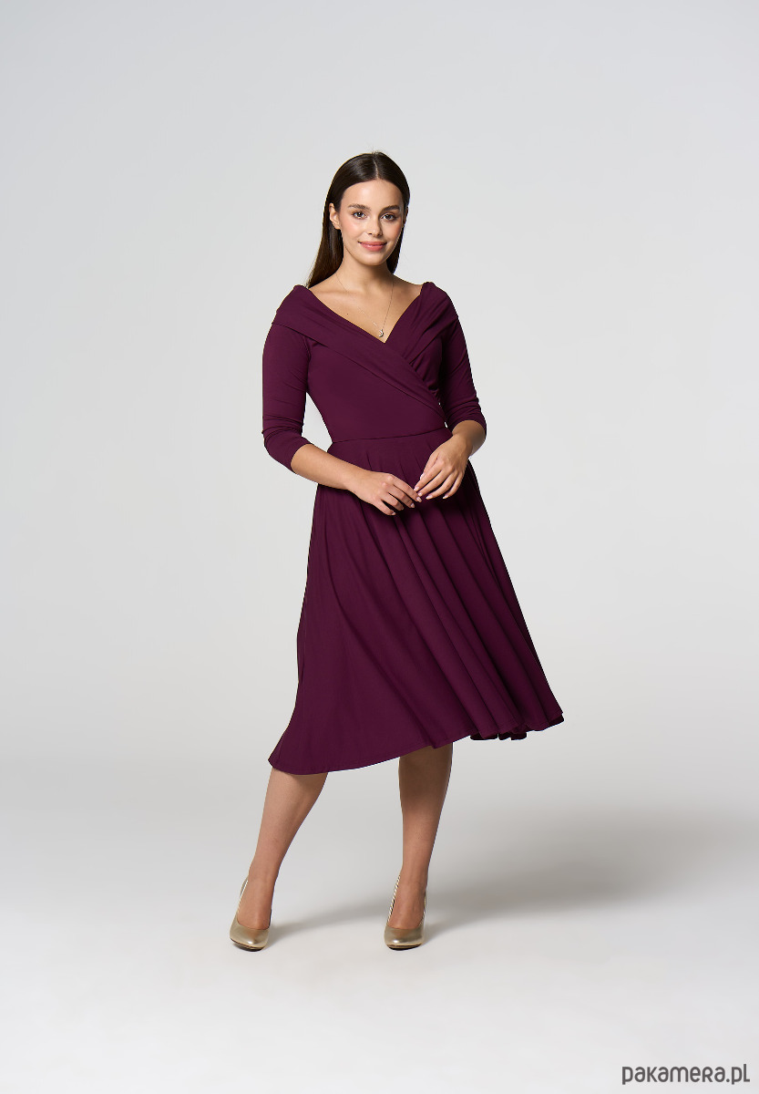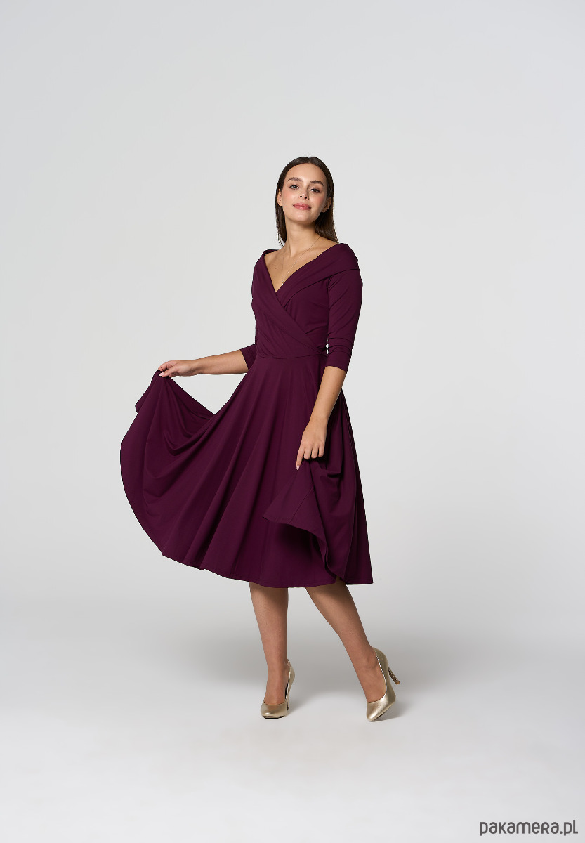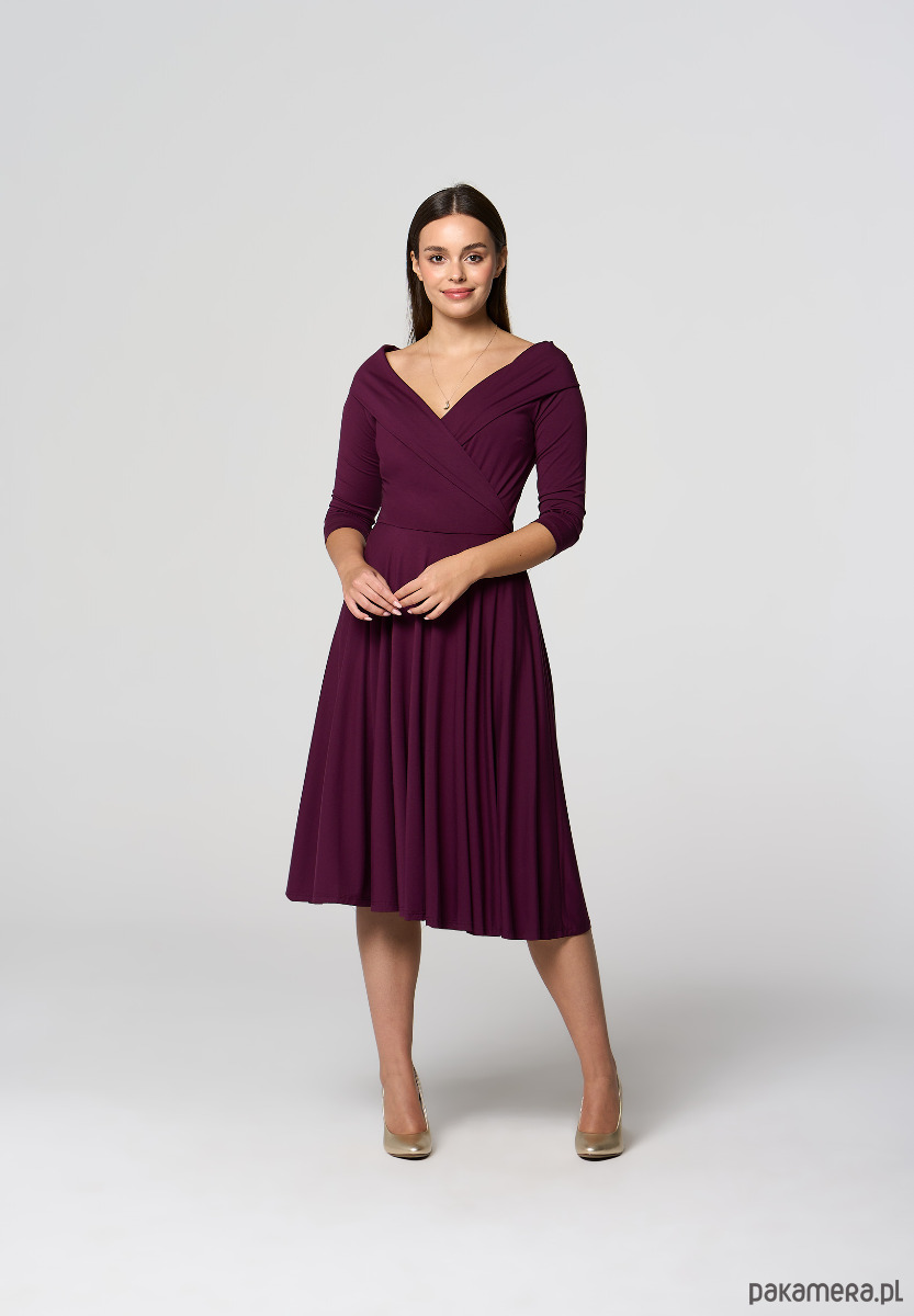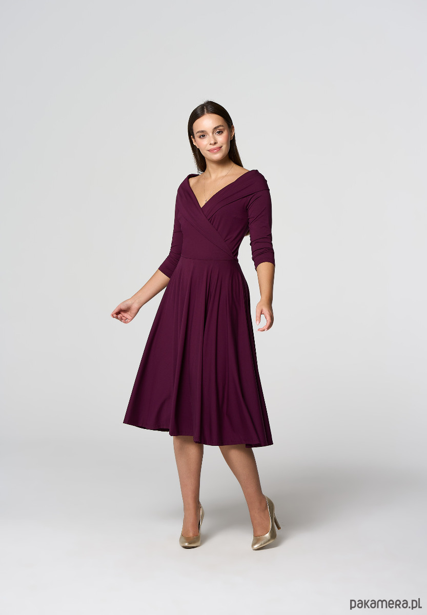 Sukienka midi z szalowym kołnierzem, dopasowana w tali i w biuście.