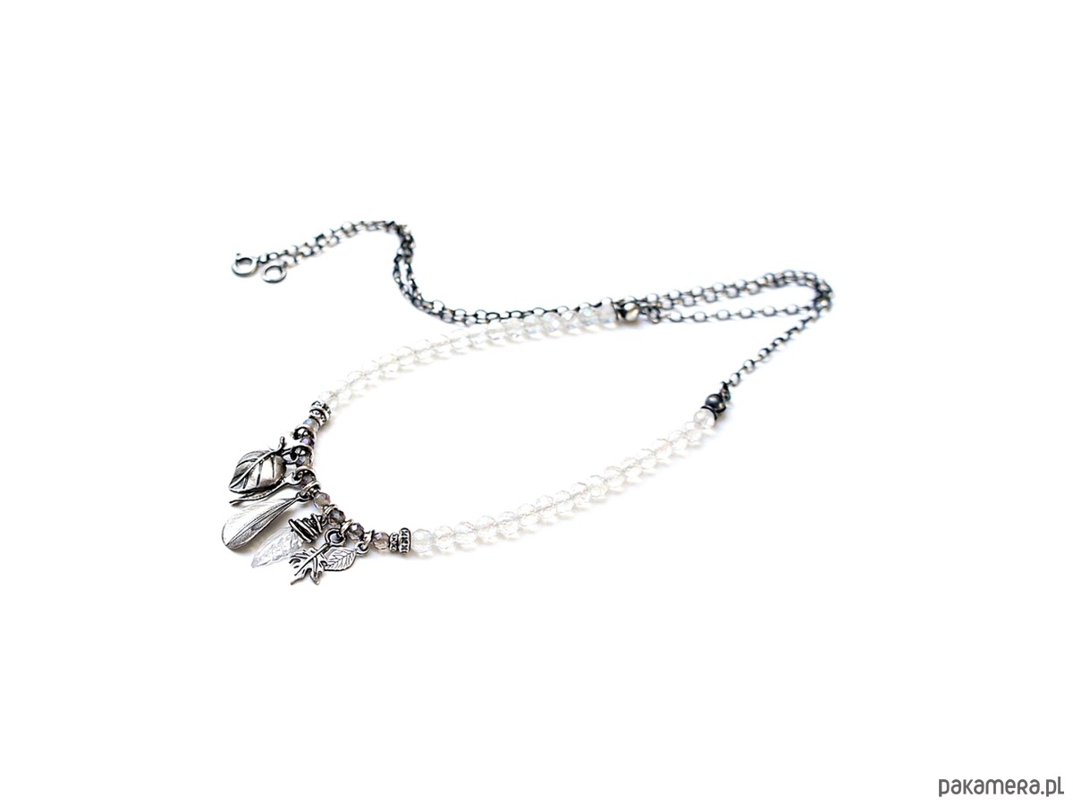 Naszyjnik wykonany ze srebra [pr. 925 ] w połączeniu z wysokiej jakości fasetowanymi topazami mystic [4mm], fasetowanymi spinelami z efektem mystic [3mm] oraz srebrnymi zawieszkami i listkiem z kamienia księżycowego. Długość naszyjnika 58cm. Srebro oksydowane i przetarte. Biżuteria ozdobnie zapakowana