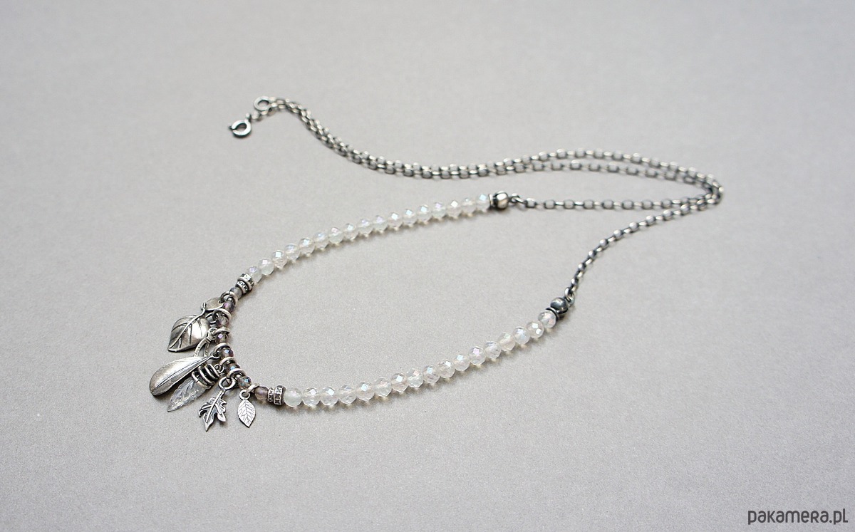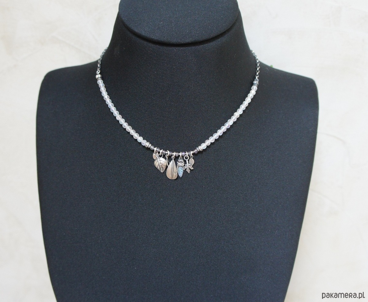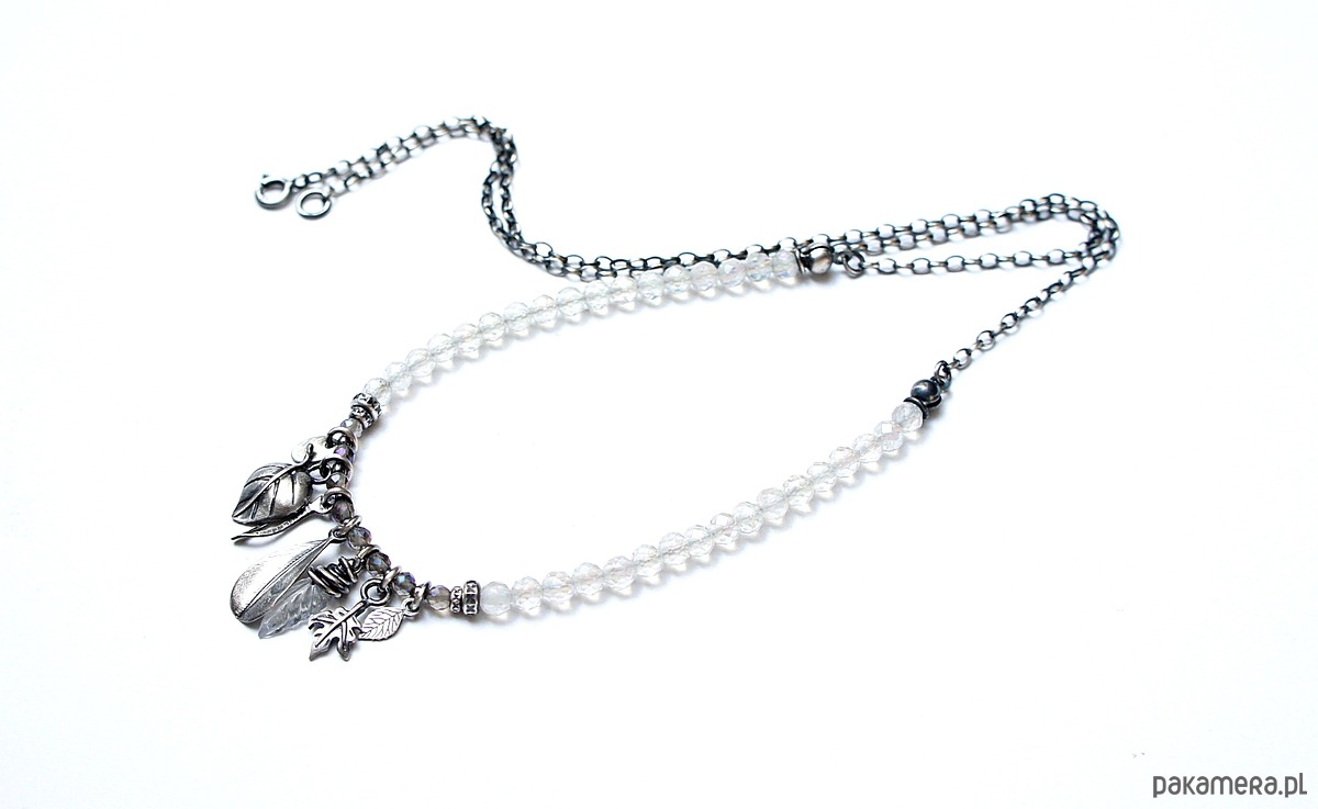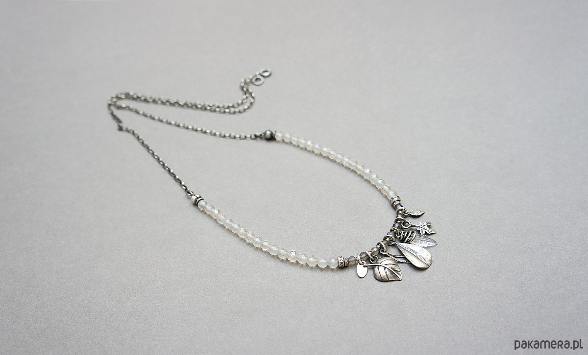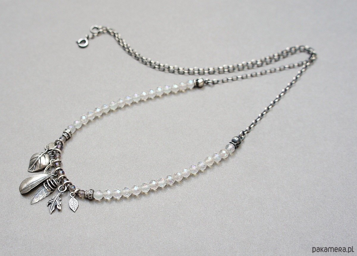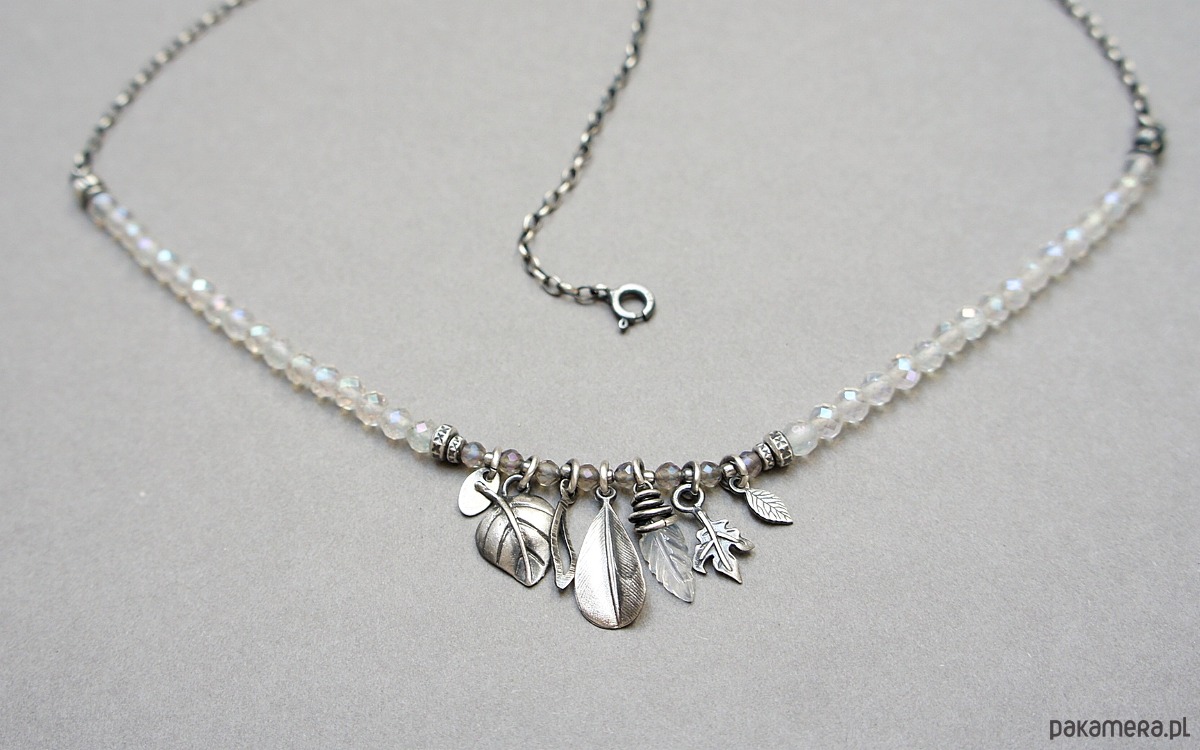 Naszyjnik wykonany ze srebra [pr. 925 ] w połączeniu z wysokiej jakości fasetowanymi topazami mystic [4mm], fasetowanymi spinelami z efektem mystic [3mm] oraz srebrnymi zawieszkami i listkiem z kamienia księżycowego. Długość naszyjnika 58cm. Srebro oksydowane i przetarte. Biżuteria ozdobnie zapakowana