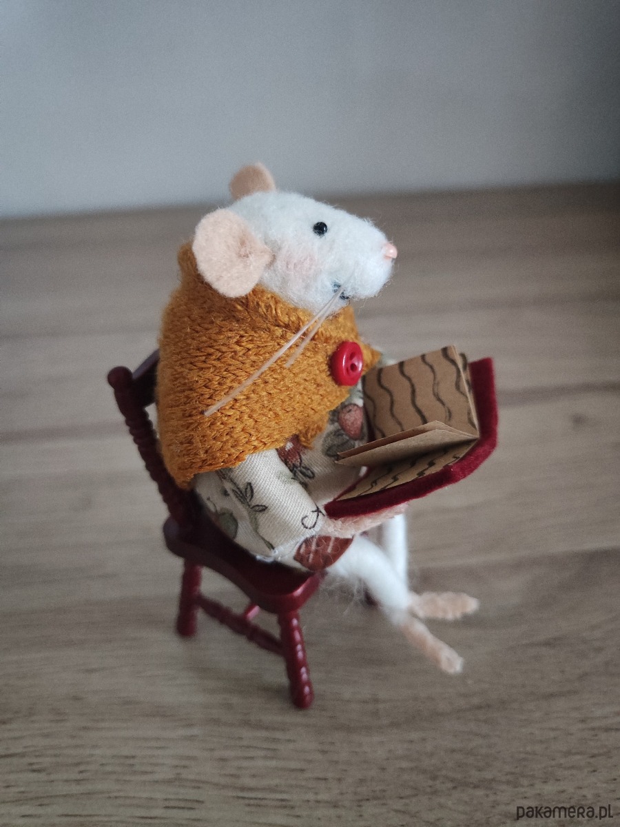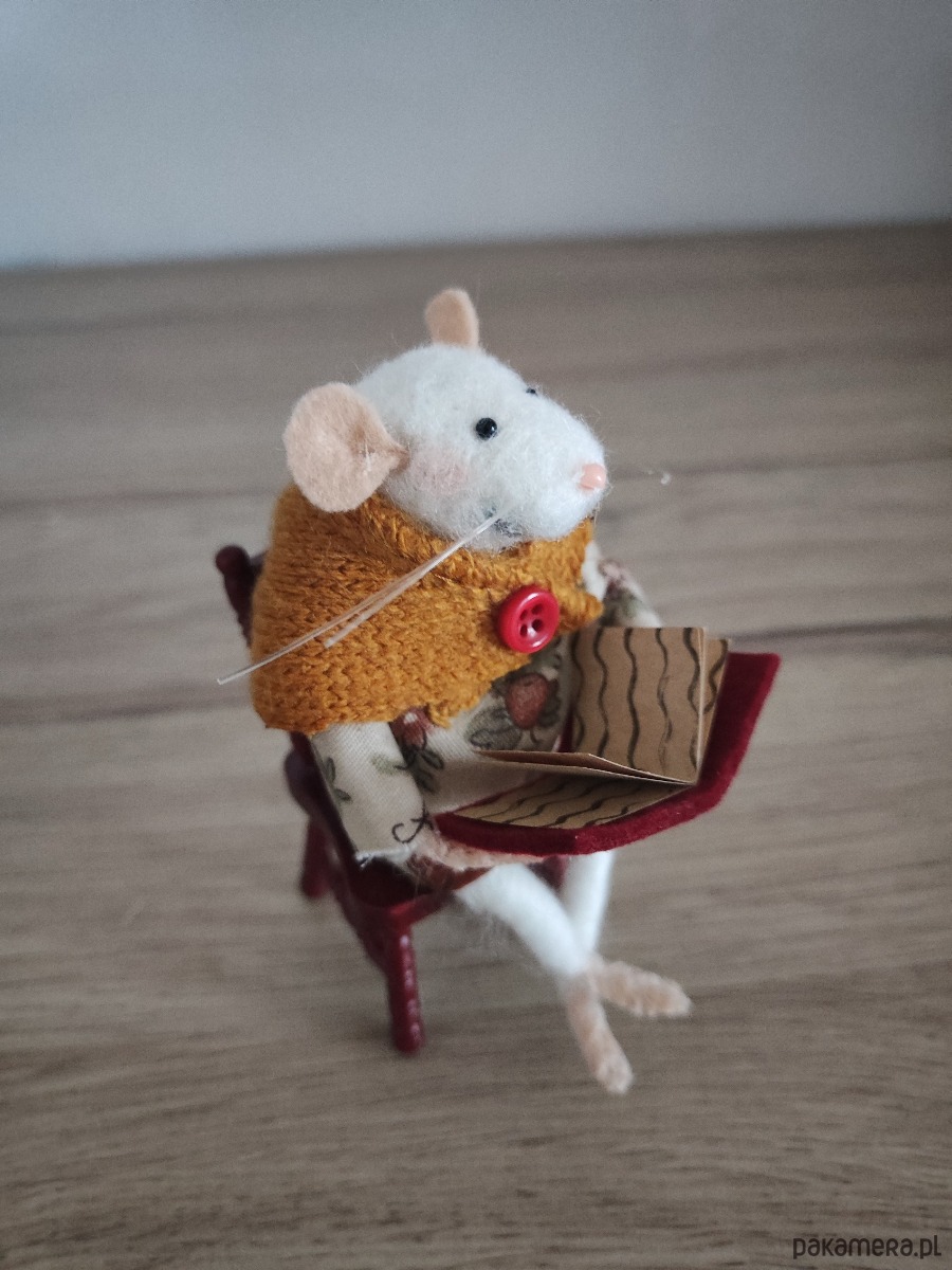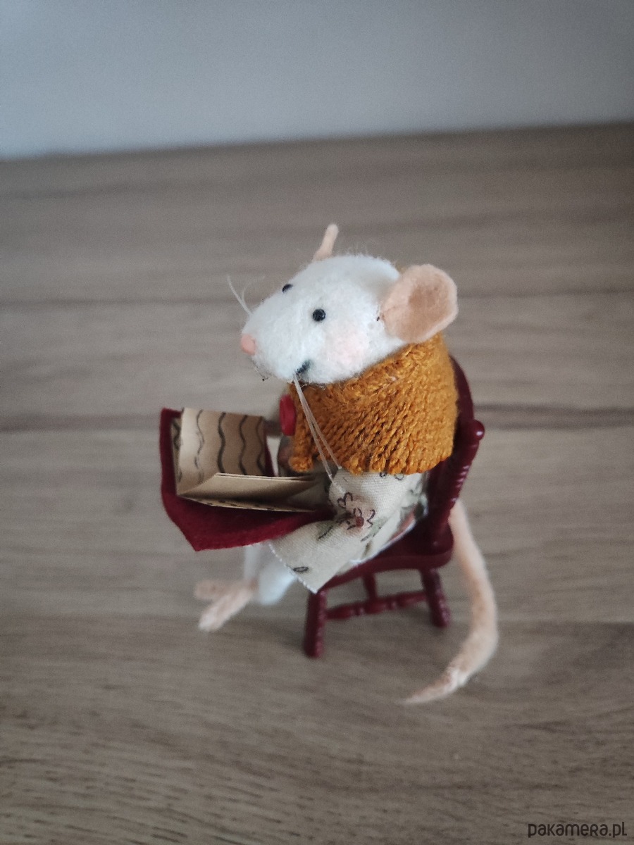 Sprzedam zrobioną przeze mnie myszkę z wełny czesankowej metodą filcowania na sucho. Myszka jest w pozycji siedzącej na drewnianym krześle. W całości jest zrobiona ręcznie , łącznie z uszytymi ubrankami.