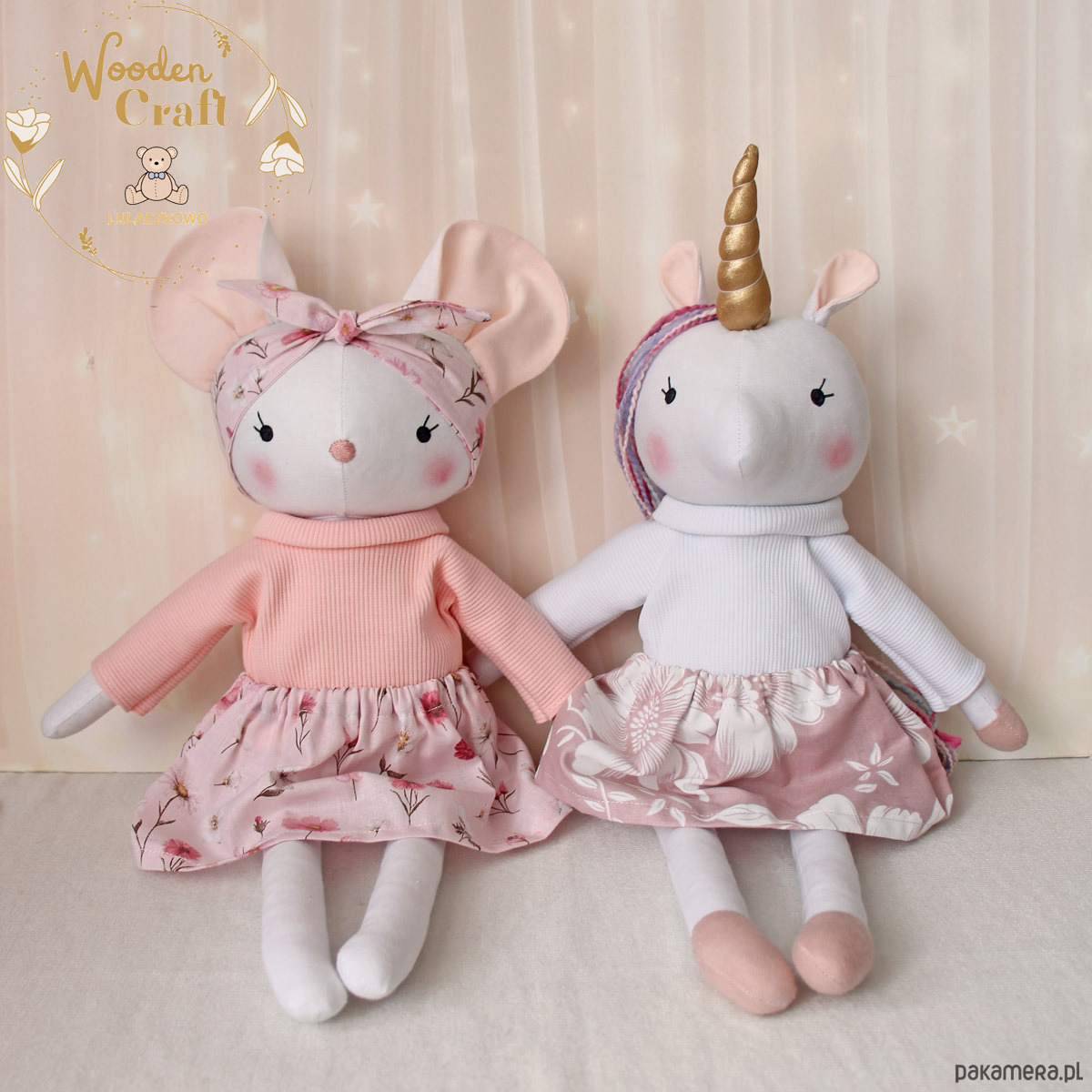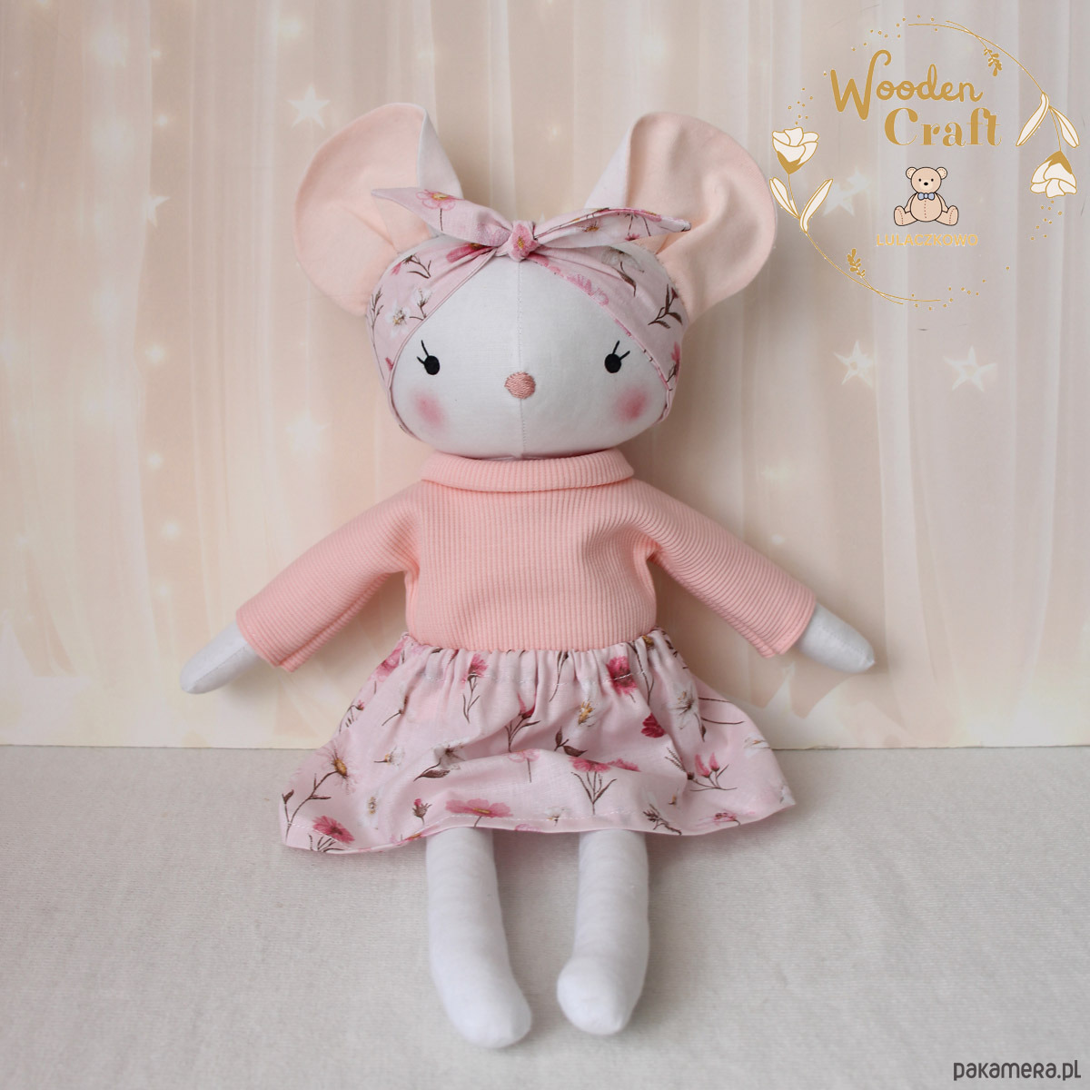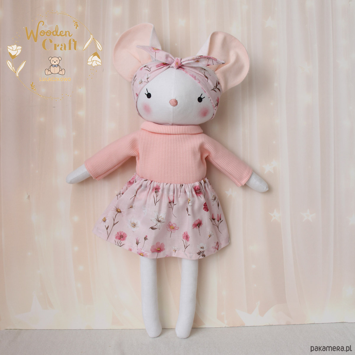 Przeurocza przytulanka, biała myszka, uszyta ręcznie z najwyższą starannością, ubrana w różowy sweterek w prążki, i różową, kwiatową spódniczkę oraz opaskę. Wykonana ze 100% bawełny, wypełniona antyalergiczną kulką silikonową. Oczka malowane wodoodpornym markerem, nosek wyszyty muliną. Spódniczkę i sweterek można swobodnie zdejmować, posiadają gumeczki. Górne i dolne łapki układają się luźno, myszka siedzi z podparciem.