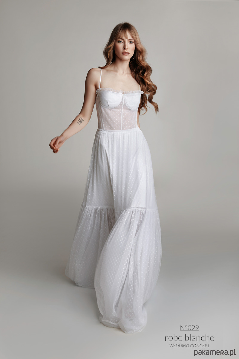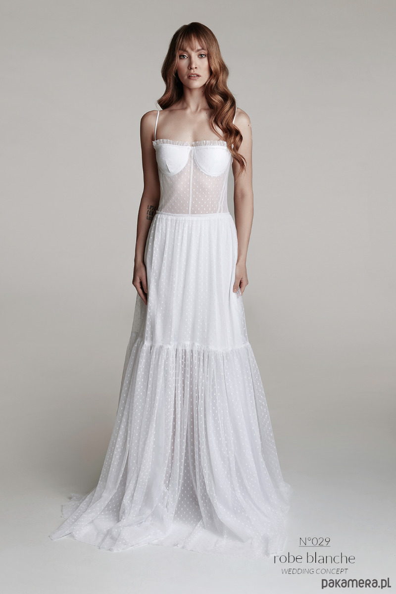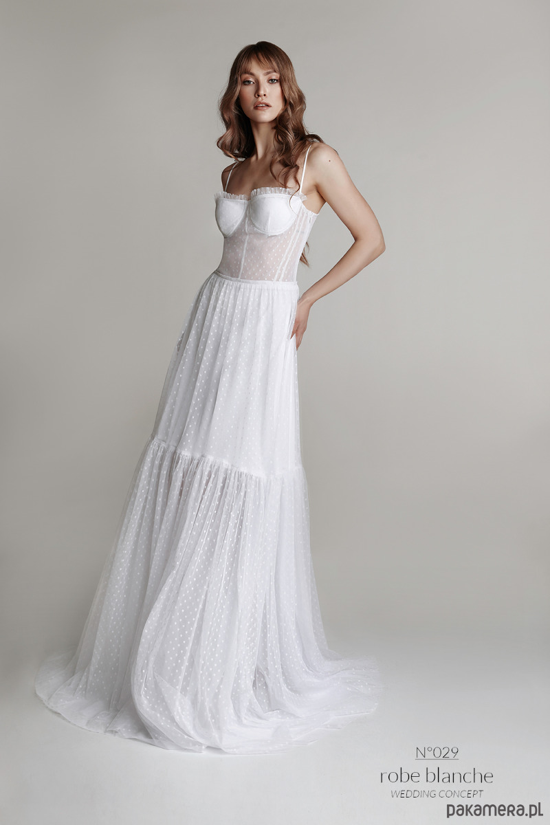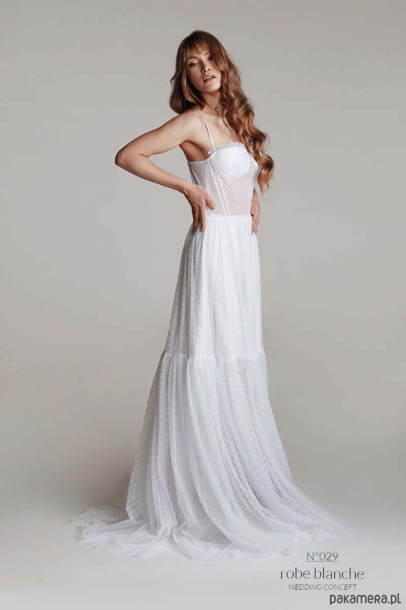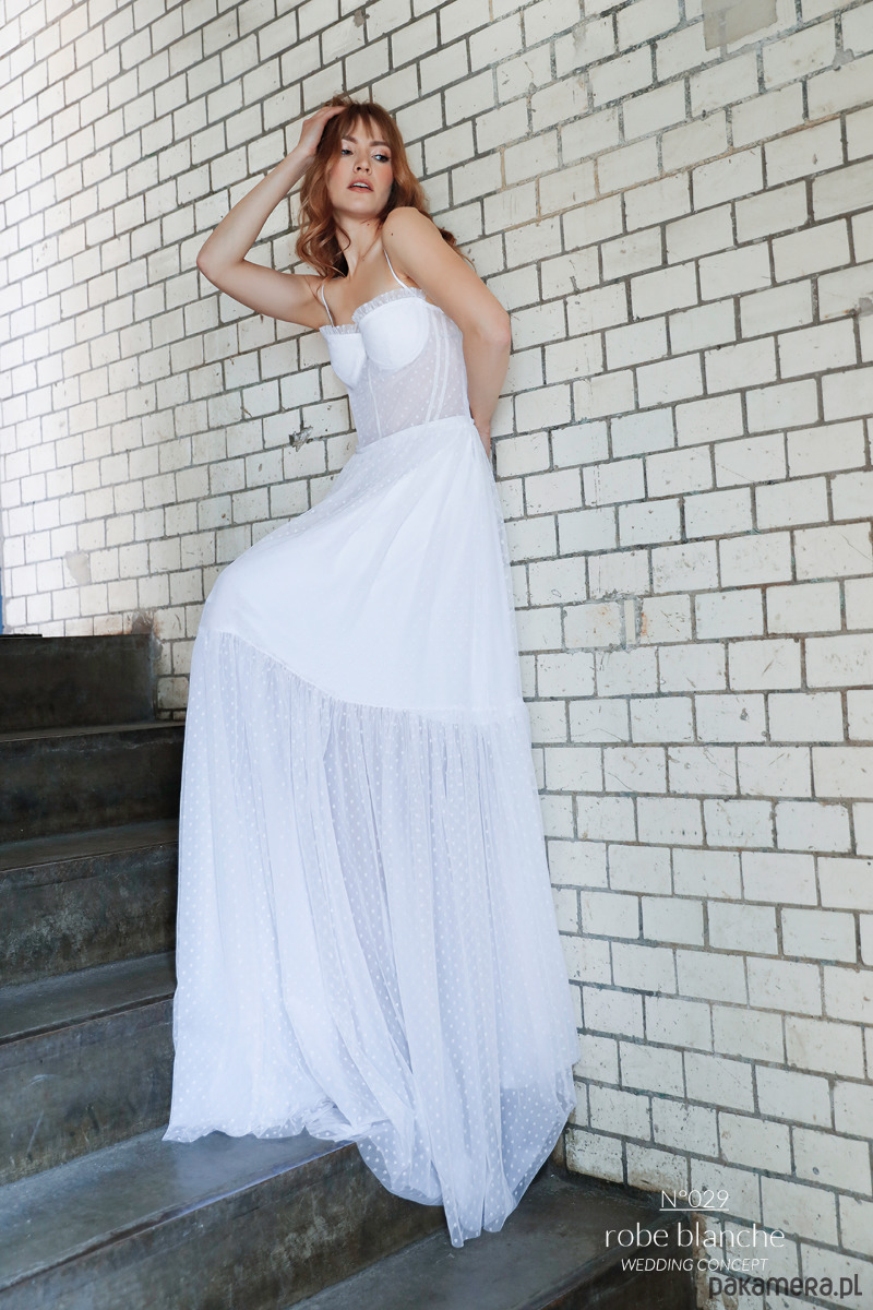 Niezwykle kobieca i romantyczna. Suknia wykonana z miękkiego tiulu o subtelnym wzorze. Ozdobą sukienki jest charakterystyczna ,,gorsetowa” góra z mnóstwem ozdobnych detali . Szeroka falbana u dołu nadaje sukni objętości i jest mocnym estetycznym akcentem. W celu zniwelowania transparentności wierzchniego materiału linia dekoltu wraz z spódnicą wykonane zostały na podszewce.