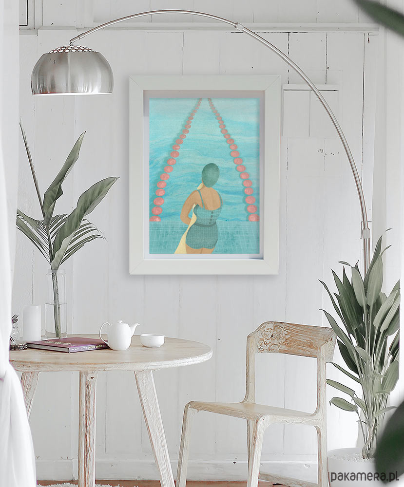 Plakat z autorską grafiką przedstawiający dziewczynę na basenie po zakończonym treningu. Grafika zaprojektowana przez pracownię Mayam posters.