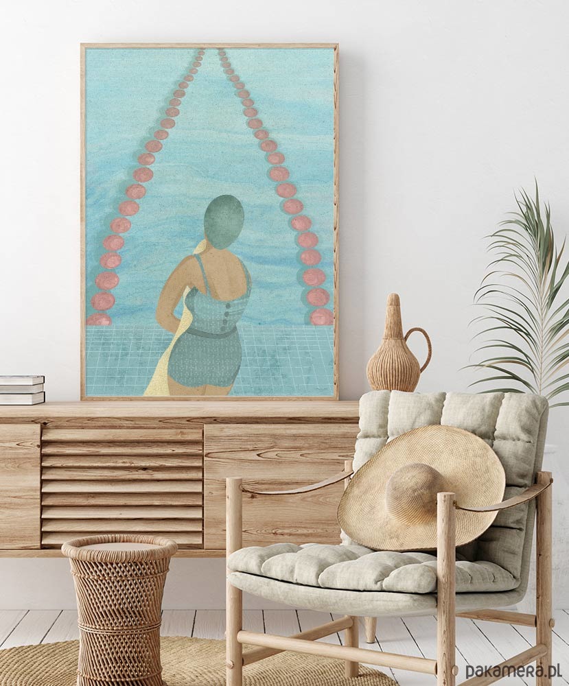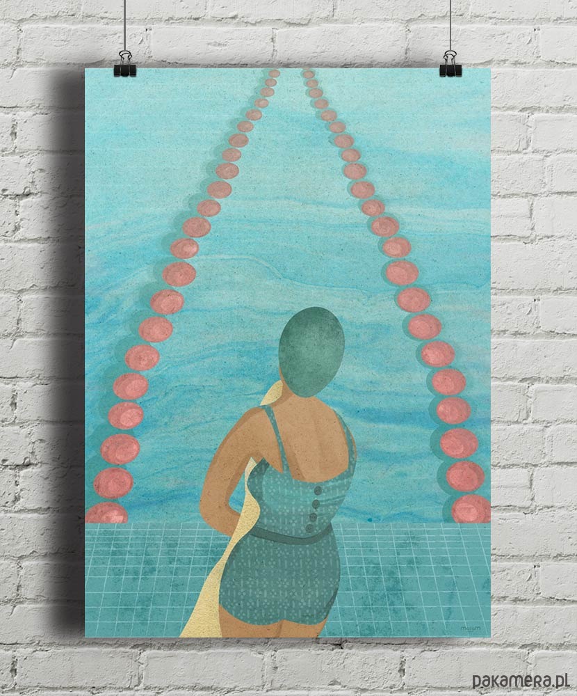 Plakat z autorską grafiką przedstawiający dziewczynę na basenie po zakończonym treningu. Grafika zaprojektowana przez pracownię Mayam posters.
