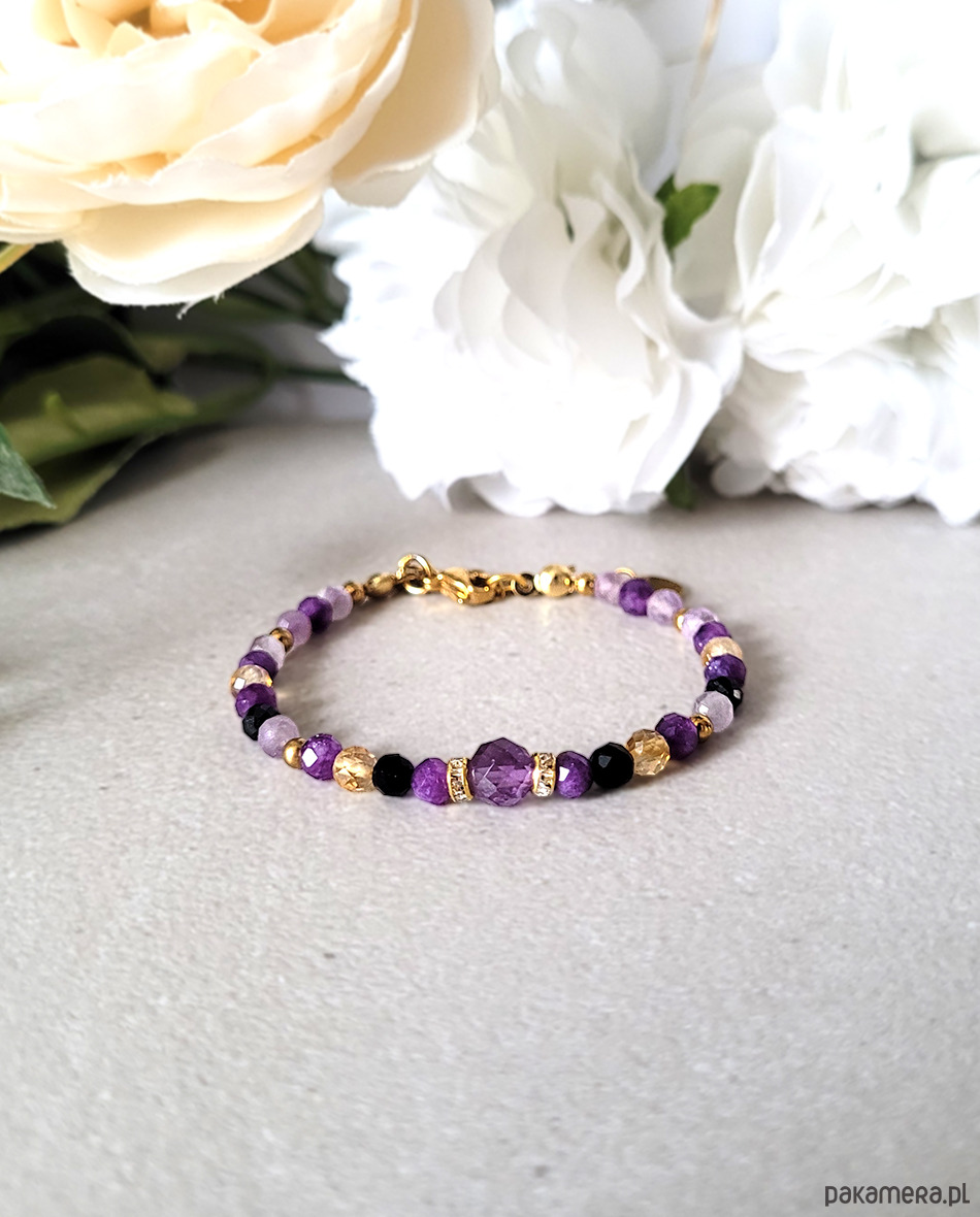 Przepiękna elegancka bransoletka zrobiona z kamieni naturalnych: Ametystu, Cytrynu, Turmalinu oraz Hematytu.