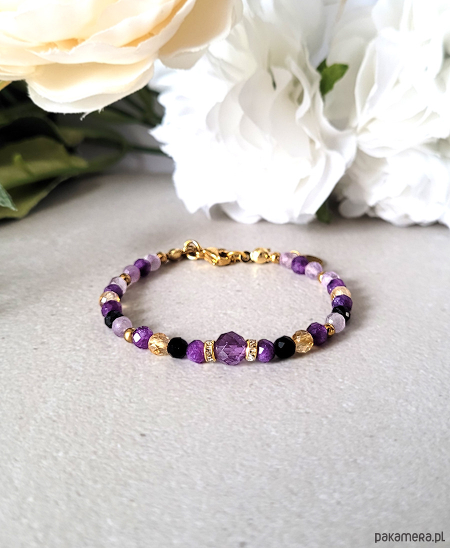 Przepiękna elegancka bransoletka zrobiona z kamieni naturalnych: Ametystu, Cytrynu, Turmalinu oraz Hematytu.