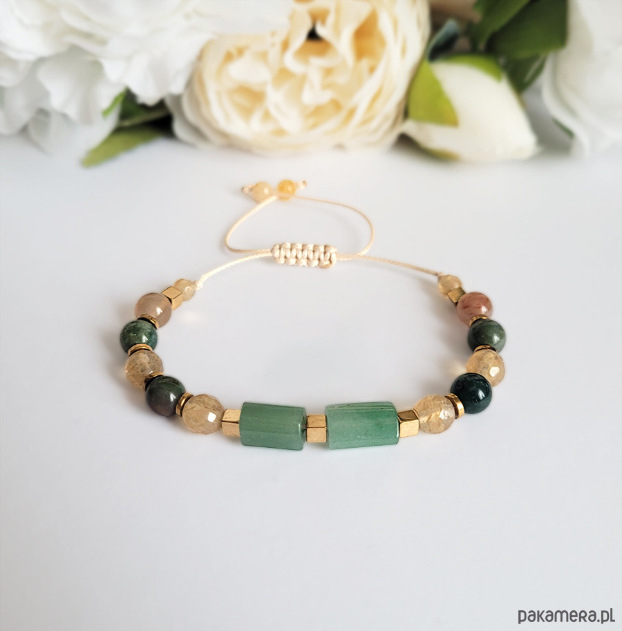 Piękna bransoletka zrobiona z kamieni naturalnych: Awenturynu, Cytrynu, Agatu Indyjskiego oraz Hematytu w kolorze złota.