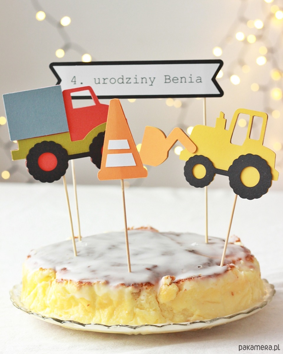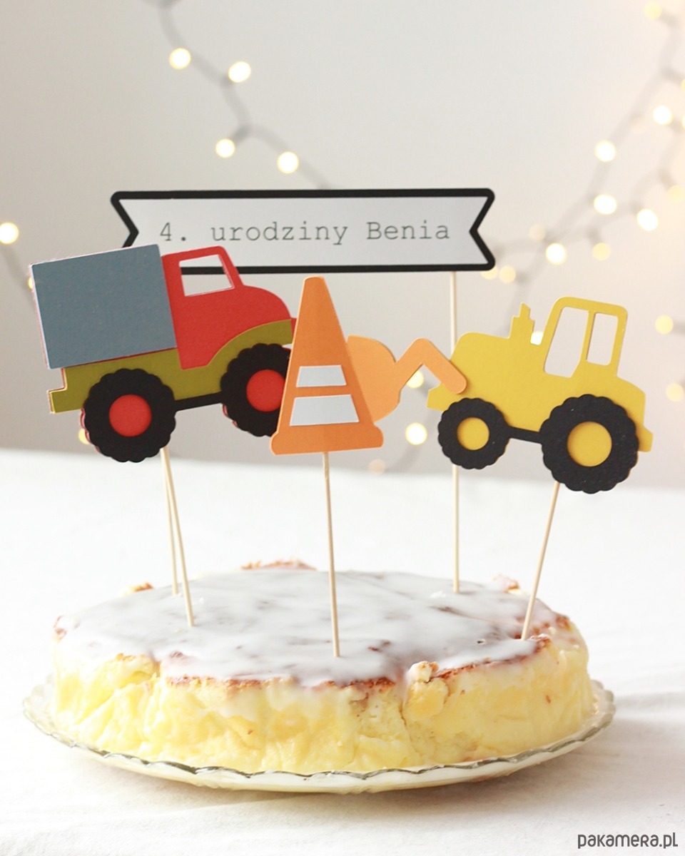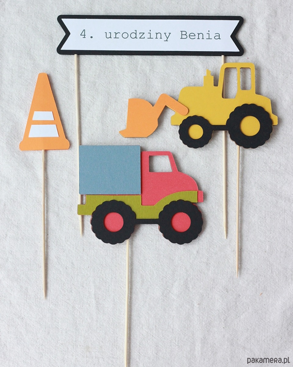 "Na budowie" - czyli topper na tort dla miłośników maszyn ciężkich. Żółta koparka i kolorowa wywrotka podbiją serca małych budowlańców.